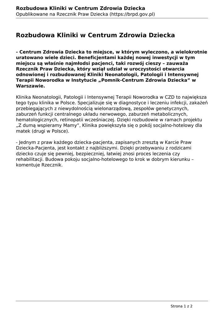 Rozbudowa Kliniki w Centrum Zdrowia Dziecka Opublikowane na Rzecznik Praw Dziecka (https://brpd.gov.pl) Rozbudowa Kliniki w Centrum Zdrowia Dziecka - Centrum Zdrowia Dziecka to miejsce, w którym wyleczono, a wielokrotnie uratowano wiele dzieci. Beneficjentami każdej nowej inwestycji w tym miejscu są właśnie najmłodsi pacjenci, taki rozwój cieszy – zauważa Rzecznik Praw Dziecka, który wziął udział w uroczystości otwarcia odnowionej i rozbudowanej Kliniki Neonatologii, Patologii i Intensywnej Terapii Noworodka w Instytucie „Pomnik-Centrum Zdrowia Dziecka” w Warszawie. Klinika Neonatologii, Patologii i Intensywnej Terapii Noworodka w CZD to największa tego typu klinika w Polsce. Specjalizuje się w diagnostyce i leczeniu infekcji, zakażeń przebiegających z niewydolnością wielonarządową, zespołów genetycznych, zaburzeń funkcji centralnego układu nerwowego, zaburzeń metabolicznych, hematologicznych, retinopatii wcześniaczej. Dzięki rozbudowie w ramach projektu „Z dumą wspieramy Mamy”, Klinika powiększyła się o pokój socjalno-hotelowy dla matek (drugi w Polsce). - Jednym z praw każdego dziecka-pacjenta, zapisanych zresztą w Karcie Praw Dziecka-Pacjenta, jest kontakt z najbliższymi. Dzięki przebywaniu z rodzicami dziecko czuje się pewniej, bezpieczniej, łatwiej znosi proces leczenia czy rehabilitacji. Budowa pokoju socjalno-hotelowego to krok w dobrym kierunku – komentuje Rzecznik. Strona 1 z 2 Rozbudowa Kliniki w Centrum Zdrowia Dziecka Opublikowane na Rzecznik Praw Dziecka (https://brpd.gov.pl) Udostępnij: Facebook [2] Google Plus [3] Twitter [4] Adres URL źródła: https://brpd.gov.pl/aktualnosci/rozbudowa-kliniki-w-centrumView the full image [1] zdrowia-dziecka Odnośniki: [1] https://brpd.gov.pl/sites/default/files/czd_1.jpg [2] http://facebook.com/sharer.php?u=https%3A%2F%2Fbrpd.gov.pl%2Faktualnosci %2Frozbudowa-kliniki-w-centrum-zdrowiadziecka&t=Rozbudowa%20Kliniki%20w%20Centrum%20Zdrowia%20Dziecka [3] https://plus.google.com/share?url=https%3A%2F%2Fbrpd.gov.pl%2Faktualnosci %2Frozbudowa-kliniki-w-centrum-zdrowia-dziecka [4] http://twitter.com/intent/tweet?url=https%3A%2F%2Fbrpd.gov.pl%2Faktualnosci %2Frozbudowa-kliniki-w-centrum-zdrowia-dziecka&text=Rozbudowa%20Kliniki %20w%20Centrum%20Zdrowia%20Dziecka Strona 2 z 2