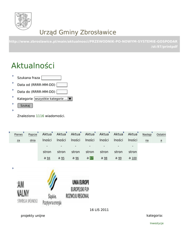 Urząd Gminy Zbrosławice http://www.zbroslawice.pl/main/aktualnosci/PRZEWODNIK-PO-NOWYM-SYSTEMIE-GOSPODAR /st:97/printpdf Aktualności Szukana fraza Data od (RRRR-MM-DD) Data do (RRRR-MM-DD) Kategorie wszystkie kategorie ... ▼ Szukaj Znaleziono 1116 wiadomości. Pierws Poprze Aktua Aktua Aktua Aktua Aktua Aktua Aktua Następ Ostatni za dnia lności lności lności lności lności lności lności na a - - - - - - - stron stron stron stron stron stron stron a 94 a 95 a 96 a a 98 a 99 a 100 97 16 LIS 2011 projekty unijne kategoria: Inwestycje Regionalny Program Operacyjny Województwa Śląskiego – realna odpowiedź na realne potrzeby Kompleksowa termomodernizacja szkół podstawowych w Czekanowie i Ziemięcicach Nazwa Beneficjenta: Gmina Zbrosławice wartość projektu: 748 537,93 wartość dofinansowania: 636 257,15 Projekt współfinansowany przez Unię Europejską z Europejskiego Funduszu Rozwoju Regionalnego w ramach Regionalnego Programu Operacyjnego 14 LIS 2011 kategoria: Turniej Skata o puchar Wójta Gminy Zbrosławice Sport 10 grudnia 2011 r. o godz. 9:00, w świetlicy w Ziemięcicach odbędzie się Turniej Skata o puchar Wójta Gminy Zbrosławice. Chętnych prosimy o zgłaszanie się do p. Alojzego Szyguły 32/233 69 07 lub 601 433 951 do 8 grudnia 2011 r. 14 LIS 2011 OGŁOSZENIE Wójta Gminy Zbrosławice kategoria: Komunikaty urzędowe OGŁOSZENIE Wójta Gminy Zbrosławice o przyjęciu dokumentu wymagającego udziału społeczeństwa i o możliwościach zapoznania się z jego treścią Na podstawie art. 43 ustawy z dnia 3 października 2008 r. o udostępnianiu informacji o środowisku i jego ochronie, udziale społeczeństwa w ochronie środowiska oraz o ocenach oddziaływania na środowisko (Dz. U. nr 199 poz.1227 z późniejszymi zmianami) zawiadamiam o przyjęciu 08 LIS 2011 kategoria: Konkurs Gumowy Surowiec Inne Wystartowała II edycja ogólnopolskiego konkursu Gumowy Surowiec. W tej edycji również czeka na Was wiele ciekawych wyzwań m. in. przeprowadzenie wywiadu środowiskowego wśród lokalnej społeczności, zlokalizowanie nielegalnych wysypisk zużytych opon, przeprowadzenie kampanii informacyjno - promocyjnej. A wszystko po to, aby zrobić coś dobrego dla środowiska. żródło: www.gumowysurowiec.pl 07 LIS 2011 27.11.2011r. Występ "Kabaretu Młodych Panów" kategoria: Edukacja i Kultura W dniu 27.11.2011r. (niedziela) o godz. 17.00 w Świetlicy Gminnej w Wieszowie wystąpi Kabaret Młodych Panów. Bilety w cenie 25zł można nabyć w Centrum Usług Publicznych w Zbrosławicach ul. Oświęcimska 2a, lub też zamówić pod numerem tel. 501 691 489 lub mejlowo pisząc na adres: serafi[email protected] . Źródło + więcej informacji www.imprezy.wieszowa.pl/ 04 LIS 2011 kategoria: INFORMACJA O AKCJI ZIMA 2011/2012 Komunikaty urzędowe Koordynatorem oraz osobą nadzorującą prowadzoną Akcję Zima na drogach gminnych jest Kierownik Referatu Gospodarki Komunalnej i Inwestycji Janusz Kołodziejczyk (tel. 728 319 327) oraz Inspektor Jakub Kukliński (tel. 604 417 895). Generalnym Wykonawcą jest Zakład Gospodarki Komunalnej i Mieszkaniowej z siedzibą w Zbrosławicach przy ul. Oświęcimskiej 6. Dyżury Akcji Zimowej 28 PAŹ 2011 Zespół "Karolinka" w Uttenreuht kategoria: Edukacja i Kultura Wielkim wyróżnieniem dla Zespołu wokalnego ,,Karolinka'' Szkoły Podstawowej w Przezchlebiu było zaproszenie przez władze samorządowe Uttenreuht – Erlangen miasta partnerskiego powiatu Tarnogórskiego w dniach od 06.10.2011r. do 10. 10. 2011r. na uroczyste obchody 60 - lecia kultury śląskiej. Przygotowania do wyjazdu trwały kilka miesięcy. Dzięki pozyskanym funduszom przy współpracy z DFK w Raciborzu zostały uszyte piękne stroje 27 PAŹ 2011 kategoria: Kontrola ruchu drogowego Komunikaty urzędowe Z dniem 2 listopada 2011r Straż Gminna w Zbrosławicach wprowadza kontrolę ruchu drogowego w zakresie pomiaru przekroczenia dozwolonej prędkości jazdy na oznaczonych odcinkach na terenie Gminy Zbrosławice. 26 PAŹ 2011 Harmonogram Kontroli Sołectwa Jasiona kategoria: Komunikaty urzędowe W sołectwie Jasiona w dniach od 08.11.2011r. do 21.01.2012r. będzie przeprowadzona kontrola z zakresu przestrzegania przepisów dotyczących posiadania pojemników na nieczystości stałych oraz wywozu nieczystości płynnych z „szamba”.Uprasza się właścicieli nieruchomości o przygotowanie odpowiednich dokumentów aby kontrola przeszła sprawnie: umowy na wywóz odpadów komunalnych, dowodów zapłaty za wywóz odpadów 19 PAŹ 2011 kategoria: KOMUNIKAT Sztab kryzysowy Wójt Gminy Zbrosławice informuje, że w dniu 20 października 2011 r. o godzinie 12.00 zostanie przeprowadzony wojewódzki test sprawności syren alarmowych wykorzystywanych w systemie ostrzegania i alarmowania ludności. W ramach testu uruchomione zostaną syreny alarmowe emitujące dźwięk ciągły, trwający trzy minuty - oznaczający odwołanie alarmów: powietrznego i o skażeniach. Pierws Poprze Aktua Aktua Aktua Aktua Aktua Aktua Aktua Następ Ostatni za dnia lności lności lności lności lności lności lności na a - - - - - - - stron stron stron stron stron stron stron a 94 a 95 a 96 a a 98 a 99 a 100 97