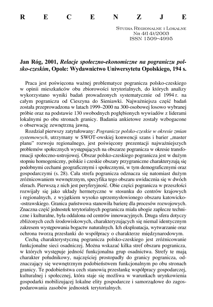 R E C E N Z J E Studia Regionalne i Lokalne Nr 4(14)/2003 ISSN 1509–4995 Jan Róg, 2001, Relacje społeczno-ekonomiczne na pograniczu polsko-czeskim, Opole: Wydawnictwo Uniwersytetu Opolskiego, 194 s. Praca jest poświe˛cona ważnej problematyce pogranicza polsko-czeskiego w opinii mieszkańców obu zbiorowości terytorialnych, do których analizy wykorzystano wyniki badań prowadzonych systematycznie od 1994 r. na całym pograniczu od Cieszyna do Sieniawki. Najważniejsza cze˛ść badań została przeprowadzona w latach 1999–2000 na 300-osobowej losowo wybranej próbie oraz na podstawie 130 swobodnych pogłe˛bionych wywiadów z liderami lokalnymi po obu stronach granicy. Badania ankietowe zostały wzbogacone o obserwacje˛ zewne˛trzna˛ jawna˛. Rozdział pierwszy zatytułowany: Pogranicze polsko-czeskie w okresie zmian systemowych, utrzymany w SWOT-owskiej konwencji szans i barier „master planu” rozwoju regionalnego, jest poświe˛cony prezentacji najważniejszych problemów społecznych wyste˛puja˛cych na obszarze pogranicza w okresie transformacji społeczno-ustrojowej. Obszar polsko-czeskiego pogranicza jest w dużym stopniu homogeniczny, polskie i czeskie obszary przygraniczne charakteryzuja˛ sie˛ podobnymi cechami geograficznymi i społecznymi, w tym demograficznymi oraz gospodarczymi (s. 28). Cała strefa pogranicza odznacza sie˛ natomiast dużym zróżnicowaniem wewne˛trznym, specyfika tego obszaru uwidacznia sie˛ w dwóch sferach. Pierwsza˛ z nich jest peryferyjność. Obie cze˛ści pogranicza w przeszłości rozwijały sie˛ jako układy hermetyczne w stosunku do centrów krajowych i regionalnych, z wyja˛tkiem wysoko uprzemysłowionego obszaru katowicko-ostrawskiego. Granica państwowa stanowiła bariere˛ dla procesów rozwojowych. Znaczna cze˛ść jednostek terytorialnych pogranicza miała ubogie zaplecze techniczne i kulturalne, była oddalona od centrów innowacyjnych. Druga sfera dotyczy zbliżonych cech środowiskowych, charakteryzuja˛cych sie˛ niemal identycznym zakresem wyste˛powania bogactw naturalnych. Ich eksploatacja, wytwarzanie oraz ochrona tworza˛ przesłanki do współpracy o charakterze mie˛dzynarodowym. Cecha˛ charakterystyczna˛ pogranicza polsko-czeskiego jest zróżnicowanie funkcjonalne sieci osadniczej. Można wskazać kilka stref obszaru pogranicza, w których wyste˛puje jedność funkcjonalna grup osadnictwa. Strefy te maja˛ charakter południkowy, najcze˛ściej prostopadły do granicy pogranicza, odznaczaja˛cy sie˛ wewne˛trznym podobieństwem funkcjonalnym po obu stronach granicy. Te podobieństwa cech stanowia˛ przesłanke˛ współpracy gospodarczej, kulturalnej i społecznej, która staje sie˛ możliwa w warunkach urynkowienia gospodarki mobilizuja˛cej lokalne elity gospodarcze i samorza˛dowe do zagospodarowania zasobów jednostek terytorialnych. 140 RECENZJE Analiza demograficzna badanego obszaru ujawnia niepowtarzalność i odre˛bność procesów ludnościowych, w tym przede wszystkim głe˛bokie deformacje demograficzne, takie jak m.in. masowe migracje ze wsi do miast, wyludnienie wielu jednostek osadniczych, niska ge˛stość zaludnienia w niektórych gminach, dysproporcje w rozwoju sieci osadniczej czy wreszcie wewne˛trzne i zewne˛trzne ruchy migracyjne. Zmiany struktury ludności obszarów przygranicznych sa˛ efektem poszczególnych faz rozwoju gospodarczego. Analiza zmian ludnościowych na pograniczu polsko-czeskim wskazuje na segmentacje˛ strefy przygranicznej oraz zarysowuja˛cy sie˛ kryzys demograficzny badanych obszarów. Wpływaja˛ na to wyższa od stopy przyrostu naturalnego migracja ludności, wyludnianie sie˛ miast, spadek liczby urodzeń, wzrost umieralności, proces starzenia sie˛ ludności wsi, wysokie bezrobocie oraz rosna˛ce ubóstwo (s. 34). W rozważaniach dotycza˛cych barier i szans w rozwoju polsko-czeskiego pogranicza ważna˛ role˛ odgrywaja˛ stereotypy odzwierciedlaja˛ce mie˛dzygrupowe stosunki i relacje mie˛dzy przedstawicielami sa˛siedzkich grup narodowych. Wyniki badań potwierdzaja˛ negatywny stereotyp sa˛siada wyste˛ puja˛cy zarówno w społeczeństwie polskim, jak i czeskim. Wśród negatywnych cech Polaków w opinii Czechów dominuja˛: 1) cwaniactwo, 2) gburowatość, brak kultury, hałaśliwość oraz 3) brak tolerancji. Natomiast w opinii Polaków Czesi to ludzie: 1) tchórzliwi, 2) nieche˛tni Polakom, 3) fałszywi. Negatywnym stereotypom sa˛siada odpowiada pozytywny stosunek badanych do wymiany i współpracy przygranicznej (s. 45), charakterystyczny po obu stronach granicy głównie dla przedstawicieli średniego i młodego pokolenia. Autor, nawia˛zuja˛c do amerykańskich badań stereotypów, doszukuje sie˛ przyczyn dominacji negatywnych wartości stereotypu w kanonie wzorca osobowości nietolerancyjnej. Możliwościom kreowania pozytywnym stereotypów sprzyja funkcja komunikacji mie˛dzykulturowej pogranicza. Pogranicze z charakterystyczna˛ dla niego otwartościa˛ na odmienności kulturowe tworzy warunki dla współwyste˛powania w świadomości jednostek dwóch ojczyzn: prywatnej i ideologicznej (s. 48). Wśród młodzieży szkolnej obszaru pogranicza polsko-czeskiego przeważa samookreślenie narodowe w stosunku do identyfikacji regionalnej oraz europejskiej i ogólnoświatowej (s. 49). Młodzież pogranicza polsko-czeskiego ma zdecydowanie pozytywny stosunek do integracji europejskiej, kojarza˛c ja˛ z wolnościa˛ podróżowania oraz szybkim wzrostem zarobków, przestrzeganiem praw człowieka w opinii Polaków i wie˛kszymi szansami na realizacje˛ celów osobistych w pogla˛dach młodych Czechów. Do najwie˛kszych zagrożeń, które niesie proces integracji, należa˛ zdaniem młodzieży: zły stan środowiska przyrodniczego (59,90%), agresja i terroryzm (53,80%), bezrobocie (40,80%), problemy finansowe i kryzys gospodarczy (21,80%) oraz AIDS (20,40%). Autor zwraca uwage˛ na rozbieżności ocen po obu stronach granicy dotycza˛cych bez