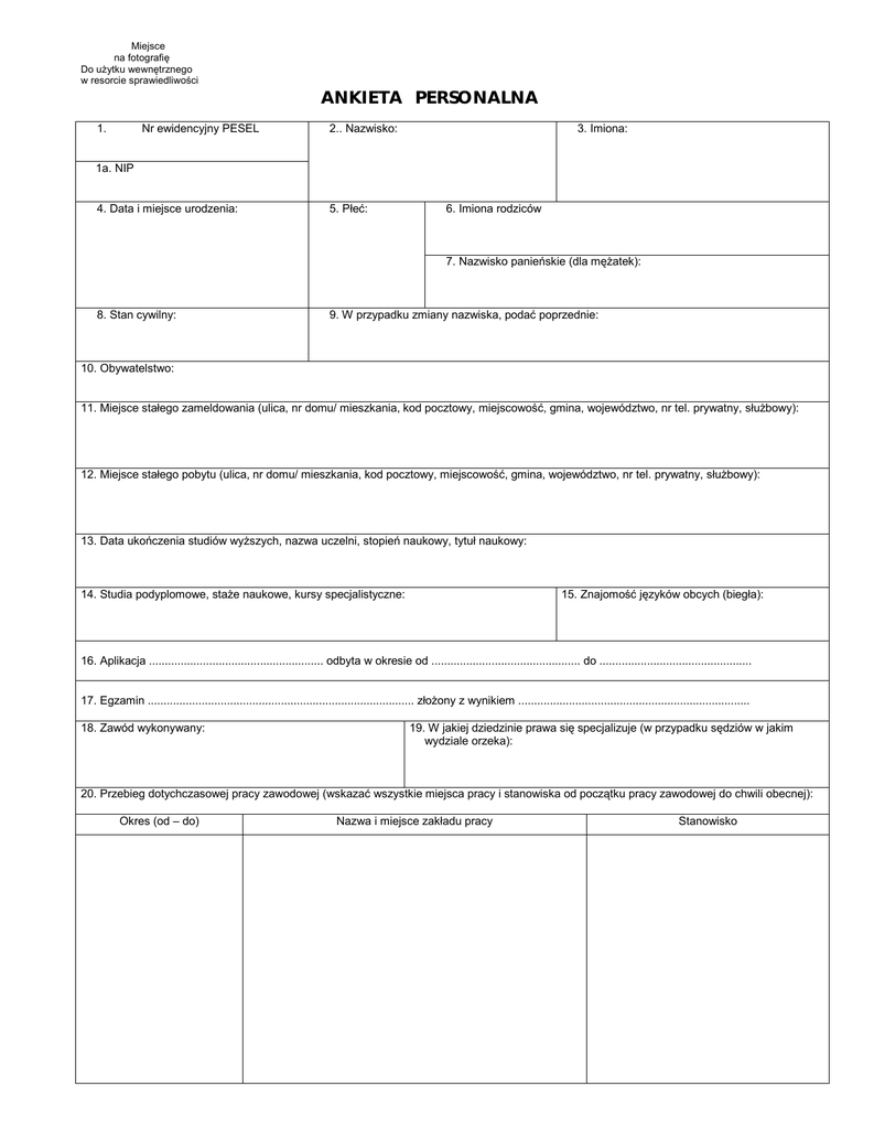 Miejsce na fotografię Do użytku wewnętrznego w resorcie sprawiedliwości ANKIETA PERSONALNA 1. Nr ewidencyjny PESEL 2.. Nazwisko: 3. Imiona: 1a. NIP 4. Data i miejsce urodzenia: 5. Płeć: 6. Imiona rodziców 7. Nazwisko panieńskie (dla mężatek): 8. Stan cywilny: 9. W przypadku zmiany nazwiska, podać poprzednie: 10. Obywatelstwo: 11. Miejsce stałego zameldowania (ulica, nr domu/ mieszkania, kod pocztowy, miejscowość, gmina, województwo, nr tel. prywatny, służbowy): 12. Miejsce stałego pobytu (ulica, nr domu/ mieszkania, kod pocztowy, miejscowość, gmina, województwo, nr tel. prywatny, służbowy): 13. Data ukończenia studiów wyższych, nazwa uczelni, stopień naukowy, tytuł naukowy: 14. Studia podyplomowe, staże naukowe, kursy specjalistyczne: 15. Znajomość języków obcych (biegła): 16. Aplikacja ....................................................... odbyta w okresie od ............................................... do ................................................ 17. Egzamin .................................................................................... złożony z wynikiem ......................................................................... 18. Zawód wykonywany: 19. W jakiej dziedzinie prawa się specjalizuje (w przypadku sędziów w jakim wydziale orzeka): 20. Przebieg dotychczasowej pracy zawodowej (wskazać wszystkie miejsca pracy i stanowiska od początku pracy zawodowej do chwili obecnej): Okres (od – do) Nazwa i miejsce zakładu pracy Stanowisko 21. Dodatkowe zatrudnienie (zajęcie): 22. Karalność (czy był karany, za co, kiedy, na jaką karę i przez jaki sąd): a) sądowa: ................................................................................................................................................................. ....................................................................................................................................................................................... b) dyscyplinarna: ....................................................................................................................................................... ........................................................................................................................................................................................ c) czy było prowadzone przeciwko niemu postępowanie karno-sądowe: .................................................................. ........................................................................................................................................................................................ 23. Powszechny obowiązek obrony: a) stosunek do powszechnego obowiązku obrony .................................................................................................... b) stopień wojskowy .................................................................................................................................................. c) przynależność ewidencyjna do WKU .................................................................................................................... d) przydział mobilizacyjny do Sił Zbrojnych RP ......................................................................................................... e) numer książeczki wojskowej……………………………………………………………………………………….....….. 24. Oświadczam, że pozostaję/nie pozostaję* w rejestrze bezrobotnych i poszukujących pracy: *niepotrzebne skreślić 25.Osoba, która należy zawiadomić w przypadku nieszczęśliwego wypadku losowego……………………....................... …………………………………………………………………………………………………………………………………………… 26.Oświadczam,że dane zawarte w rubryce Nr 1, 2, 3 , 4, 6 i 11 są zgodne z dowodem osobistym seria……………….. Numer…………………………… ………….wydanym przez…………………………………………………………………. Legnica, dnia ................................................. ... Stwierdzam własnoręcznym podpisem prawdziwość powyższych danych ............................................................... ........................................................................................................... (podpis pracownika kadr przyjmującego ankietę i data przyjęcia) Uwagi: 1. 2. 3. 4. Na pytania należy odpowiadać wyczerpująco, pisać czytelnie. Jeśli odpowiedź na którekolwiek pytanie nie mieści się w rubryce, należy podać ją na oddzielnym arkuszu ze stosownym odnośnikiem. Do ankiety należy załączyć własnoręcznie napisany życiorys oraz aktualne zdjęcie. O każdej zmianie stanu faktycznego podanego w powyższej ankiecie, należy niezwłocznie zawiadomić pisemnie właściwą komórkę kadrową – komórka ta ma obowiązek przekazania informacji do Departamentu Kadr w Ministerstwie Sprawiedliwości. MS/Ksr 36 – Ankieta personalna