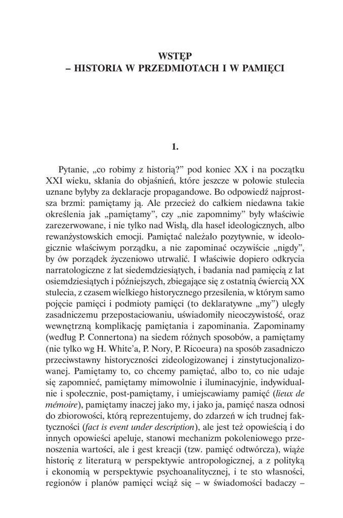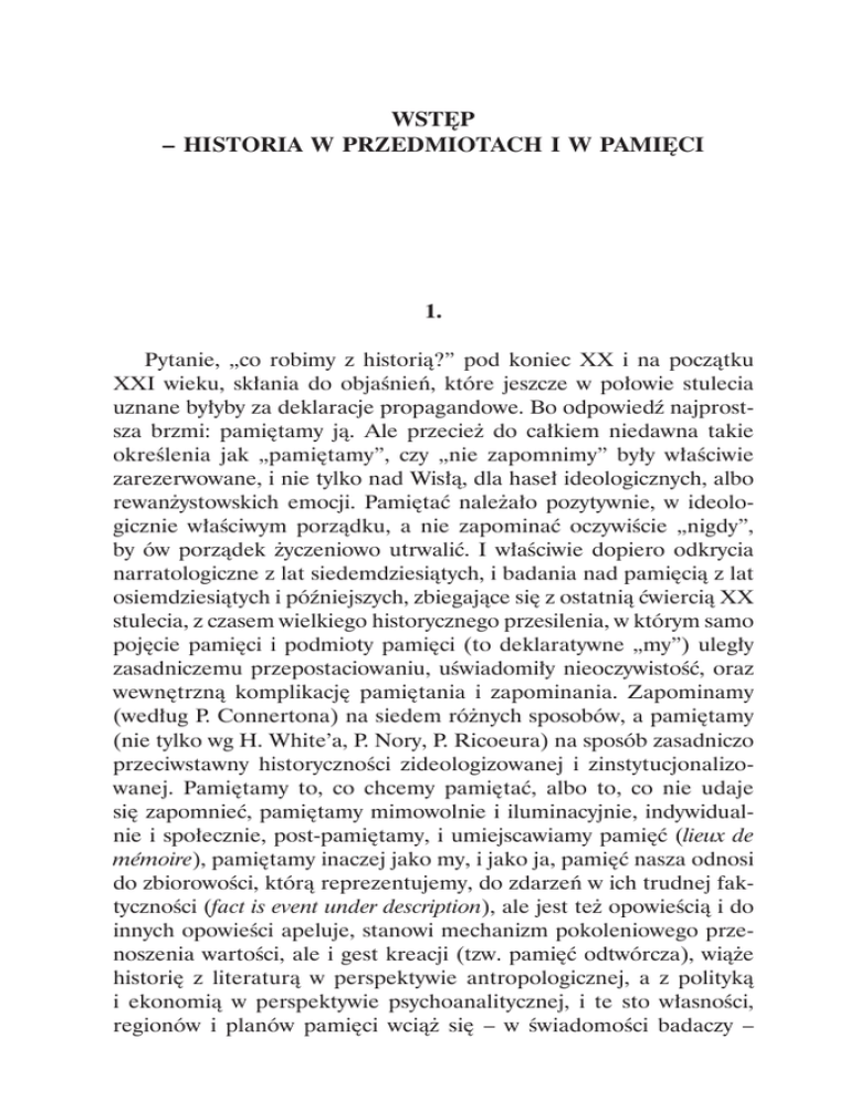 WSTĘP – HISTORIA W PRZEDMIOTACH I W PAMIĘCI 1. Pytanie, „co robimy z historią?” pod koniec XX i na początku XXI wieku, skłania do objaśnień, które jeszcze w połowie stulecia uznane byłyby za deklaracje propagandowe. Bo odpowiedź najprostsza brzmi: pamiętamy ją. Ale przecież do całkiem niedawna takie określenia jak „pamiętamy”, czy „nie zapomnimy” były właściwie zarezerwowane, i nie tylko nad Wisłą, dla haseł ideologicznych, albo rewanżystowskich emocji. Pamiętać należało pozytywnie, w ideologicznie właściwym porządku, a nie zapominać oczywiście „nigdy”, by ów porządek życzeniowo utrwalić. I właściwie dopiero odkrycia narratologiczne z lat siedemdziesiątych, i badania nad pamięcią z lat osiemdziesiątych i późniejszych, zbiegające się z ostatnią ćwiercią XX stulecia, z czasem wielkiego historycznego przesilenia, w którym samo pojęcie pamięci i podmioty pamięci (to deklaratywne „my”) uległy zasadniczemu przepostaciowaniu, uświadomiły nieoczywistość, oraz wewnętrzną komplikację pamiętania i zapominania. Zapominamy (według P. Connertona) na siedem różnych sposobów, a pamiętamy (nie tylko wg H. White’a, P. Nory, P. Ricoeura) na sposób zasadniczo przeciwstawny historyczności zideologizowanej i zinstytucjonalizowanej. Pamiętamy to, co chcemy pamiętać, albo to, co nie udaje się zapomnieć, pamiętamy mimowolnie i iluminacyjnie, indywidualnie i społecznie, post-pamiętamy, i umiejscawiamy pamięć (lieux de mémoire), pamiętamy inaczej jako my, i jako ja, pamięć nasza odnosi do zbiorowości, którą reprezentujemy, do zdarzeń w ich trudnej faktyczności (fact is event under description), ale jest też opowieścią i do innych opowieści apeluje, stanowi mechanizm pokoleniowego przenoszenia wartości, ale i gest kreacji (tzw. pamięć odtwórcza), wiąże historię z literaturą w perspektywie antropologicznej, a z polityką i ekonomią w perspektywie psychoanalitycznej, i te sto własności, regionów i planów pamięci wciąż się – w świadomości badaczy – 8 Wstęp rekonfiguruje i hierarchizuje na nowo, stawiając coraz inny naukowy koncept na szczycie zainteresowań. Zapewne dziś na takim szczycie znajduje się zagadnienie materialności pamięci, a też materialności historii, rozpatrywane wobec dwóch zasadniczych kwestii. Najpierw – wobec kwestii odejścia od tekstologicznego uniwersum, zarówno w zakresie „czytania” historii (jako prostej funkcji wywodu ze źródeł) jak w zakresie jej „pisania” (w sensie opowieści linearnej, ujęzykowionej i uporządkowanej wedle kartezjańskiego utożsamienia bytu ze świadomością). Ani historia ze źródeł się nie wyczytuje po prostu, ani nie jest tylko opowieścią, bo jej doświadczanie daleko poza opowieści wykracza. Nawet zaś jako „tylko opowieść” narracja raczej ma z historią kłopot, niż ją objaśnia, reprezentuje i sprawozdaje. A po drugie – wobec kwestii fascynacji rzeczami, przedmiotami i sprawczością podmiotów (aktantów) historii. Bo najkrócej rzecz ujmując, historyczne (i pamiętane) jest dziś to, co angażuje osobę, a może po prostu to, co boli – a to właśnie bywa najpilniej (i z różnych powodów) usuwane poza granice realistyczności przedstawienia. Wypierane, tłumione, fetyszyzowane, zrytualizowane, raczej zasłania dostęp do przeszłości (historycznej, pamiętanej) niż ją ujawnia, więc przedmioty i działania, kanciaste, obrazowe, gęste, zaczepne są dziś najchętniej rozpoznawane jako nośniki historii/pamięci, historii i pamięci, albo historii właśnie nierównoznacznej z pamięcią i jej przeciwstawianej. Z tych samych przyczyn sprawczość, a więc „produkcja przemian” bywa obszarem historyczności pilnie badanym, ale i skutecznie umykającym badaniu. Pojęcia aktantów, sieci oddziaływań, performatywności, kapitału symbolicznego, wiedzy-władzy i władzy symbolicznej obrastają dziś w studia tym gęściej, im trudniej przychodzi odnaleźć „ostatecznych” autorów działań w labiryntach rzeczywistości uskokowej, pojmowanej jako domena nieciągłych obszarów bez właściwości, nie-miejsc, albo porządków wyobrażeniowych „dotwarzających” fantazmatycznie to, co rozpadło się w kryzysach porządków symbolicznych, albo jako mapy zastępujące terytoria i jako działania rytualizacyjne zawieszone nad poczuciem pustki, wreszcie ślady, relikty prac wcześniejszych, ale widzianych niewyraźnie, ponieważ kryzys grand reçis automatycznie jako „narracje” zakwalifikował to, co do wczoraj rozpoznawane było jako koła napędowe historii. Pojęcia procesów, Wstęp 9 mechanizmów, świadomości (i solidarności) klasowej odłożono tedy na pawlacz, a motywacje działań i przebiegi zmian są z przedstawień historii usuwane na rzecz opisu stanów, przykładów, różnych mikrologii, albo giną w gąszczach mitów, spiskowych teorii, nieokreślonego w „globalności” kapitału, w paradygmatach, w zawiłościach postkolonialnych dyskursów. W tej sytuacji pomysł Ewy Domańskiej, z jej „Historii egzystencjalnej” by badać faktury historii natrafił wśród badaczy – historyków ale i kulturologów, literaturoznawców – na gremium chętne do podjęcia rzuconej inspiracji. Powiada Ewa Domańska, że „…podczas gdy w okresie dominacji nurtów poststrukturlistycznych mówiło się o tekstualizacji przeszłości, teraz – jeśli nadal chcemy posługiwać się pojęciem faktu – powinniśmy raczej mówić o jej ‘fakturyzacji’, mając na myśli pewną jej materialność, rzeczowość a nie zdarzeniowość. Jeżeli XIX wiek był wiekiem faktów, XX – wiekiem interpretacji, to XXI może okazać się stuleciem śladów interesującym zwłaszcza w ich aspekcie materialnym.”1 Błyskotliwość tej metafory odzwierciedla jednak raczej horyzont oczekiwań badaczy i ich zainteresowanie materialnością niż jest konkretną propozycją metodologiczn