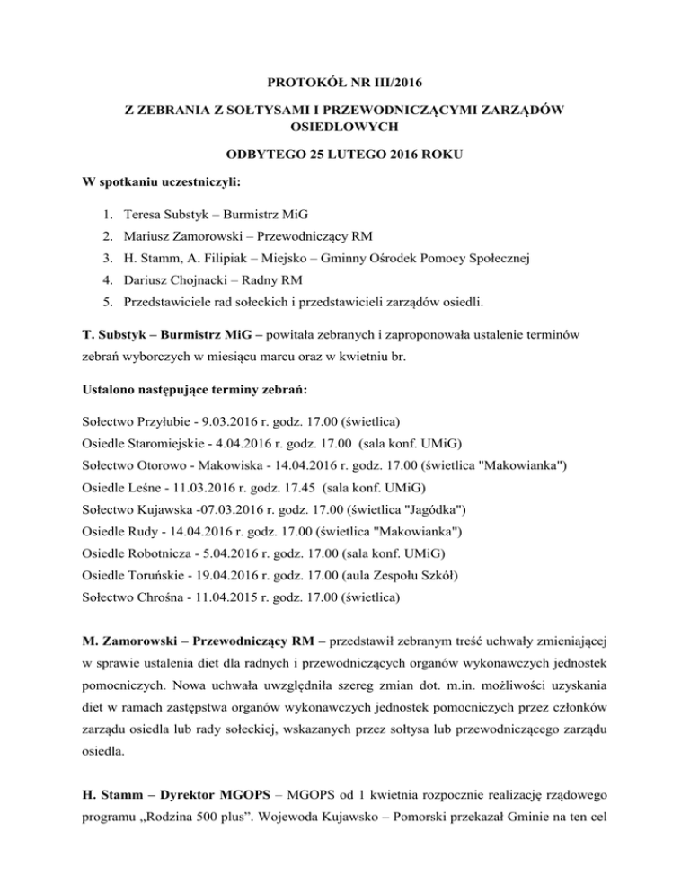 PROTOKÓŁ NR III/2016 Z ZEBRANIA Z SOŁTYSAMI I PRZEWODNICZĄCYMI ZARZĄDÓW OSIEDLOWYCH ODBYTEGO 25 LUTEGO 2016 ROKU W spotkaniu uczestniczyli: 1. Teresa Substyk – Burmistrz MiG 2. Mariusz Zamorowski – Przewodniczący RM 3. H. Stamm, A. Filipiak – Miejsko – Gminny Ośrodek Pomocy Społecznej 4. Dariusz Chojnacki – Radny RM 5. Przedstawiciele rad sołeckich i przedstawicieli zarządów osiedli. T. Substyk – Burmistrz MiG – powitała zebranych i zaproponowała ustalenie terminów zebrań wyborczych w miesiącu marcu oraz w kwietniu br. Ustalono następujące terminy zebrań: Sołectwo Przyłubie - 9.03.2016 r. godz. 17.00 (świetlica) Osiedle Staromiejskie - 4.04.2016 r. godz. 17.00 (sala konf. UMiG) Sołectwo Otorowo - Makowiska - 14.04.2016 r. godz. 17.00 (świetlica "Makowianka") Osiedle Leśne - 11.03.2016 r. godz. 17.45 (sala konf. UMiG) Sołectwo Kujawska -07.03.2016 r. godz. 17.00 (świetlica "Jagódka") Osiedle Rudy - 14.04.2016 r. godz. 17.00 (świetlica "Makowianka") Osiedle Robotnicza - 5.04.2016 r. godz. 17.00 (sala konf. UMiG) Osiedle Toruńskie - 19.04.2016 r. godz. 17.00 (aula Zespołu Szkół) Sołectwo Chrośna - 11.04.2015 r. godz. 17.00 (świetlica) M. Zamorowski – Przewodniczący RM – przedstawił zebranym treść uchwały zmieniającej w sprawie ustalenia diet dla radnych i przewodniczących organów wykonawczych jednostek pomocniczych. Nowa uchwała uwzględniła szereg zmian dot. m.in. możliwości uzyskania diet w ramach zastępstwa organów wykonawczych jednostek pomocniczych przez członków zarządu osiedla lub rady sołeckiej, wskazanych przez sołtysa lub przewodniczącego zarządu osiedla. H. Stamm – Dyrektor MGOPS – MGOPS od 1 kwietnia rozpocznie realizację rządowego programu „Rodzina 500 plus”. Wojewoda Kujawsko – Pomorski przekazał Gminie na ten cel kwotę w wysokości 3.266.856 zł. Kwota ta wystarczy na wypłaty świadczenia przez pierwsze 4 miesiące. Anna Filipiak – Kierownik sekcji świadczeń rodzinnych i spraw alimentacyjnych – poinformowała, że program "Rodzina 500 plus" ruszy w całej Polsce od 01 kwietnia tego roku. Ustawa o pomocy państwa w wychowywaniu dzieci wprowadza w życie program "Rodzina 500 plus", w ramach którego rodzice będą otrzymywać świadczenie wychowawcze w wysokości 500 zł co miesiąc na drugie i kolejne dziecko niezależnie od dochodu. Rodziny, w których dochód nie przekracza 800 zł netto na osobę lub 1200 zł netto (w rodzinach wychowujących niepełnosprawne dziecko) - otrzymają je również na pierwsze lub jedyne dziecko. Rokiem bazowym do ustalenia sytuacji dochodowej rodziny jest rok 2014 wraz ze zmianami, które zaszły w dochodzie rodziny po roku 2014. Z pomocy skorzystają rodzice oraz opiekunowie dzieci do ukończenia przez nie 18 lat. O wsparcie ubiegać będą mogli się także samotni rodzice, rodziny patchworkowe oraz rodziny zastępcze, rodzinne domy dziecka oraz placówki opiekuńczo-wychowawcze typu rodzinnego. Wniosek o świadczenie wychowawcze będzie można złożyć od 1-04-2016 roku w Ośrodku Pomocy Społecznej przy ul. 29 Listopada 12, w godz. od 7.30 do 15.15, wtorek od 7.30 do 16.30. Rozważa się możliwość wydłużenia godzin pracy Ośrodka w razie takiej konieczności. Program startuje 1 kwietnia br. Pierwsze świadczenia wychowawcze zostaną przyznane na okres od dnia wejścia w życie ustawy do dnia 30 września 2017 r. Jeśli osoba złoży wniosek w terminie trzech miesięcy od dnia wejścia w życie ustawy, tj. od 1 kwietnia do 1 lipca 2016 r., to świadczenia wychowawcze zostanie przyznane i wypłacone z wyrównaniem począwszy od dnia wejścia w życie ustawy, czyli od 1 kwietnia 2016 r. Natomiast w przypadku złożenia wniosku po upływie trzech miesięcy od dnia wejścia w życie ustawy (tj. po 1 lipca 2016 r.), prawo do świadczenie zostanie przyznane i wypłacone począwszy od miesiąca, w którym wpłynął wniosek z prawidłowo wypełnionymi dokumentami. W przypadku ubiegania się o przyznanie świadczenia na drugie i każde kolejne dziecko do wniosku należy dołączyć: kserokopię aktów urodzenia dzieci, kserokopię dowodu osobistego, nr rachunku bankowego, na który będą przekazywane świadczenia. W przypadku ubiegania się o przyznanie świadczenia na pierwsze dziecko do wniosku obok w/w dokumentów należy dołączyć : oświadczenia dokumentujące wysokość innych dokumentów niż dochody podlegające opodatkowaniu podatkiem dochodowym od osób fizycznych, oświadczenie o deklarowanych dochodach osiąganych przez osoby podlegające przepisom o zryczałtowanym podatku dochodowym od niektórych przychodów osiąganych przez osoby fizyczne, w przypadku utraty dochodu lub uzyskania dochodu – dokumenty potwierdzające ich utratę lub uzyskanie oraz ich wysokość, orzeczenie o niepełnosprawności, zaświadczenie lub oświadczenie dokumentujące wielkość gospodarstwa rolnego ( chodzi tu o ilość hektarów przeliczeniowych). T. Substyk – Burmistrz MiG – podjęto decyzję o wygospodarowaniu innego budynku, do którego zostałaby przeniesiona sekcja świadczeń rodzinnych i spraw alimentacyjnych. Informacje dot. świadczenia wychowawczego 500 + będziemy na bieżąco podawać w TV Solec, w „Soleckich Wiadomościach z Ratusza”, na stronach internetowych. Ponadto Pani Burmistrz poinformowała, że zakończono budowę ul. Lipowej. Gmina nie otrzymała do tej pory dofinansowania tej inwestycji. Dobiega końca budowa Punktu Obsługi Pasażerów, PKP zadeklarowało przekazać Gminie 400 tys. zł na monitoring obiektu. Od 1 marca br. Zarządzeniem Burmistrza przeprowadzone zostaną konsultację społeczne w sprawie utworzenia przez Gminę Solec Kujawski z Miastem Bydgoszcz i innymi gminami z regionu związku metropolitalnego zw. „Metropolią Bydgoszcz”. Zachęciła mieszkańców gminy do wzięcia udziału w konsultacjach w sprawie utworzenia „Metropolii Bydgoszcz”. Taką możliwość przewiduje ustawa z dnia 9 październ