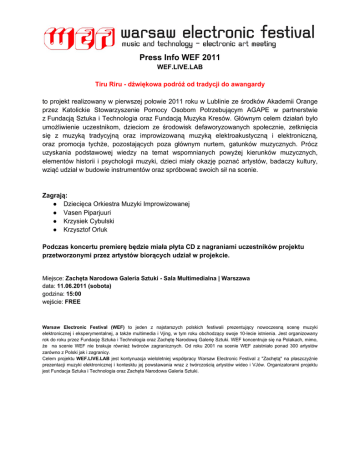 Press Info WEF 2011 WEF.LIVE.LAB Tiru Riru - dźwiękowa podróż od tradycji do awangardy to projekt realizowany w pierwszej połowie 2011 roku w Lublinie ze środków Akademii Orange przez Katolickie Stowarzyszenie Pomocy Osobom Potrzebującym AGAPE w partnerstwie z Fundacją Sztuka i Technologia oraz Fundacją Muzyka Kresów. Głównym celem działań było umożliwienie uczestnikom, dzieciom ze środowisk defaworyzowanych społecznie, zetknięcia się z muzyką tradycyjną oraz improwizowaną muzyką elektroakustyczną i elektroniczną, oraz promocja tychże, pozostających poza głównym nurtem, gatunków muzycznych. Prócz uzyskania podstawowej wiedzy na temat wspomnianych powyżej kierunków muzycznych, elementów historii i psychologii muzyki, dzieci miały okazję poznać artystów, badaczy kultury, wziąć udział w budowie instrumentów oraz spróbować swoich sił na scenie. Zagrają: ● Dziecięca Orkiestra Muzyki Improwizowanej ● Vasen Piparjuuri ● Krzysiek Cybulski ● Krzysztof Orluk Podczas koncertu premierę będzie miała płyta CD z nagraniami uczestników projektu przetworzonymi przez artystów biorących udział w projekcie. Miejsce: Zachęta Narodowa Galeria Sztuki - Sala Multimedialna | Warszawa data: 11.06.2011 (sobota) godzina: 15:00 wejście: FREE Warsaw Electronic Festival (WEF) to jeden z najstarszych polskich festiwali prezentujący nowoczesną scenę muzyki elektronicznej i eksperymentalnej, a także multimedia i Vjing, w tym roku obchodzący swoje 10-lecie istnienia. Jest organizowany rok do roku przez Fundację Sztuka i Technologia oraz Zachętę Narodową Galerię Sztuki. WEF koncentruje się na Polakach, mimo, że na scenie WEF nie brakuje również twórców zagranicznych. Od roku 2001 na scenie WEF zaistniało ponad 300 artystów zarówno z Polski jak i zagranicy. Celem projektu WEF.LIVE.LAB jest kontynuacja wieloletniej współpracy Warsaw Electronic Festival z "Zachętą" na płaszczyźnie prezentacji muzyki elektronicznej i kontesktu jej powstawania wraz z twórczością artystów wideo i VJów. Organizatorami projektu jest Fundacja Sztuka i Technologia oraz Zachęta Narodowa Galeria Sztuki. Krótka informacja o artystach: Dziecięca Orkiestra Muzyki Improwizowanej - to szcześcioosobowa grupa, złożona z dzieci uczestniczących w projekcie “Tiru Riru - dźwiękowa podróż od tradycji do awangardy”. Orkiestra gra muzykę improwizowaną z wykorzystanie własnoręcznie wykonanych instrumentów muzycznych. Kierownictwo muzyczne: Mateusz Bąkała i Sebastian Mac Krzysiek Cybulski - Krzysiek Cybulski - kompozytor, basista, eksperymentator. Związany z WEF od 2009 roku. Członek grupy panGenerator. http://www.myspace.com/krzysiekcybulski Vasen Piparjuuri (Artur Mańka-Chrzanowski) - od początku swej działalności scenicznej związany z WEF. Zafascynowany emocjonalnym wymiarem utworów muzycznych, i ich obiektywną, formalną strukturą, tworzy między stylistykami IDM a drill’n’click. http://soundcloud.com/vasen-piparjuuri Krzysztof Orluk - urodzony w styczniu 1986 roku, zamieszkały w niewielkim mieście na południu Polski (50° 22' 50'' N 18° 48'14'' E). Z zamiłowania muzyk i kompozytor brzmień elektronicznych z pogranicza ambient / drone / minimal / lo-fi, amator makrofotografii i fotografii zbliżeniowej. Jego twórczość to kompromis pomiędzy światem sprzętu audio i oprogramowaniem komputerowym, akustycznymi i elektroakustycznymi instrumentami, oraz nagraniami dźwięków otoczenia czy przedmiotów codziennego użytku (tzw. Field Recording). Zajmuje się rówież masteringiem analogowym oraz cyfrowym. http://www.myspace.com/krzysztoforluk Zaangażowani w realizację projektu: Mateusz Bąkała - pomysłodawca, współautor projektu, koordynator i prowadzący warsztaty Sebastian Mac - współautor projektu, prowadzący warsztaty Milena Nowacka-Bąkała - prowadząca warsztaty Diana Wójcik - prowadząca warsztaty Katarzyna Trzpil - prowadząca warsztaty Monika Mamińska - prowadząca warsztaty Ewa Grochowska - prowadząca warsztaty Krzysztof Cybulski - prowadzący warsztaty Artur Mańka-Chrzanowski - prowadzący warsztaty Krzysztof Orluk - prowadzący warsztaty Studio Format - projekt logotypu, strony www, plakatów, okładki płyty i innych Organizatorzy | Partnerzy | Patroni medialni Projekt realizowany jest w ramach programu Akademia Orange przez: - Katolickie Stowarzyszenie Pomocy Osobom Potrzebującym AGAPE - Fundację Sztuka i Technologia - Fundację Muzyka Kresów. Linki: www.rirutiru.pl www.agape.lublin.pl www.muzykakresow.pl www.wef.pl OFICJALNY FILM PROMOCYJNY Youtube: http://www.youtube.com/watch?v=8RNZF9X4wRE
