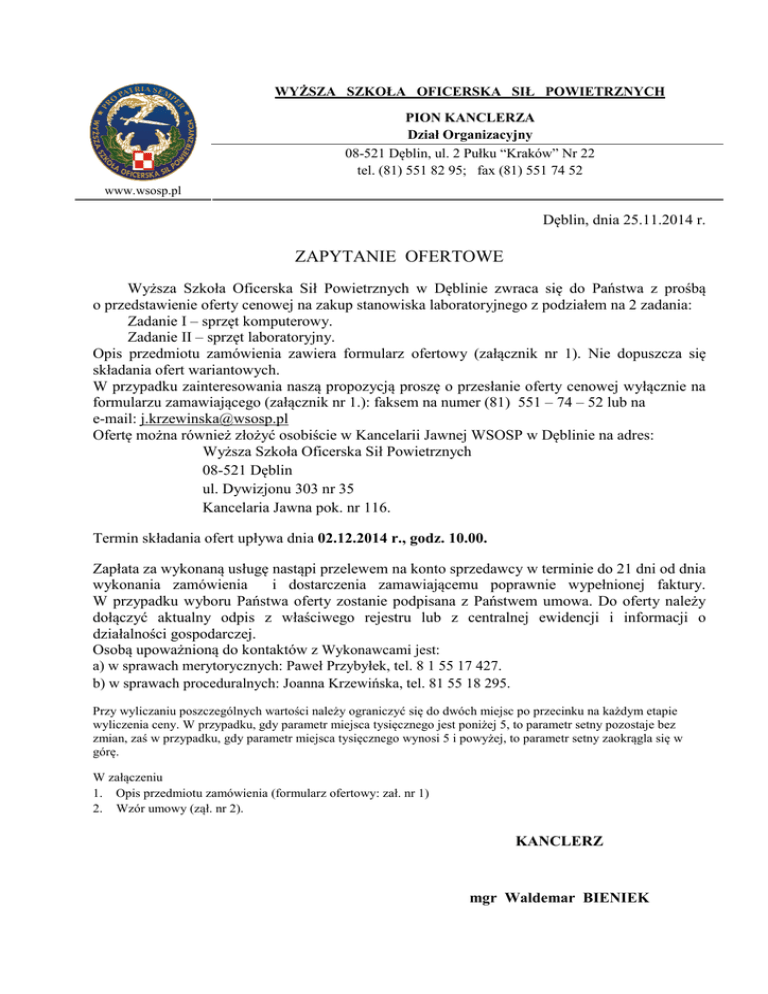 WYŻSZA SZKOŁA OFICERSKA SIŁ POWIETRZNYCH PION KANCLERZA Dział Organizacyjny 08-521 Dęblin, ul. 2 Pułku “Kraków” Nr 22 tel. (81) 551 82 95; fax (81) 551 74 52 www.wsosp.pl Dęblin, dnia 25.11.2014 r. ZAPYTANIE OFERTOWE Wyższa Szkoła Oficerska Sił Powietrznych w Dęblinie zwraca się do Państwa z prośbą o przedstawienie oferty cenowej na zakup stanowiska laboratoryjnego z podziałem na 2 zadania: Zadanie I – sprzęt komputerowy. Zadanie II – sprzęt laboratoryjny. Opis przedmiotu zamówienia zawiera formularz ofertowy (załącznik nr 1). Nie dopuszcza się składania ofert wariantowych. W przypadku zainteresowania naszą propozycją proszę o przesłanie oferty cenowej wyłącznie na formularzu zamawiającego (załącznik nr 1.): faksem na numer (81) 551 – 74 – 52 lub na e-mail: [email protected] Ofertę można również złożyć osobiście w Kancelarii Jawnej WSOSP w Dęblinie na adres: Wyższa Szkoła Oficerska Sił Powietrznych 08-521 Dęblin ul. Dywizjonu 303 nr 35 Kancelaria Jawna pok. nr 116. Termin składania ofert upływa dnia 02.12.2014 r., godz. 10.00. Zapłata za wykonaną usługę nastąpi przelewem na konto sprzedawcy w terminie do 21 dni od dnia wykonania zamówienia i dostarczenia zamawiającemu poprawnie wypełnionej faktury. W przypadku wyboru Państwa oferty zostanie podpisana z Państwem umowa. Do oferty należy dołączyć aktualny odpis z właściwego rejestru lub z centralnej ewidencji i informacji o działalności gospodarczej. Osobą upoważnioną do kontaktów z Wykonawcami jest: a) w sprawach merytorycznych: Paweł Przybyłek, tel. 8 1 55 17 427. b) w sprawach proceduralnych: Joanna Krzewińska, tel. 81 55 18 295. Przy wyliczaniu poszczególnych wartości należy ograniczyć się do dwóch miejsc po przecinku na każdym etapie wyliczenia ceny. W przypadku, gdy parametr miejsca tysięcznego jest poniżej 5, to parametr setny pozostaje bez zmian, zaś w przypadku, gdy parametr miejsca tysięcznego wynosi 5 i powyżej, to parametr setny zaokrągla się w górę. W załączeniu 1. Opis przedmiotu zamówienia (formularz ofertowy: zał. nr 1) 2. Wzór umowy (zął. nr 2). KANCLERZ mgr Waldemar BIENIEK Załącznik nr 1 FORMULARZ OFERTOWY Zadanie I W odpowiedzi na zapytanie składamy ofertę. Szczegółowy opis przedmiotu zamówienia Przedmiotem zamówienia jest sprzęt komputerowy. 1. Komputer przenośny laptop o parametrach niezgorszych niż ASUS R510JK-DM009H 960GB SSD | 12GB Gwarancja 2 lata przekątna ekranu LCD 15.6 cali nominalna rozdzielczość LCD 1920 x 1080 pikseli typ ekranu matowy (non-glare) procesor Intel® Core™ i7 model procesora i7-4710HQ (2.5 Ghz, 3.5 GHz Turbo, 6 MB Cache) ilość rdzeni 4 szt. wielkość pamięci RAM 12 GB typ zastosowanej pamięci RAM DDR3 (1600 MHz) rodzaj dysku twardego SSD (flash) pojemność dysku SSD 960 GB SanDisk Ultra II napęd optyczny DVD+/-RW DL dedykowana grafika tak karta graficzna NVIDIA GeForce GTX 850M pamięć karty graficznej 2048 MB wyjścia karty graficznej typ akumulatora wyjście HDMI wyjście D-Sub 4-komorowy pojemność akumulatora 2950 mAh 44 Wh karta dźwiękowa stereo czytnik kart pamięci SD komunikacja LAN 100 Mbps WiFi IEEE 802.11b/g/n Bluetooth 2 x USB 3.0 1 x USB kamera 0.3 Mpix interfejsy dodatkowe wyposażenie/funkcjonalność zainstalowany system operacyjny Windows 8.1 szerokość 380 mm głębokość 251 mm wysokość 31.8 mm waga 2.45 kg materiał obudowy tworzywo sztuczne kolor obudowy szaro-czarny stylistyka pokrywy szara kolor ramki wyświetlacza LCD czarny kolor klawiatury czarny kolor wokół klawiatury szary akcesoria bateria | zasilacz, torba, mysz 2. Tablet nie gorszy niż Tablet Samsung Galaxy Tab S 10.5 T805 LTE Typ procesora Ośmiordzeniowy Prędkość CPU 1,90 GHz PAMIĘĆ: RAM 3 GB Rodzaj pamięci LP-DDR3 Pojemność dysku 16 GB Przekątna wyświetlacza 10.5" Rozdzielczość max. LCD 2560x1600 Rodzaj matrycy błyszcząca,dotykowa,Super AMOLED Złącza zewnętrzne czytnik kart pamięci,1 x mini-jack,1 x Micro USB 2.0 Czytnik kart pamięci Micro SD,Micro SDHC,Micro SD Urządzenie wskazujące ekran dotykowy (multitouch) Karta sieciowa Bluetooth 4.0,Wireless 802.11 a/b/g/n/ac System operacyjny ANDROID Wersja systemu operacyjnego 4.4 Waga 465 g Wymiary dług. x wys. x szer. 247.3 x 177.3 x 6.6mm Modem 3G Nie Rodzaj produktu tablet Ekran dotykowy Tak 3. Drukarka wielofunkcyjna nie gorsze niż Kolorowa Drukarka Konica Bizhub C253 Szybkość drukowania/kopiowania A4: kolor do 25 stron/min. A4: mono do 25 stron/min. A3: kolor up to 13 stron/min. A3: mono up to 13 stron/min. Czas pierwszej kopii Kolor 11.7 s. (A4) Mono 7.7 s. (A4) Rozdzielczość kopiowania 600 x 600 dpi Rozdzielczość drukowania Max. 1,800 x 600 dpi Rozdzielczość skanowania Max.: 600 x 600 dpi Rozdzielczość faksu Max.: 600 x 600 dpi (ultra-fine) Skalowanie 25 - 400% w krokach co 0.1% Wielokrotne kopiowanie 1- 9,999, tryb przerwania Skala szarości 256 odcieni Pamięć kopiarki 1,024 MB Pojemność dysku twardego 60 GB Funkcje kopiowania Rozdział, dodawanie okładek i przekładek Kopia próbna Wydruk testowy do ustawień Pamięć ustawień prac Tryb plakatu Poddruk, stemplowanie, ochrona przed kopiowaniem L.p. Nazwa przedmiotu Ilość szt. Cena jednostkowa netto zł Wartość netto (zł) stawka VAT % Kwota VAT (zł) Wartość zamówienia brutto (zł) A B C D E=CxD F G=FxE H=E+G 1. laptop 1 2. tablet 1 3. drukarka 1 RAZEM Gwarancja: 2 lata na wszystkie elementy stanowiska. Termin dostawy: 15.12.2014 r. Koszt dostawy po stronie wykonawcy: wliczony w cenę towaru. Dostawa jednorazowa. Termin płatności: płatność w ciągu 21 dni od daty otrzymania faktury. Zobowiązuję się wykonać usługę zgodnie z umową i/lub formularzem ofertowym. Wykonawca: .............................................................................................................................. Siedziba/adres:............................................................................................................