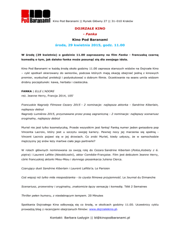 Kino Pod Baranami || Rynek Główny 27 || 31–010 Kraków DOJRZAŁE KINO - Fanka Kino Pod Baranami środa, 29 kwietnia 2015, godz. 11.00 W środę (29 kwietnia) o godzinie 11.00 zapraszamy na film Fanka - francuską czarną komedię o tym, jak daleko fanka może posunąć się dla swojego idola. Kino Pod Baranami w każdą środę około godziny 11.00 zaprasza starszych widzów na Dojrzałe Kino – cykl spotkań skierowany do seniorów, podczas których mają okazję obejrzeć jedną z kinowych premier, wysłuchać prelekcji i podyskutować o dobrym filmie. Oczekiwanie na seans umila widzom drobny poczęstunek: kawa, herbata i ciasteczka. FANKA | ELLE L'ADORE reż. Jeanne Herry, Francja 2014, 105' Francuskie Nagrody Filmowe Cezary 2015 - 2 nominacje: najlepsza aktorka - Sandrine Kiberlain, najlepszy debiut Nagrody Lumières 2015, przyznawane przez prasę zagraniczną - 2 nominacje: najlepszy scenariusz oryginalny, najlepszy debiut Muriel nie jest tylko kosmetyczką. Przede wszystkim jest fanką! Fanką numer jeden gwiazdora pop Vincenta Lacroix, który jest u szczytu swojej kariery. Pewnej nocy jej marzenia się spełnią Vincent Lacroix pojawi się w jej drzwiach. Co zrobi Muriel, kiedy usłyszy, że w samochodzie mężczyzny jej snów leży martwe ciało jego partnerki? W rolach głównych nominowana za swoją rolę do Cezara Sandrine Kiberlain (Poliss,Kobiety z 6. piętra) i Laurent Lafitte (Nieobliczalni), aktor Comédie-Française. Film jest debiutem Jeanne Herry, córki francuskiej aktorki Miou-Miou i słynnego piosenkarza Juliena Clerca. Czarujący duet Sandrine Kiberlain i Laurent Lafitte'a. Le Parisien Coś więcej niż tylko miła niespodzianka - to czysta filmowa przyjemność. Le Journal du Dimanche Scenariusz, przewrotny i oryginalny, znakomicie łączy sensację i komedię. Télé 2 Semaines Thriller pełen humoru, z niesłabnącym tempem. 20 Minutes Spotkania Dojrzałego Kina odbywają się co środę, w okolicach godziny 11.00. Uczestnicy cyklu prowadzą blog z recenzjami obejrzanych filmów: www.dojrzalekino.pl. Kontakt: Barbara Ładygin || [email protected] Kino Pod Baranami || Rynek Główny 27 || 31–010 Kraków Cykl zrealizowano przy wsparciu PISF. BILETY dla seniorów: tylko 12 zł Dojrzałe kino, jak dojrzałe wino – to pełnia smaku! PARTNERZY: Kontakt: Barbara Ładygin || [email protected]