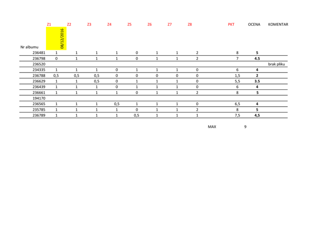 Nralbumu 236481 236798 236520 234335 236788 236629 236439 236661 194170 236565 235785 236789 Z2 Z3 Z4 Z5 Z6 Z7 Z8 PKT OCENA KOMENTARZ 08/12/2016 Z1 1 0 1 1 1 1 1 1 0 0 1 1 1 1 2 2 8 7 5 4.5 brakpliku 1 0,5 1 1 1 1 0,5 1 1 1 1 0,5 0,5 1 1 0 0 0 0 1 1 0 1 1 0 1 0 1 1 1 1 0 1 1 1 0 0 0 0 2 6 1,5 5,5 6 8 4 2 3.5 4 5 1 1 1 1 1 1 1 1 1 0,5 1 1 1 0 0,5 1 1 1 1 1 1 0 2 1 6,5 8 7,5 4 5 4,5 MAX 9