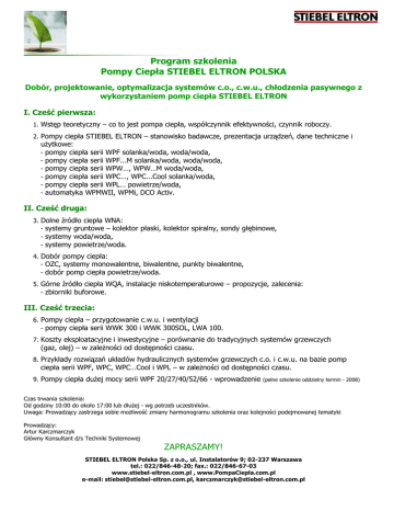 Program szkolenia Pompy Ciepła STIEBEL ELTRON POLSKA Dobór, projektowanie, optymalizacja systemów c.o., c.w.u., chłodzenia pasywnego z wykorzystaniem pomp ciepła STIEBEL ELTRON I. Cześć pierwsza: 1. Wstęp teoretyczny – co to jest pompa ciepła, współczynnik efektywności, czynnik roboczy. 2. Pompy ciepła STIEBEL ELTRON – stanowisko badawcze, prezentacja urządzeń, dane techniczne i uŜytkowe: pompy ciepła serii WPF solanka/woda, woda/woda, pompy ciepła serii WPF...M solanka/woda, woda/woda, pompy ciepła serii WPW…, WPW…M woda/woda, pompy ciepła serii WPC…, WPC...Cool solanka/woda, pompy ciepła serii WPL… powietrze/woda, automatyka WPMWII, WPMi, DCO Activ. - II. Cześć druga: 3. Dolne źródło ciepła WNA: - systemy gruntowe – kolektor płaski, kolektor spiralny, sondy głębinowe, - systemy woda/woda, - systemy powietrze/woda. 4. Dobór pompy ciepła: - OZC, systemy monowalentne, biwalentne, punkty biwalentne, - dobór pomp ciepła powietrze/woda. 5. Górne źródło ciepła WQA, instalacje niskotemperaturowe – propozycje, zalecenia: - zbiorniki buforowe. III. Cześć trzecia: 6. Pompy ciepła – przygotowanie c.w.u. i wentylacji - pompy ciepła serii WWK 300 i WWK 300SOL, LWA 100. 7. Koszty eksploatacyjne i inwestycyjne – porównanie do tradycyjnych systemów grzewczych (gaz, olej) – w zaleŜności od dostępności czasu. 8. Przykłady rozwiązań układów hydraulicznych systemów grzewczych c.o. i c.w.u. na bazie pomp ciepła serii WPF, WPC, WPC…Cool i WPL – w zaleŜności od dostępności czasu. 9. Pompy ciepła duŜej mocy serii WPF 20/27/40/52/66 - wprowadzenie (pełne szkolenie oddzielny termin - 2008) Czas trwania szkolenia: Od godziny 10:00 do około 17:00 lub dłuŜej - wg potrzeb uczestników. Uwaga: Prowadzący zastrzega sobie moŜliwość zmiany harmonogramu szkolenia oraz kolejności podejmowanej tematyki Prowadzący: Artur Karczmarczyk Główny Konsultant d/s Techniki Systemowej ZAPRASZAMY! STIEBEL ELTRON Polska Sp. z o.o., ul. Instalatorów 9; 02-237 Warszawa tel.: 022/846-48-20; fax.: 022/846-67-03 www.stiebel-eltron.com.pl , www.PompaCiepla.com.pl e-mail: [email protected], [email protected]