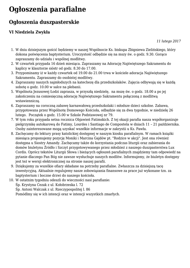 Ogłoszenia parafialne Ogłoszenia duszpasterskie VI Niedziela Zwykła 11 lutego 2017 1. W dniu dzisiejszym gościć będziemy w naszej Wspólnocie Ks. biskupa Zbigniewa Zielińskiego, który dokona poświęcenia baptysterium. Uroczystość odbędzie się na mszy św. o godz. 9.30. Gorąco zapraszamy do udziału i wspólnej modlitwy. 2. W czwartek przypada 16 dzień miesiąca. Zapraszamy na Adorację Najświętszego Sakramentu do kaplicy w klasztorze sióstr od godz. 8.30 do 17.00. 3. Przypominamy iż w każdy czwartek od 19.00 do 21.00 trwa w kościele adoracja Najświętszego Sakramentu. Zapraszamy do osobistej modlitwy. 4. Zapraszamy naszych najmłodszych na katechezę dla przedszkolaków. Zajęcia odbywają się w każdą sobotę o godz. 10.00 w salce na plebanii. 5. Wspólnota Jezusowej Łodzi zaprasza, w przyszłą niedzielę, na mszę św. o godz. 18.00 a po jej zakończeniu na comiesięczną adorację Najświętszego Sakramentu połączoną z modlitwą wstawienniczą. 6. Zapraszamy na coroczną zabawę karnawałową przedszkolaki i młodsze dzieci szkolne. Zabawa, przygotowana przez Wspólnotę Domowego Kościoła, odbędzie się za dwa tygodnie, w niedzielę 26 lutego. Początek o godz. 15.00 w Szkole Podstawowej nr 79. 7. W tym roku przypada setna rocznica Objawień Fatimskich. Z tej okazji parafia nasza współorganizuje pielgrzymkę autokarową do Fatimy, Lourdes i Santiago de Compostela w dniach 11 – 21 października. Osoby zainteresowane mogą uzyskać wszelkie informacje w zakrystii u Ks. Pawła. 8. Zachęcamy do lektury prasy katolickiej dostępnej w naszym kiosku parafialnym. W ramach książki miesiąca proponujemy pozycję Moniki i Marcina Gajdów pt. "Rodzice w akcji". Jest ona również dostępna u Siostry Amandy. Zachęcamy także do korzystania podczas liturgii oraz zabierania do domów biuletynu Źródło i Szczyt przygotowywanego przez młodzież z naszego duszpasterstwa Lux Cordis. Oprócz tekstów Liturgii Słowa i bieżących ogłoszeń parafialnych znajdziemy tam odpowiedź na pytanie dlaczego Pan Bóg nie zawsze wysłuchuje naszych modlitw. Informujemy, że biuletyn dostępny jest też w wersji elektronicznej na stronie naszej parafii. 9. Dziękujemy za wszelkie ofiary składane na potrzeby parafialne. Zwłaszcza za dzisiejszą tacę inwestycyjną. Aktualnie regulujemy nasze zobowiązania finansowe za prace już wykonane tzn. za baptysterium i boczne drzwi do naszego kościoła. 10. W ostatnim tygodniu odeszli do wieczności nasi parafianie: Śp. Krystyna Cezak z ul. Kołobrzeska l. 72 Śp. Antoni Walczak z ul. Rzeczypospolitej l. 86 Pomódlmy się w ich intencji oraz w intencji wszystkich zmarłych.