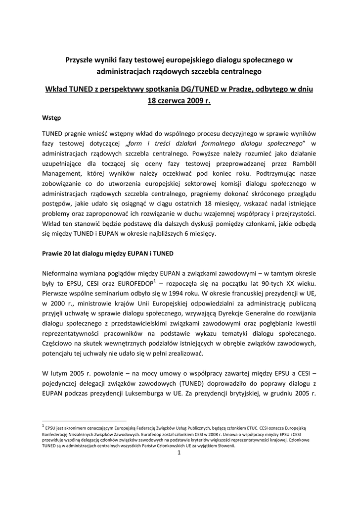 Przyszłe wyniki fazy testowej europejskiego dialogu społecznego w administracjach rządowych szczebla centralnego Wkład TUNED z perspektywy spotkania DG/TUNED w Pradze, odbytego w dniu 18 czerwca 2009 r. Wstęp TUNED pragnie wnieść wstępny wkład do wspólnego procesu decyzyjnego w sprawie wyników fazy testowej dotyczącej „form i treści działań formalnego dialogu społecznego” w administracjach rządowych szczebla centralnego. Powyższe należy rozumieć jako działanie uzupełniające dla toczącej się oceny fazy testowej przeprowadzanej przez Ramböll Management, której wyników należy oczekiwać pod koniec roku. Podtrzymując nasze zobowiązanie co do utworzenia europejskiej sektorowej komisji dialogu społecznego w administracjach rządowych szczebla centralnego, pragniemy dokonać skróconego przeglądu postępów, jakie udało się osiągnąć w ciągu ostatnich 18 miesięcy, wskazać nadal istniejące problemy oraz zaproponować ich rozwiązanie w duchu wzajemnej współpracy i przejrzystości. Wkład ten stanowić będzie podstawę dla dalszych dyskusji pomiędzy członkami, jakie odbędą się między TUNED i EUPAN w okresie najbliższych 6 miesięcy. Prawie 20 lat dialogu między EUPAN i TUNED Nieformalna wymiana poglądów między EUPAN a związkami zawodowymi – w tamtym okresie były to EPSU, CESI oraz EUROFEDOP1 – rozpoczęła się na początku lat 90-tych XX wieku. Pierwsze wspólne seminarium odbyło się w 1994 roku. W okresie francuskiej prezydencji w UE, w 2000 r., ministrowie krajów Unii Europejskiej odpowiedzialni za administrację publiczną przyjęli uchwałę w sprawie dialogu społecznego, wzywającą Dyrekcje Generalne do rozwijania dialogu społecznego z przedstawicielskimi związkami zawodowymi oraz pogłębiania kwestii reprezentatywności pracowników na podstawie wykazu tematyki dialogu społecznego. Częściowo na skutek wewnętrznych podziałów istniejących w obrębie związków zawodowych, potencjału tej uchwały nie udało się w pełni zrealizować. W lutym 2005 r. powołanie – na mocy umowy o współpracy zawartej między EPSU a CESI – pojedynczej delegacji związków zawodowych (TUNED) doprowadziło do poprawy dialogu z EUPAN podczas prezydencji Luksemburga w UE. Za prezydencji brytyjskiej, w grudniu 2005 r. 1 EPSU jest akronimem oznaczającym Europejską Federację Związków Usług Publicznych, będącą członkiem ETUC. CESI oznacza Europejską Konfederację Niezależnych Związków Zawodowych. Eurofedop został członkiem CESI w 2008 r. Umowa o współpracy między EPSU i CESI przewiduje wspólną delegację członków związków zawodowych na podstawie kryteriów większości reprezentatywności krajowej. Członkowe TUNED są w administracjach centralnych wszystkich Państw Członkowskich UE za wyjątkiem Słowenii. 1 Przyszłe wyniki fazy testowej europejskiego dialogu społecznego w administracjach rządowych szczebla centralnego wypracowano pierwsze wspólne oświadczenie w sprawie równości i różnorodności. W późniejszym okresie, podczas – odpowiednio – prezydencji austriackiej i fińskiej, ogłoszono kolejne stanowisko – w sprawie mobilności i przywództwa. Dania zainicjowała wspólną metodologię w ramach przygotowań do konferencji EUPAN/TUNED poświęconej problemom równości i różnorodności w październiku 2007 r. Był to istotny postęp, ponieważ związki zawodowe przeszły od statusu „gościa” do „równorzędnego partnera”. W czerwcu 2007 r., berlińska deklaracja ministerialna zatwierdziła propozycję wdrożenia dwuletniej fazy testowej dotyczącej „form i treści działań formalnego dialogu społecznego”. Pomimo tego, iż w raporcie EIPA, opracowanym na zlecenie EUPAN, znalazł się wniosek, że korzyści płynące z formalizacji przeważają nad ujemnymi stronami, przed podjęciem decyzji EUPAN postanowiła przeprowadzić fazę pilotażową. TUNED wyrażał gotowość do formalizacji już w 2005 r., jednak faza testowa potraktowana została jako przydatne działanie przejściowe na drodze do formalizacji, w szczególności poprzez następujące działania uzgodnione wspólnie podczas prezydencji portugalskiej w UE: • Regulamin umożliwiający partnerstwo na równych zasadach • Dwuletni program działań umożliwiający planowanie i ciągłość • Powiązane merytoryczne treści i działania uzupełniające, m.in. raport w sprawie zewnętrznych źródeł przemocy w miejscu pracy, wspólne stanowisko dotyczące stresu w miejscu pracy oraz finansowany przez EU projekt TRUST obejmujący raport badawczy, seminarium i konferencję. W perspektywie ogólnej, zgodziliśmy się z wnioskami zawartymi w ocenie fazy testowej przeprowadzonej w połowie okresu realizacji przez EIPA (raport Kaedinga). Zgodziliśmy się co do tego, iż w ciągu minionego roku nastąpiła znacząca poprawa w zakresie efektywności, współczynnika udziału oraz wzajemnego zaufania pomiędzy poszczególnymi stronami. Należy podkreślić, że w ogólnej perspektywie wzmocnieniu uległy relacje między związkami zawodowymi oraz pracodawcami w kwestiach związanych z UE. W niektórych przypadkach umożliwiło to przewidywanie nowych lub dopiero wyłaniających się kwestii dotyczących dialogu społecznego na szczeblu krajowym. Niezależnie od tego, nadal pozostaje wiele problemów do rozwiązania, z których część została wymieniona w raporcie Kaedinga. Mają one znaczące implikacje z punktu widzenia obciążenia pracą, koordynacji poglądów, współczynnika udziału delegatów TUNED oraz ogólnej wartości dodanej dialogu społecznego: 2 Przyszłe wyniki fazy testowej europejskiego dialogu społecznego w administracjach rządowych szczebla centralnego Wykluczenie z procesu decyzyjnego UE 1. Zasoby doraźne 2. Brak organizacji strukturalnej pracodawców 3. Nieporozumienia co do istoty procesu formalizacji. Pierwsze dwie kwestie zostaną rozwiązane automatycznie na drodze formalizacji, jak to