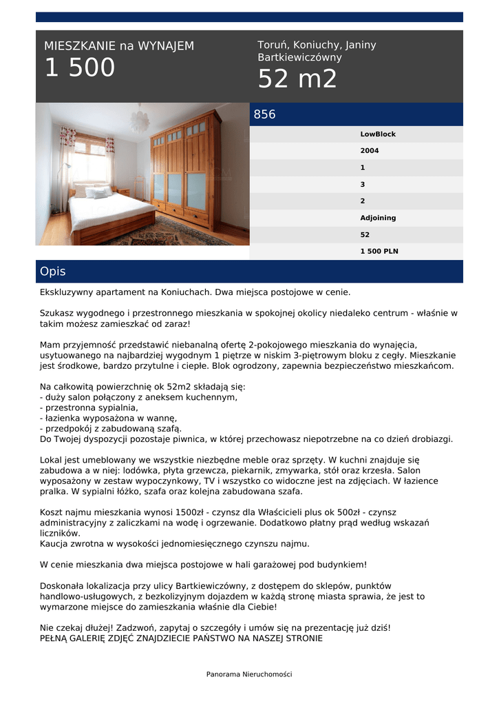 MIESZKANIE na WYNAJEM 1 500 Toruń, Koniuchy, Janiny Bartkiewiczówny 52 m2 856 LowBlock 2004 1 3 2 Adjoining 52 1 500 PLN Opis Ekskluzywny apartament na Koniuchach. Dwa miejsca postojowe w cenie. Szukasz wygodnego i przestronnego mieszkania w spokojnej okolicy niedaleko centrum - właśnie w takim możesz zamieszkać od zaraz! Mam przyjemność przedstawić niebanalną ofertę 2-pokojowego mieszkania do wynajęcia, usytuowanego na najbardziej wygodnym 1 piętrze w niskim 3-piętrowym bloku z cegły. Mieszkanie jest środkowe, bardzo przytulne i ciepłe. Blok ogrodzony, zapewnia bezpieczeństwo mieszkańcom. Na całkowitą powierzchnię ok 52m2 składają się: - duży salon połączony z aneksem kuchennym, - przestronna sypialnia, - łazienka wyposażona w wannę, - przedpokój z zabudowaną szafą. Do Twojej dyspozycji pozostaje piwnica, w której przechowasz niepotrzebne na co dzień drobiazgi. Lokal jest umeblowany we wszystkie niezbędne meble oraz sprzęty. W kuchni znajduje się zabudowa a w niej: lodówka, płyta grzewcza, piekarnik, zmywarka, stół oraz krzesła. Salon wyposażony w zestaw wypoczynkowy, TV i wszystko co widoczne jest na zdjęciach. W łazience pralka. W sypialni łóżko, szafa oraz kolejna zabudowana szafa. Koszt najmu mieszkania wynosi 1500zł - czynsz dla Właścicieli plus ok 500zł - czynsz administracyjny z zaliczkami na wodę i ogrzewanie. Dodatkowo płatny prąd według wskazań liczników. Kaucja zwrotna w wysokości jednomiesięcznego czynszu najmu. W cenie mieszkania dwa miejsca postojowe w hali garażowej pod budynkiem! Doskonała lokalizacja przy ulicy Bartkiewiczówny, z dostępem do sklepów, punktów handlowo-usługowych, z bezkolizyjnym dojazdem w każdą stronę miasta sprawia, że jest to wymarzone miejsce do zamieszkania właśnie dla Ciebie! Nie czekaj dłużej! Zadzwoń, zapytaj o szczegóły i umów się na prezentację już dziś! PEŁNĄ GALERIĘ ZDJĘĆ ZNAJDZIECIE PAŃSTWO NA NASZEJ STRONIE Panorama Nieruchomości PANORAMA-NIERUCHOMOŚCI.net ZAPRASZAMY Panorama Nieruchomości tel. 56/687-19-76 email: [email protected] Panorama Nieruchomości Powered by TCPDF (www.tcpdf.org)