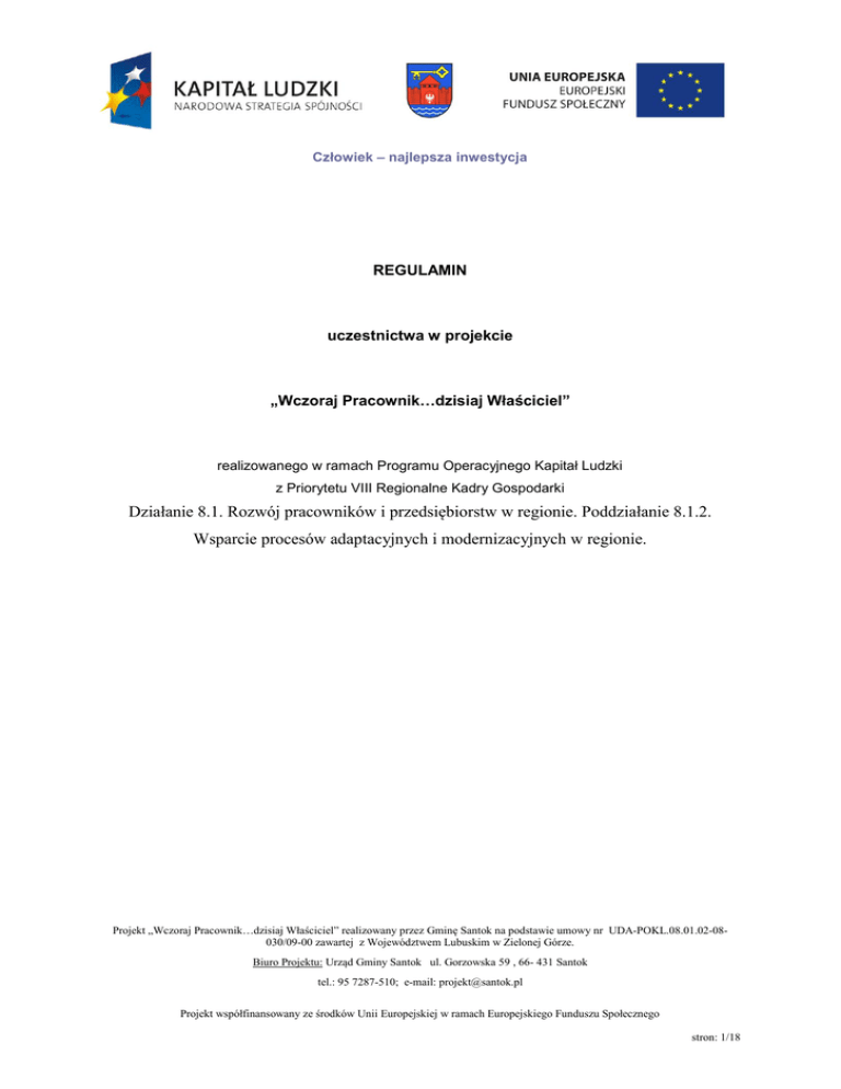 Człowiek – najlepsza inwestycja REGULAMIN uczestnictwa w projekcie „Wczoraj Pracownik…dzisiaj Właściciel” realizowanego w ramach Programu Operacyjnego Kapitał Ludzki z Priorytetu VIII Regionalne Kadry Gospodarki Działanie 8.1. Rozwój pracowników i przedsiębiorstw w regionie. Poddziałanie 8.1.2. Wsparcie procesów adaptacyjnych i modernizacyjnych w regionie. Projekt „Wczoraj Pracownik…dzisiaj Właściciel” realizowany przez Gminę Santok na podstawie umowy nr UDA-POKL.08.01.02-08030/09-00 zawartej z Województwem Lubuskim w Zielonej Górze. Biuro Projektu: Urząd Gminy Santok ul. Gorzowska 59 , 66- 431 Santok tel.: 95 7287-510; e-mail: [email protected] Projekt współfinansowany ze środków Unii Europejskiej w ramach Europejskiego Funduszu Społecznego stron: 1/18 Człowiek – najlepsza inwestycja §1 Postanowienia ogólne 1. Regulamin określa zasady naboru, zakres oraz warunki udzielania wsparcia dla uczestników projektu „Wczoraj Pracownik…dzisiaj Właściciel” realizowanego w ramach Działania 8.1. Rozwój pracowników i przedsiębiorstw w regionie; Poddziałanie 8.1.2. Wsparcie procesów adaptacyjnych i modernizacyjnych w regionie Programu Operacyjnego Kapitał Ludzki. 2. Projekt realizowany jest w terminie od 01.02.2010 – 31.01.2012 r. na terenie województwa lubuskiego §2 Słownik pojęć Lista skrótów używanych w dokumencie: Projekt – projekt projektu „Wczoraj Pracownik…dzisiaj Właściciel” realizowany w ramach Działania 8.1. Rozwój pracowników i przedsiębiorstw w regionie; Poddziałanie 8.1.2. Wsparcie procesów adaptacyjnych i modernizacyjnych w regionie Programu Operacyjnego Kapitał Ludzki. Projektodawca – Gmina Santok, Kandydat na uczestnika projektu – osoba fizyczna, która złożyła kwestionariusz rekrutacyjny do projektu, Dzień przystąpienia do projektu - dzień podpisania przez Kandydata na uczestnika projektu Deklaracji uczestnictwa w projekcie, Uczestnik projektu (Beneficjent Ostateczny) – osoba fizyczna (Kandydat), z którą Projektodawca zawarł umowę na świadczenie usług szkoleniowo – doradczych, Strona internetowa Projektodawcy (strona WWW) – strona, na której będą umieszczane informacje dotyczące projektu, tj.www.santok.pl., Biuro Projektu – Urząd Gminy Santok ul. Gorzowska 59 , 66- 431 Santok; tel.: 95 7287-510; e-mail: [email protected] Komisja Rekrutacyjna – powołana przez Projektodawcę komisja, której zadaniem jest dokonanie wyboru uczestników projektu spośród wszystkich kandydatów na podstawie ściśle określonych kryteriów, Komisja Oceny Wniosków (KOW) – powołana przez Projektodawcę komisja, której zadaniem jest dokonanie oceny merytorycznej Wniosków o przyznanie wsparcia finansowego, podstawowego i przedłużonego wsparcia pomostowego. Ocena wniosków dokonywana jest w oparciu o Regulamin Komisji Oceny Wniosków sporządzony przez Projektodawcę, Godzina szkoleniowa – 1 godzina lekcyjna, tj. 45 minut, Zarejestrowana działalność gospodarcza - działalność posiadająca wpis do Ewidencji Działalności Gospodarczej właściwego Urzędu lub w KRS na terenie województwa lubuskiego oraz zarejestrowana w Krajowym Rejestrze Podmiotów Gospodarki Narodowej (REGON), Data zarejestrowania działalności gospodarczej – data uzyskania wpisu do Ewidencji Działalności Gospodarczej lub KRS oraz zarejestrowania w Krajowym Rejestrze Podmiotów Gospodarczych (REGON), Projekt „Wczoraj Pracownik…dzisiaj Właściciel” realizowany przez Gminę Santok na podstawie umowy nr UDA-POKL.08.01.02-08030/09-00 zawartej z Województwem Lubuskim w Zielonej Górze. Biuro Projektu: Urząd Gminy Santok ul. Gorzowska 59 , 66- 431 Santok tel.: 95 7287-510; e-mail: [email protected] Projekt współfinansowany ze środków Unii Europejskiej w ramach Europejskiego Funduszu Społecznego stron: 2/18 Człowiek – najlepsza inwestycja §3 Uczestnicy projektu Projekt skierowany jest do: osób, których stosunek pracy wygasł lub został rozwiązany z przyczyn niedotyczących pracownika w okresie nie dłuższym niż 6 miesięcy przed dniem przystąpienia do projektu; osób przewidzianych do zwolnienia lub zagrożonych zwolnieniem z pracy z przyczyn niedotyczących pracowników, zatrudnionych u pracodawców przechodzących procesy adaptacyjne i modernizacyjne, realizowane w formie tworzenia i wdrażania programów zwolnień monitorowanych; jednocześnie osób fizycznych mających miejsce zamieszkania na terenie województwa lubuskiego w rozumieniu przepisów art. 25 Kodeksu Cywilnego (miejscem zamieszkania osoby fizycznej jest miejscowość, w której osoba ta przebywa z zamiarem stałego pobytu), które zamierzają rozpocząć działalność gospodarczą zarejestrowaną na terenie województwa lubuskiego, za wyjątkiem osób, które: posiadały zarejestrowaną działalność gospodarczą w okresie 1 roku przed przystąpieniem do projektu tj. przed podpisaniem deklaracji uczestnictwa w projekcie; otrzymały w okresie ostatnich 3 lat poprzedzających przystąpienie do projektu środki publiczne na podjęcie działalności; są pracownikami Urzędu Marszałkowskiego Województwa Lubuskiego; otrzymały dofinansowanie na pokrycie tych samych wydatków kwalifikowalnych z innego źródła oraz osoby, które złożyły wniosek (będący w trakcie rozpatrywania lub który został rozpatrzony pozytywnie) u innego podmiotu ubiegając się o wsparcie na rozpoczęcie działalności; podczas uczestnictwa w projekcie mają zamiar złożyć wniosek do innego podmiotu ubiegając się o dofinansowanie tego samego przedsięwzięcia lub o wsparcie na pokrycie tych samych wydatków kwalifikowalnych, o które będą wnioskować podczas udziału w ww. projekcie; podlegają wykluczeniu o którym mowa w art. 211 ustawy o finansach publicznych z dnia 30 czerwca 2005 roku (Dz. U. 2005 nr 249, poz. 2104); były karane za przestępstwo skarbowe, które nie korzystają z pełni praw publicznych oraz nie posiadają pełnej zdol