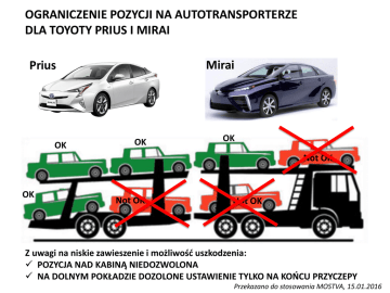 OGRANICZENIE POZYCJI NA AUTOTRANSPORTERZE DLA TOYOTY PRIUS I MIRAI Mirai Prius OK OK OK Not OK OK Not OK Not OK Z uwagi na niskie zawieszenie i możliwość uszkodzenia: POZYCJA NAD KABINĄ NIEDOZWOLONA NA DOLNYM POKŁADZIE DOZOLONE USTAWIENIE TYLKO NA KOŃCU PRZYCZEPY Przekazano do stosowania MOSTVA, 15.01.2016