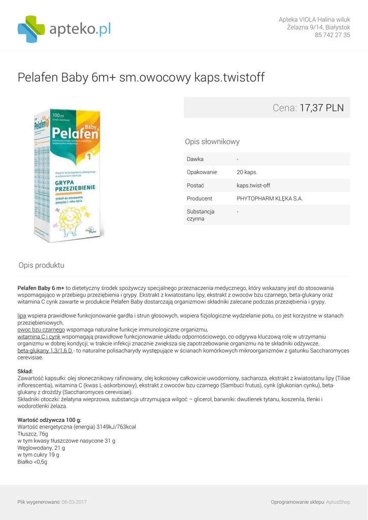 Apteka VIOLA Halina wiluk Żelazna 9/14, Białystok 85 742 27 35 Pelafen Baby 6m+ sm.owocowy kaps.twistoff Cena: 17,37 PLN Opis słownikowy Dawka - Opakowanie 20 kaps. Postać kaps.twist-off Producent PHYTOPHARM KLĘKA S.A. Substancja czynna - Opis produktu Pelafen Baby 6 m+ to dietetyczny środek spożywczy specjalnego przeznaczenia medycznego, który wskazany jest do stosowania wspomagająco w przebiegu przeziębienia i grypy. Ekstrakt z kwiatostanu lipy, ekstrakt z owoców bzu czarnego, beta-glukany oraz witamina C cynk zawarte w produkcie Pelafen Baby dostarczają organizmowi składniki zalecane podczas przeziębienia i grypy. lipa wspiera prawidłowe funkcjonowanie gardła i strun głosowych, wspiera fizjologiczne wydzielanie potu, co jest korzystne w stanach przeziębieniowych, owoc bzu czarnego wspomaga naturalne funkcje immunologiczne organizmu, witamina C i cynk wspomagają prawidłowe funkcjonowanie układu odpornościowego, co odgrywa kluczową rolę w utrzymaniu organizmu w dobrej kondycji; w trakcie infekcji znacznie zwiększa się zapotrzebowanie organizmu na te składniki odżywcze, beta-glukany 1,3/1,6 D - to naturalne polisacharydy występujące w ścianach komórkowych mikroorganizmów z gatunku Saccharomyces cerevisiae. Skład: Zawartość kapsułki: olej słonecznikowy rafinowany, olej kokosowy całkowicie uwodorniony, sacharoza, ekstrakt z kwiatostanu lipy (Tiliae inflorescentia), witamina C (kwas L-askorbinowy), ekstrakt z owoców bzu czarnego (Sambuci frutus), cynk (glukonian cynku), betaglukany z drożdży (Saccharomyces cerevisiae). Składniki otoczki: żelatyna wieprzowa, substancja utrzymująca wilgoć – glicerol, barwniki: dwutlenek tytanu, koszenila, tlenki i wodorotlenki żelaza. Wartość odżywcza 100 g: Wartość energetyczna (energia) 3149kJ/763kcal Tłuszcz, 76g w tym kwasy tłuszczowe nasycone 31 g Węglowodany, 21 g w tym cukry 19 g Białko <0,5g Plik wygenerowano: 06-03-2017 Oprogramowanie sklepu: AptusShop Apteka VIOLA Halina wiluk Żelazna 9/14, Białystok 85 742 27 35 Sól 0 g Witamina C 1475 mg* Cynk (w przeliczeniu na jony) 120 mg* Ekstrakt z kwiatostanu lipy 1567 mg* Ekstrakt z owoców bzu czarnego 1382 mg* ekwiwalent 138,2 g owoców bzu Beta glukany z drożdży (Saccharamyces cerevisiae) 92 mg* * - brak zaleconego dziennego spożycia Dawkowanie: O ile lekarz nie zaleci inaczej: dzieci od 6 m.ż. do 24 m.ż. 1 kapsułka twist-off 2 razy dziennie dzieci powyżej 24 m.ż. 1 kapsułka twist-off 3 razy dziennie. Należy oderwać końcówkę kapsułki, a zawartość wycisnąć bezpośrednio do ust, na łyżeczkę lub dodać do pokarmu. Podczas podawania dziecku preparatu należy zachować ostrożność, aby dziecko nie połknęło otoczki kapsułki. Przeciwwskazania: Nadwrażliwość na którykolwiek ze składników preparatu. Przed zastosowaniem produktu zapoznaj się z informacjami zamieszczonymi na opakowaniu lub ulotce. Plik wygenerowano: 06-03-2017 Powered by TCPDF (www.tcpdf.org) Oprogramowanie sklepu: AptusShop