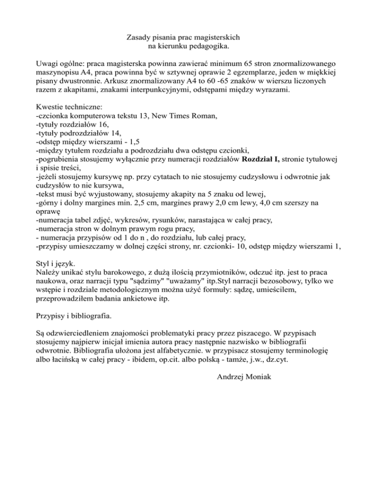Zasady pisania prac magisterskich na kierunku pedagogika. Uwagi ogólne: praca magisterska powinna zawierać minimum 65 stron znormalizowanego maszynopisu A4, praca powinna być w sztywnej oprawie 2 egzemplarze, jeden w miękkiej pisany dwustronnie. Arkusz znormalizowany A4 to 60 -65 znaków w wierszu liczonych razem z akapitami, znakami interpunkcyjnymi, odstępami między wyrazami. Kwestie techniczne: -czcionka komputerowa tekstu 13, New Times Roman, -tytuły rozdziałów 16, -tytuły podrozdziałów 14, -odstęp między wierszami - 1,5 -między tytułem rozdziału a podrozdziału dwa odstępu czcionki, -pogrubienia stosujemy wyłącznie przy numeracji rozdziałów Rozdział I, stronie tytułowej i spisie treści, -jeżeli stosujemy kursywę np. przy cytatach to nie stosujemy cudzysłowu i odwrotnie jak cudzysłów to nie kursywa, -tekst musi być wyjustowany, stosujemy akapity na 5 znaku od lewej, -górny i dolny margines min. 2,5 cm, margines prawy 2,0 cm lewy, 4,0 cm szerszy na oprawę -numeracja tabel zdjęć, wykresów, rysunków, narastająca w całej pracy, -numeracja stron w dolnym prawym rogu pracy, - numeracja przypisów od 1 do n , do rozdziału, lub całej pracy, -przypisy umieszczamy w dolnej części strony, nr. czcionki- 10, odstęp między wierszami 1, Styl i język. Należy unikać stylu barokowego, z dużą ilością przymiotników, odczuć itp. jest to praca naukowa, oraz narracji typu "sądzimy" "uważamy" itp.Styl narracji bezosobowy, tylko we wstępie i rozdziale metodologicznym można użyć formuły: sądzę, umieścilem, przeprowadziłem badania ankietowe itp. Przypisy i bibliografia. Są odzwierciedleniem znajomości problematyki pracy przez piszacego. W pzypisach stosujemy najpierw inicjał imienia autora pracy następnie nazwisko w bibliografii odwrotnie. Bibliografia ułożona jest alfabetycznie. w przypisacz stosujemy terminologię albo łacińską w całej pracy - ibidem, op.cit. albo polską - tamże, j.w., dz.cyt. Andrzej Moniak