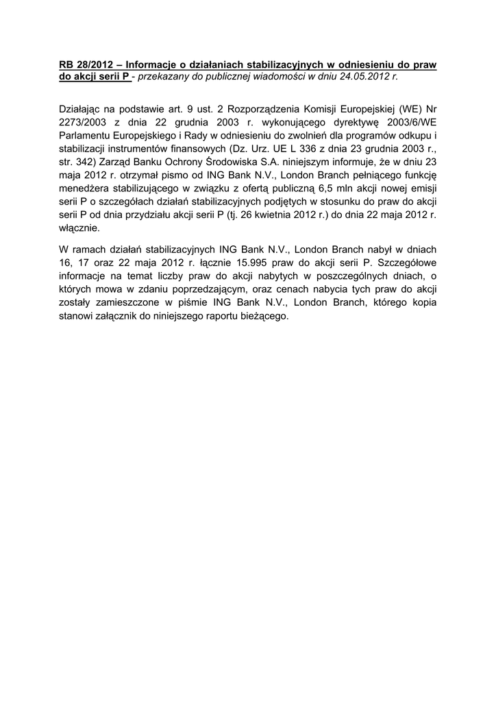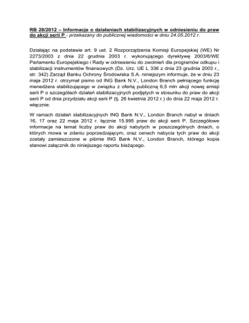 RB 28/2012 – Informacje o działaniach stabilizacyjnych w odniesieniu do praw do akcji serii P - przekazany do publicznej wiadomości w dniu 24.05.2012 r. Działając na podstawie art. 9 ust. 2 Rozporządzenia Komisji Europejskiej (WE) Nr 2273/2003 z dnia 22 grudnia 2003 r. wykonującego dyrektywę 2003/6/WE Parlamentu Europejskiego i Rady w odniesieniu do zwolnień dla programów odkupu i stabilizacji instrumentów finansowych (Dz. Urz. UE L 336 z dnia 23 grudnia 2003 r., str. 342) Zarząd Banku Ochrony Środowiska S.A. niniejszym informuje, że w dniu 23 maja 2012 r. otrzymał pismo od ING Bank N.V., London Branch pełniącego funkcję menedżera stabilizującego w związku z ofertą publiczną 6,5 mln akcji nowej emisji serii P o szczegółach działań stabilizacyjnych podjętych w stosunku do praw do akcji serii P od dnia przydziału akcji serii P (tj. 26 kwietnia 2012 r.) do dnia 22 maja 2012 r. włącznie. W ramach działań stabilizacyjnych ING Bank N.V., London Branch nabył w dniach 16, 17 oraz 22 maja 2012 r. łącznie 15.995 praw do akcji serii P. Szczegółowe informacje na temat liczby praw do akcji nabytych w poszczególnych dniach, o których mowa w zdaniu poprzedzającym, oraz cenach nabycia tych praw do akcji zostały zamieszczone w piśmie ING Bank N.V., London Branch, którego kopia stanowi załącznik do niniejszego raportu bieżącego. Commercial Banking Corporate Finance Londyn, 23 maja 2012 r. Pan Mariusz Klimczak Prezes Zarządu Bank Ochrony Środowiska S.A. Al. Jana Pawła II nr 12 00-950 Warszawa Szanowny Panie Prezesie, Działając na podstawie art. 9 ust. 2 Rozporządzenia Komisji Europejskiej (EC) Nr 2273/2003 z dnia 22 grudnia 2003 wykonującego dyrektywę 2003/6/WE Parlamentu Europejskiego i Rady w odniesieniu do zwolnień dla programów odkupu i stabilizacji instrumentów finansowych oraz zgodnie z zapisami prospektu Banku Ochrony Środowiska S.A. (“Spółka”), ING Bank N.V., London Branch, jako menadżer stabilizujący niniejszym zawiadamia o szczegółach działań stabilizacyjnych podjętych w stosunku do praw do akcji serii P od dnia przydziału tj. od dnia 26 kwietnia 2012 roku do dnia 22 maja 2012 roku włącznie (o ewentualnych kolejnych działaniach stabilizacyjnych poinformujemy odrębnie). W ramach działań stabilizacyjnych dokonano następujących transakcji na Giełdzie Papierów Wartościowych w Warszawie S.A.: Lp. 1 2 3 4 5 6 7 8 9 10 11 12 13 14 15 16 17 18 19 20 21 22 23 24 25 26 27 28 Data 2012-05-16 2012-05-16 2012-05-16 2012-05-16 2012-05-16 2012-05-16 2012-05-16 2012-05-16 2012-05-16 2012-05-16 2012-05-16 2012-05-16 2012-05-16 2012-05-16 2012-05-16 2012-05-16 2012-05-16 2012-05-16 2012-05-16 2012-05-16 2012-05-16 2012-05-16 2012-05-16 2012-05-16 2012-05-16 2012-05-16 2012-05-16 2012-05-16 Godzina Cena 09:14 09:14 09:14 09:14 09:14 09:14 09:14 09:15 09:29 09:37 09:37 09:37 09:37 09:37 09:37 09:37 09:37 09:53 09:53 09:53 09:53 09:53 09:54 09:54 10:17 11:35 11:58 13:10 Liczba akcji 34,89 34,97 34,90 34,50 35,00 35,00 35,00 35,00 34,50 34,98 34,96 34,97 34,95 35,00 34,99 34,99 34,98 35,00 35,00 35,00 34,97 34,99 35,00 35,00 35,00 35,00 35,00 35,00 46 100 97 79 183 374 55 66 889 24 50 63 63 88 50 36 26 465 50 12 41 32 535 24 37 15 24 8 ING Bank N.V., London Branch www.ing.com 60 London Wall, London EC2M 5TQ, United Kingdom Registered in England No. BR000341 T +44 20 7767 1000 Authorised by the Dutch Central Bank F +44 20 7767 7222 Incorporated with limited liability in the Netherlands Page 2/2 29 30 31 32 33 2012-05-16 2012-05-16 2012-05-16 2012-05-16 2012-05-16 Godzina 1 2 3 4 5 6 7 8 9 Data 2012-05-17 2012-05-17 2012-05-17 2012-05-17 2012-05-17 2012-05-17 2012-05-17 2012-05-17 2012-05-17 Data 2012-05-22 2012-05-22 2012-05-22 2012-05-22 2012-05-22 2012-05-22 2012-05-22 2012-05-22 2012-05-22 2012-05-22 2012-05-22 2012-05-22 2012-05-22 2012-05-22 2012-05-22 2012-05-22 2012-05-22 2012-05-22 2012-05-22 Godzina 1 2 3 4 5 6 7 8 9 10 11 12 13 14 15 16 17 18 19 Lp. Lp. ING Bank N.V., London Branch imię i nazwisko: Nathalie Bachich funkcja: Managing Director, Equity Capital Markets 13:19 35,00 13:27 35,00 13:55 35,00 14:13 35,00 14:13 35,00 Razem w dniu 16 maja 2012 Cena 85 50 235 93 1 000 4 995 Liczba akcji 10:26 34,80 10:27 34,70 10:55 35,00 10:58 35,00 14:11 34,90 15:37 34,90 15:59 34,90 16:17 34,90 16:52 34,80 Razem w dniu 17 maja 2012 Cena 09:56 35,00 09:56 35,00 09:56 35,00 09:56 34,98 09:56 35,00 10:13 35,00 12:34 35,00 12:34 35,00 13:21 35,00 13:21 35,00 16:11 35,00 16:14 35,00 16:14 35,00 16:14 35,00 16:14 35,00 17:01 35,00 17:01 35,00 17:01 35,00 17:01 35,00 Razem w dniu 22 maja 2012 3 000 2 000 56 444 135 85 179 101 2 000 8 000 Liczba akcji 25 46 33 30 100 130 29 29 159 69 350 12 488 476 24 24 48 464 464 3000