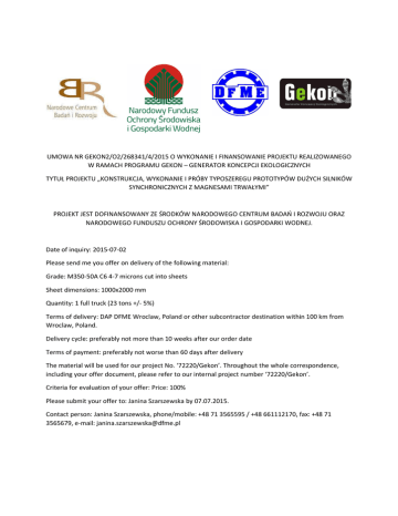 UMOWA NR GEKON2/O2/268341/4/2015 O WYKONANIE I FINANSOWANIE PROJEKTU REALIZOWANEGO W RAMACH PROGRAMU GEKON – GENERATOR KONCEPCJI EKOLOGICZNYCH TYTUŁ PROJEKTU „KONSTRUKCJA, WYKONANIE I PRÓBY TYPOSZEREGU PROTOTYPÓW DUŻYCH SILNIKÓW SYNCHRONICZNYCH Z MAGNESAMI TRWAŁYMI” PROJEKT JEST DOFINANSOWANY ZE ŚRODKÓW NARODOWEGO CENTRUM BADAŃ I ROZWOJU ORAZ NARODOWEGO FUNDUSZU OCHRONY ŚRODOWISKA I GOSPODARKI WODNEJ. Date of inquiry: 2015-07-02 Please send me you offer on delivery of the following material: Grade: M350-50A C6 4-7 microns cut into sheets Sheet dimensions: 1000x2000 mm Quantity: 1 full truck (23 tons +/- 5%) Terms of delivery: DAP DFME Wroclaw, Poland or other subcontractor destination within 100 km from Wroclaw, Poland. Delivery cycle: preferably not more than 10 weeks after our order date Terms of payment: preferably not worse than 60 days after delivery The material will be used for our project No. ‘72220/Gekon’. Throughout the whole correspondence, including your offer document, please refer to our internal project number ‘72220/Gekon’. Criteria for evaluation of your offer: Price: 100% Please submit your offer to: Janina Szarszewska by 07.07.2015. Contact person: Janina Szarszewska, phone/mobile: +48 71 3565595 / +48 661112170, fax: +48 71 3565679, e-mail: [email protected]