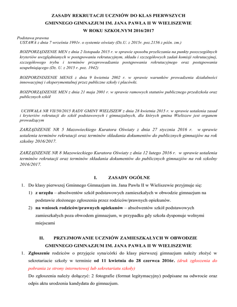 ZASADY REKRUTACJI UCZNIÓW DO KLAS PIERWSZYCH GMINNEGO GIMNAZJUM IM. JANA PAWŁA II W WIELISZEWIE W ROKU SZKOLNYM 2016/2017 Podstawa prawna USTAWA z dnia 7 września 1991r. o systemie oświaty (Dz.U. z 2015r. poz.2156 z późn. zm.) ROZPORZĄDZENIE MEN z dnia 2 listopada 2015 r. w sprawie sposobu przeliczania na punkty poszczególnych kryteriów uwzględnianych w postępowaniu rekrutacyjnym, składu i szczegółowych zadań komisji rekrutacyjnej, szczegółowego trybu i terminów przeprowadzania postępowania rekrutacyjnego oraz postępowania uzupełniającego (Dz. U. z 2015 r. poz. 1942) ROZPORZNDZENIE MENiS z dnia 9 kwietnia 2002 r. w sprawie warunków prowadzenia działalności innowacyjnej i eksperymentalnej przez publiczne szkoły i placówki. ROZPORZĄDZENIE MEN z dnia 21 maja 2001 r. w sprawie ramowych statutów publicznego przedszkola oraz publicznych szkół UCHWAŁA NR VII/50/2015 RADY GMINY WIELISZEW z dnia 28 kwietnia 2015 r. w sprawie ustalenia zasad i kryteriów rekrutacji do szkół podstawowych i gimnazjalnych, dla których gmina Wieliszew jest organem prowadzącym ZARZĄDZENIE NR 5 Mazowieckiego Kuratora Oświaty z dnia 27 stycznia 2016 r. w sprawie ustalenia terminów rekrutacji oraz terminów składania dokumentów do publicznych gimnazjów na rok szkolny 2016/2017. ZARZĄDZENIE NR 8 Mazowieckiego Kuratora Oświaty z dnia 12 lutego 2016 r. w sprawie ustalenia terminów rekrutacji oraz terminów składania dokumentów do publicznych gimnazjów na rok szkolny 2016/2017. I. ZASADY OGÓLNE 1. Do klasy pierwszej Gminnego Gimnazjum im. Jana Pawła II w Wieliszewie przyjmuje się: 1) z urzędu – absolwentów szkół podstawowych zamieszkałych w obwodzie gimnazjum na podstawie złożonego zgłoszenia przez rodziców/prawnych opiekunów. 2) na wniosek rodziców/prawnych opiekunów – absolwentów szkół podstawowych zamieszkałych poza obwodem gimnazjum, w przypadku gdy szkoła dysponuje wolnymi miejscami II. PRZYJMOWANIE UCZNIÓW ZAMIESZKAŁYCH W OBWODZIE GMINNEGO GIMNAZJUM IM. JANA PAWŁA II W WIELISZEWIE 1. Zgłoszenie rodziców o przyjęcie syna/córki do klasy pierwszej gimnazjum należy złożyć w sekretariacie szkoły w terminie od 11 kwietnia do 28 czerwca 2016r. (druk zgłoszenia do pobrania ze strony internetowej lub sekretariatu szkoły) Do zgłoszenia należy dołączyć: 2 fotografie (format legitymacyjny) podpisane na odwrocie oraz odpis aktu urodzenia kandydata do gimnazjum. 2. Nie później niż na miesiąc przed zakończeniem zajęć rocznych zajęć dydaktycznowychowawczych dyrektor gimnazjum sporządza listę uczniów klas szóstych szkół podstawowych zamieszkałych w obwodzie gimnazjum, które zostaną przyjęci z urzędu do klasy pierwszej. 3. Do klasy pierwszej Gminnego Gimnazjum im. Jana Pawła II w Wieliszewie przyjmuje się absolwentów szkoły podstawowej posiadających świadectwo ukończenia szkoły podstawowej oraz zaświadczenie o szczegółowych wynikach sprawdzianu zewnętrznego. 4. Świadectwo ukończenia szkoły podstawowej i zaświadczenie o szczegółowych wynikach sprawdzianu zewnętrznego należy złożyć do 28 czerwca 2016r. – do godziny 15.00 w sekretariacie szkoły. II. PRZYJMOWANIE UCZNIÓW ZAMIESZKAŁYCH POZA OBWODEM GMINNEGO GIMNAZJUM IM. JANA PAWŁA II W WIELISZEWIE 1. Kandydaci zamieszkali poza obwodem Gminnego Gimnazjum im. Jana Pawła II w Wieliszewie mogą być przyjęci do klasy pierwszej po przeprowadzeniu postępowania rekrutacyjnego, gdy gimnazjum nadal dysponuje wolnymi miejscami, na wniosek rodziców (prawnych opiekunów) kandydata. (druk wniosku do pobrania ze strony internetowej lub sekretariatu szkoły) 2. W przypadku, gdy liczba kandydatów zamieszkałych poza obwodem Gminnego Gimnazjum im. Jana Pawła II w Wieliszewie jest większa niż liczba wolnych miejsc, którymi dysponuje gimnazjum, kandydatów przyjmuje się na podstawie następujących kryteriów: a) Niepełnosprawność kandydata – 5 pkt. b) W szkole spełnia obowiązek szkolny rodzeństwo kandydata – 5 pkt. c) Miejsce pracy rodziców/prawnych opiekunów znajduje się w obwodzie szkoły – 3pkt. d) W obwodzie szkoły zamieszkują krewni kandydata (babcia, dziadek) wspierający rodziców/prawnych opiekunów w zapewnieniu mu należytej opieki - 2 pkt. 3. Wniosek, o którym mowa w pkt. 1 należy złożyć w sekretariacie szkoły w terminie: - do klasy ogólnej od 11 kwietnia do 28 czerwca 2016r. - do klasy z innowacją „Języki obce oknem na świat” od 11 kwietnia do 28 czerwca 2016r. - do klasy sportowej od 11 kwietnia do 10 maja 2016r. 4. Do wniosku należy dołączyć a) 2 fotografie (format legitymacyjny) podpisane na odwrocie b) odpis aktu urodzenia kandydata oraz a) kopię orzeczenia o niepełnosprawności kandydata b) oświadczenie o spełnianiu w szkole obowiązku szkolnego rodzeństwa kandydata c) kopię umowy o pracę (do wglądu) potwierdzającą, że miejsce pracy rodziców/prawnych opiekunów kandydata znajduje się w obwodzie szkoły d) oświadczenie o miejscu zamieszkania w obwodzie szkoły krewnych kandydata (babcia, dziadek) wspierających rodziców/prawnych opiekunów w zapewnieniu mu należytej opieki 5. O przyjęciu kandydata spoza obwodu szkoły do klasy pierwszej gimnazjum decyduje uzyskana przez niego lokata na liście kandydatów do Gminnego Gimnazjum im. Jana Pawła II. Przyjmowani są kandydaci z najwyższą liczbą punktów do wyczerpania wolnych miejsc. 6. Kandydaci do gimnazjum, którzy są laureatami lub finalistami ogólnopolskiej olimpiady przedmiotowej lub laureatami konkursu przedmiotowego o zasięgu wojewódzkim lub ponadwojewódzkim, przyjmowani są do gimnazjum w pierwszej kolejności. 7. Świadectwo ukończenia szkoły podstawowej i zaświadczenie o szczegółowych wynikach sprawdzianu zewnętrznego należy złożyć do 28 czerwca 2016r. – do godziny 15.00 w sekretariacie szkoły. 8. Komisja rekrutacyjna dokonuje weryfikacji wniosków o przyjęcie do gimnazjum i dokumentów potwierdzających spełnienie 