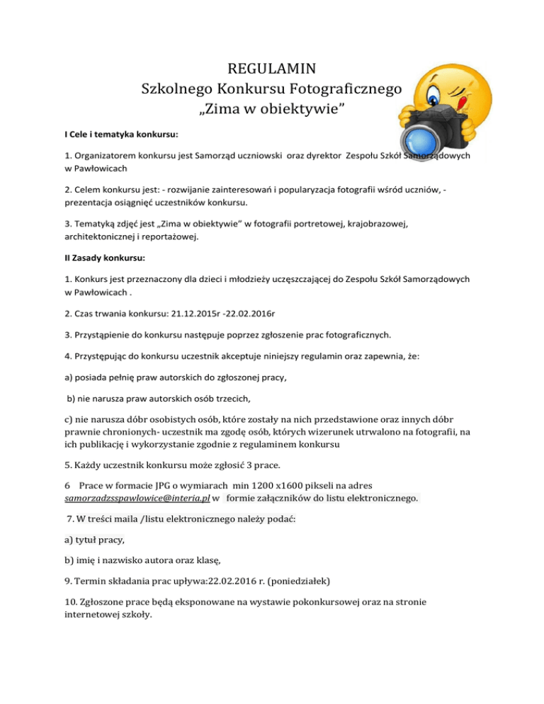 REGULAMIN Szkolnego Konkursu Fotograficznego „Zima w obiektywie” I Cele i tematyka konkursu: 1. Organizatorem konkursu jest Samorząd uczniowski oraz dyrektor Zespołu Szkół Samorządowych w Pawłowicach 2. Celem konkursu jest: - rozwijanie zainteresowań i popularyzacja fotografii wśród uczniów, prezentacja osiągnięć uczestników konkursu. 3. Tematyką zdjęć jest „Zima w obiektywie” w fotografii portretowej, krajobrazowej, architektonicznej i reportażowej. II Zasady konkursu: 1. Konkurs jest przeznaczony dla dzieci i młodzieży uczęszczającej do Zespołu Szkół Samorządowych w Pawłowicach . 2. Czas trwania konkursu: 21.12.2015r -22.02.2016r 3. Przystąpienie do konkursu następuje poprzez zgłoszenie prac fotograficznych. 4. Przystępując do konkursu uczestnik akceptuje niniejszy regulamin oraz zapewnia, że: a) posiada pełnię praw autorskich do zgłoszonej pracy, b) nie narusza praw autorskich osób trzecich, c) nie narusza dóbr osobistych osób, które zostały na nich przedstawione oraz innych dóbr prawnie chronionych- uczestnik ma zgodę osób, których wizerunek utrwalono na fotografii, na ich publikację i wykorzystanie zgodnie z regulaminem konkursu 5. Każdy uczestnik konkursu może zgłosić 3 prace. 6 Prace w formacie JPG o wymiarach min 1200 x1600 pikseli na adres [email protected] w formie załączników do listu elektronicznego. 7. W treści maila /listu elektronicznego należy podać: a) tytuł pracy, b) imię i nazwisko autora oraz klasę, 9. Termin składania prac upływa:22.02.2016 r. (poniedziałek) 10. Zgłoszone prace będą eksponowane na wystawie pokonkursowej oraz na stronie internetowej szkoły. III Zasady rozstrzygnięcia konkursu: 1. Zgłoszone zdjęcia zostaną ocenione przez jury w składzie powołanym przez organizatora. 2. Ogłoszenie wyników nastąpi na początku marca 3. Jury zastrzega sobie prawo do przyznania wyróżnień. 4. Organizator nie zwraca zgłoszonych prac. IV Postanowienia końcowe: 1. Udział w konkursie jest równoznaczny z wyrażaniem zgody na wykorzystanie danych osobowych uczestnika. 2. Organizator nie ponosi odpowiedzialności za naruszenie praw autorskich osób trzecich przez uczestników konkursu. 3. Organizator zastrzega sobie prawo do przedłużenia konkursu bez podania przyczyny. 4. Niniejszy Regulamin dostępny jest na stronie internetowej szkoły.
