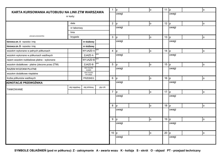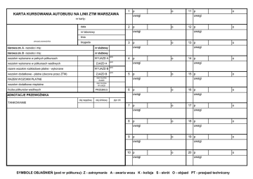KARTA KURSOWANIA AUTOBUSU NA LINII ZTM WARSZAWA 1 p uwagi o 11 p uwagi o 2 p uwagi o 12 p uwagi o 3 p uwagi o 13 p uwagi o 4 p uwagi o 14 p uwagi o 5 p uwagi o 15 p uwagi o 6 p uwagi o 16 p uwagi o 7 p uwagi o 17 p uwagi o 8 p uwagi o 18 p uwagi o 9 p uwagi o 19 p uwagi o 10 p uwagi o 20 p uwagi o nr karty: data nr taborowy linia pieczęć przewoźnika brygada kierowca zm. A - nazwisko i imię: nr służbowy kierowca zm. B - nazwisko i imię: nr służbowy wozokm wykonane w pełnych półkursach WYJAZD A wozokm wykonane w półkursach wadliwych ZJAZD A razem wozokm rozkładowe płatne - wykonane WYJAZD B wozokm dodatkowe - płatne (zlecone przez ZTM) ZJAZD B RAZEM WOZOKM PŁATNE stan licznika ZJAZD wozokm dodatkowe niepłatne stan licznika WYJAZD liczba półkursów wadliwych godz. godz. godz. godz. PRZEBIEG ADNOTACJE PRZEWOŹNIKA olej napędowy olej silnikowy płyn chł. TANKOWANIE SYMBOLE OBJAŚNIEŃ (pod nr półkursu): Z - zatrzymanie A - awaria wozu K - kolizja S - skrót O - objazd PT - przejazd techniczny 21 p uwagi o 31 p uwagi o 41 p uwagi o 51 p uwagi o 22 p uwagi o 32 p uwagi o 42 p uwagi o 52 p uwagi o 23 p uwagi o 33 p uwagi o 43 p uwagi o 53 p uwagi o 24 p uwagi o 34 p uwagi o 44 p uwagi o 54 p uwagi o 25 p uwagi o 35 p uwagi o 45 p uwagi o 55 p uwagi o 26 p uwagi o 36 p uwagi o 46 p uwagi o 56 p uwagi o 27 p uwagi o 37 p uwagi o 47 p uwagi o 57 p uwagi o 28 p uwagi o 38 p uwagi o 48 p uwagi o 58 p uwagi o 29 p uwagi o 39 p uwagi o 49 p uwagi o 59 p uwagi o 30 p uwagi o 40 p uwagi o 50 p uwagi o 60 p uwagi o SYMBOLE OBJAŚNIEŃ (pod nr półkursu): Z - zatrzymanie A - awaria wozu K - kolizja S - skrót O - objazd PT - przejazd techniczny