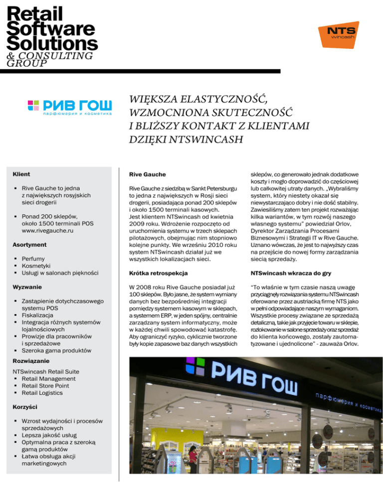 WIĘKSZA ELASTYCZNOŚĆ, WZMOCNIONA SKUTECZNOŚĆ I BLIŻSZY KONTAKT Z KLIENTAMI DZIĘKI NTSWINCASH Klient Rive Gauche to jedna z największych rosyjskich sieci drogerii Ponad 200 sklepów, około 1500 terminali POS www.rivegauche.ru Asortyment Perfumy Kosmetyki Usługi w salonach piękności Wyzwanie Zastąpienie dotychczasowego systemu POS Fiskalizacja Integracja różnych systemów lojalnościowych Prowizje dla pracowników i sprzedażowe Szeroka gama produktów Rozwiązanie NTSwincash Retail Suite Retail Management Retail Store Point Retail Logistics Korzyści Wzrost wydajności i procesów sprzedażowych Lepsza jakość usług Optymalna praca z szeroką gamą produktów Łatwa obsługa akcji marketingowych Rive Gauche z siedzibą w Sankt Petersburgu to jedna z największych w Rosji sieci drogerii, posiadająca ponad 200 sklepów i około 1500 terminali kasowych. Jest klientem NTSwincash od kwietnia 2009 roku. Wdrożenie rozpoczęto od uruchomienia systemu w trzech sklepach pilotażowych, obejmując nim stopniowo kolejne punkty. We wrześniu 2010 roku system NTSwincash działał już we wszystkich lokalizacjach sieci. sklepów, co generowało jednak dodatkowe koszty i mogło doprowadzić do częściowej lub całkowitej utraty danych. „Wybraliśmy system, który niestety okazał się niewystarczająco dobry i nie dość stabilny. Zawiesiliśmy zatem ten projekt rozważając kilka wariantów, w tym rozwój naszego własnego systemu” powiedział Orlov, Dyrektor Zarządzania Procesami Biznesowymi i Strategii IT w Rive Gauche. Uznano wówczas, że jest to najwyższy czas na przejście do nowej formy zarządzania siecią sprzedaży. Krótka retrospekcja NTSwincash wkracza do gry W 2008 roku Rive Gauche posiadał już 100 sklepów. Było jasne, że system wymiany danych bez bezpośredniej integracji pomiędzy systemem kasowym w sklepach, a systemem ERP, w jeden spójny, centralnie zarządzany system informatyczny, może w każdej chwili spowodować katastrofę. Aby ograniczyć ryzyko, cyklicznie tworzone były kopie zapasowe baz danych wszystkich “To właśnie w tym czasie naszą uwagę przyciągnęły rozwiązania systemu NTSwincash oferowane przez austriacką firmę NTS jako w pełni odpowiadające naszym wymaganiom. Wszystkie procesy związane ze sprzedażą detaliczną, takie jak przyjęcie towaru w sklepie, rozlokowanie w salone sprzedaży oraz sprzedaż do klienta końcowego, zostały zautomatyzowane i ujednolicone” - zauważa Orlov. Rive Gauche System NTSwincash zintegrowano z systemem ERP dzięki wprowadzonym interfejsom. Zastosowano również elastyczne ramy do transmisji danych dla centrali, czego brakowało w poprzednim systemie. „Teraz widzimy zarówno stan sprzedaży i zatowarowania w sklepach na zasadzie on-line - opóźnienie wynosi zaledwie 5 do 15 minut. Dla sieci sprzedaży z wysokim wskaźnikiem obrotów, takiej jak Rive Gauche jest to niezwykle istotne. NTS - Najważniejsze informacje NTS rozwija i wdraża kompleksowe rozwiązania branżowe dla sieci handlowych. System NTSwincash Retail Management zapewnia funkcjonalności szczególnie istotne dla sieci franczyzowych oraz posiadających rozbudowaną strukturę, takie jak komfortowe centralne zarządzanie sklepami, czy efektywne i oszczędne zarządzanie towarem. Rozwiązania NTSwincash są stosowane przez sieci handlowe z branży telekomunikacji, RTV/AGD, czy artykułów luksusowych, w krajach Europy, Rosji, na Bliskim Wschodzie i w Afryce. System NTSwincash jest rozwiązaniem, na którym polegają takie firmy jak Vodafone, Orange, Telefónica, Etisalat, Swisscom, czy M.video. Płynna integracja System NTSwincash w znacznym stopniu przyczynił się do sukcesu, jaki odnieśliśmy we włączeniu kupionych przez nas w 2011 roku drogerii Douglas Rivoli do jednolitej struktury sieci, zachowując cały czas ciągłość pracy” - mówi Orlov. “W Rive Gauche, szczególnie zadowoleni jesteśmy z tego, że wprowadzenie NTSwincash pozwoliło rozwinąć skrzydła naszemu Działowi Marketingu. Dzięki optymalnej integracji z naszym systemem CRM oraz systemami lojalnościowymi, możemy służyć naszym klientom poziomem usług, które po prostu nie były wcześniej osiągalne. Rozwiązania te dają nam większą elastyczność, pozwalają być bliżej klientów i łatwiej odpowiadać na ich potrzeby.” - twierdzi specjalista IT. W ofercie NTSwincash znajdują się: Rozwiązania dla punktów sprzedaży detalicznej i punktów obsługi serwisowej Centralne zarządzanie oddziałami Wsparcie sprzedaży wielokanałowej Centralne zarządzanie danymi Obsługa posprzedażowa Logistyka oddziałów z centralnym zarządzaniem przepływu towaru Sprzedaż i obsługa mobilna Ustandaryzowane interfejsy dla systemów ERP, CRM, bilingowania itp. Informacje dla zarządu dostępne centralnie Zarządzanie prowizjami Indywidualne rozwiązania dla sklepów “ROZWIĄZANIA SYSTEMU NTSWINCASH PRZYCIĄGNĘŁY NASZĄ UWAGĘ JAKO W PEŁNI ODPOWIADAJĄCE NASZYM WYMAGANIOM” Andrey Orlov / Dyrektor ds. Zarządzania Procesami Biznesowymi i Strategią IT Rive Gauche NTSwincash Commit Polska Sp. z o.o. / ul. Załęska 44 / 35 - 322 Rzeszów / www.commit.pl 850 74 01