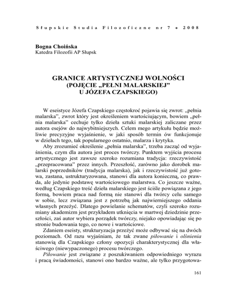 S ł u p s k i e S t u d i a F i l o z o f i c z n e n r 7 * 2 0 0 8 Bogna Choińska Katedra Filozofii AP Słupsk GRANICE ARTYSTYCZNEJ WOLNOŚCI (POJĘCIE „PEŁNI MALARSKIEJ” U JÓZEFA CZAPSKIEGO) W eseistyce Józefa Czapskiego częstokroć pojawia się zwrot: „pełnia malarska”, zwrot który jest określeniem wartościującym, bowiem „pełnia malarska” cechuje tylko dzieła sztuki malarskiej zaliczane przez autora esejów do najwybitniejszych. Celem mego artykułu będzie moŜliwie precyzyjne wyjaśnienie, w jaki sposób termin ów funkcjonuje w dziełach tego, tak popularnego ostatnio, malarza i krytyka. Aby zrozumieć określenie „pełnia malarska”, trzeba zacząć od wyjaśnienia, czym dla autora jest proces twórczy. Punktem wyjścia procesu artystycznego jest zawsze szeroko rozumiana tradycja: rzeczywistość „przepracowana” przez innych. Przeszłość, zarówno jako dorobek malarski poprzedników (tradycja malarska), jak i rzeczywistość juŜ gotowa, zastana, ustrukturyzowana, stanowi dla autora konieczną, co prawda, ale jedynie podstawę wartościowego malarstwa. Co jeszcze waŜne, według Czapskiego treść dzieła malarskiego jest ściśle powiązana z jego formą, bowiem praca nad formą nie stanowi dla twórcy celu samego w sobie, lecz związana jest z potrzebą jak najwierniejszego oddania własnych przeŜyć. Dlatego powielanie schematów, czyli szeroko rozumiany akademizm jest przykładem utknięcia w martwej dziedzinie przeszłości, zaś autor wybiera porządek twórczy, niejako opowiadając się po stronie budowania tego, co nowe i wartościowe. Zdaniem eseisty, strukturyzacja przeŜyć moŜe odbywać się na dwóch poziomach. Od razu wyjaśniam, Ŝe tak zwane piłowanie i olśnienia stanowią dla Czapskiego człony opozycji charakterystycznej dla właściwego (niewypaczonego) procesu twórczego. Piłowanie jest związane z poszukiwaniem odpowiedniego wyrazu i pracą świadomości, stanowi ono bardzo waŜne, ale tylko przygotowa161 nie do olśnień. W swoich kajetach Czapski zapisał: „Analiza naturalistyczna będzie zawsze tą «niŜszą modlitwą», do której będę miał obowiązek wracać z całą pokorą, gdy to widzenie «wyŜsze», całościowe będzie mnie opuszczało, czy gorzej – będzie się spłycało, schematyzowało, tracąc zazębienie o świat widzialny”1. Tak więc dwie grupy dzieł wyznacza opozycja piłowanie (praca, szukanie doskonałości wyrazu) – olśnienia (nieświadome poddanie się „szokowi z zewnątrz”): martwe natury i pejzaŜe to przede wszystkim efekty wytęŜonych ćwiczeń, uporczywe i świadome działania zmierzające do scalenia własnej podmiotowości (do których to ćwiczeń Czapski, jak wielokrotnie pisał, często się po prostu zmuszał, więc z natchnieniem nie mających wiele wspólnego), a tak zwany teatr codzienności to grupa obrazów wizyjnych, natchnionych, doskonałych2. Czapski pisał: „Jeśli chodzi o mnie, długo męczyła mnie ta dwoistość podejścia – jedno analityczne, rozumowe, wyrastające z tradycji Holendrów i do pewnego stopnia z pointilistów i drugie, wariackie, dla siebie samego nieoczekiwane – prawdziwy skok w przepaść”3. Za konieczność pracy nad dziełem odpowiada ludzka niedoskonałość, poniewaŜ chaotyczność i zarazem bezsensowność świata, a takŜe róŜnorakie wpływy z dziedziny kulturowej przeszłości, które umoŜliwiają powierzchowne i zbyt łatwe uporządkowanie własnych doznań, powodują niepewność i sprowadzają artystę na drogę poszukiwań, „kombinacji”. Natomiast tym, co w dziele najbardziej wartościowe, jest element sakralnej wieczności determinujący widzenie. Owo widzenie Czapski nazywa „potwornym zagęszczeniem realności”, jest to „nagie” spojrzenie na naturę, tak świeŜe, jak gdyby widziało się ją po raz pierwszy. Wydaje się, Ŝe za doskonałość, za „pełnię” malarskiego wyrazu bardziej odpowiada ów drugi, moŜna powiedzieć: obiektywny czynnik, bowiem to dzięki nadprzyrodzonej łasce „artysta nie jest wolny robić co mu się podoba”4. Piłowanie natury to zatem pojęcie, którym Czapski określa pracę malarską będącą przygotowaniem do przyjęcia nagrody za tę pracę: daru łaski – olśnienia. ——————— 1 J. Czapski, Wyrwane strony, red. J. Pollakówna, Lozanna 1993, s. 17. 2 Zdaniem W. Karpińskiego późna twórczość malarska Czapskiego łączy obie tendencje i jest wyrazem tak upragnionej przez malarza pełni, por. W. Karpiński, Malarstwo Czapskiego. W: Czapski i krytycy. Antologia tekstów, red. M. Kitowska-Łysiak, M. Ujma, Lublin 1996. 3 J. Czapski, Patrząc, Kraków 1996, s. 121. 4 Słowa Matisse’a, podaję za: J. Czapski, Patrząc..., s. 357. 162 Konotacje pojęcia łaski nieodmiennie bliskie są mistyce. Wydaje się, Ŝe dla autora Patrząc mistyka i twórczość artystyczna są sobie bliskie, niemniej wyraźnie odróŜnia on te dwie dziedziny. By przybliŜyć pojęcie mistycznej łaski, naleŜy sięgnąć do koncepcji iluminacji. Augustyńska teoria iluminacji ma mnóstwo róŜnych interpretacji, bowiem zawierające wiele niejednoznacznych pojęć teksty, które pozostawił po sobie średniowieczny filozof uniemoŜliwiają wysnucie jednej, najwłaściwszej koncepcji. Jak pisze Stanisław Kowalczyk, od momentu pojawienia się interpretacyjnych pism Piemontesa za istotę iluminacji przyjęło się uwaŜać oświecenie człowieka przez Boga, które pozwala odkryć waŜne prawdy w samym sobie. Dotarcie do prawd ukrytych we własnej duszy umoŜliwia swoiste doświadczenie wewnętrzne poznającego, którego nabywa się podczas relacji występujących pomiędzy Bogiem i człowiekiem. Prawda nie jest mechanizmem funkcji władz poznawczych, lecz efektem egzystencjalnej postawy człowieka wobec Ŝycia. Co za tym idzie, dotarcie do niej nie dla kaŜdego jest moŜliwe, gdyŜ człowiek prawy duchowo poznaje ją znacznie lepiej. Iluminacja to zatem nie tylko nadzwyczajna i