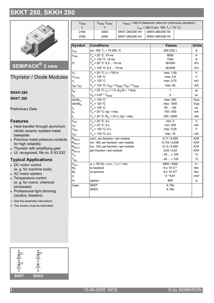 SKKT 280, SKKH 280 SEMIPACK® 3 new Thyristor / Diode Modules SKKH 280 SKKT 280 Preliminary Data Features ! "# $#% Typical Applications &' ) * +' ) , * ) * 1) - 2) SKKT 1 ./-0 .//0 .&/0 . %744 . %444 1/0- 2 334 + )5 , * 1+. 2 %64 + ) 7648 2 9: ;'* -<< %64=%4! 3 -<< %64=%4! 3 %#44 %%44 -<< %64=%%! 3 -<< %64=%%! 3 Symbol Conditions Values Units 1+. 7648 2 9: )6$* ;' %64 )%$% * + 1-0 ,> 2 %$ ;'8 74 ,> 2 7%$ ;'8 74 ,> 2 %$ ;'8 6# 74 6$44 9$44 #"7444 + + +? ,> 2 7%$ ;'8 6# %67444 +? 5 7$$ 5 4: 5 49$ . . A ? 74 . .)@* ,> 2 %$ ;'8 1 2 9$4 + ,> 2 7%$ ;' ,> 2 7%$ ;' 1&&8 1/& ,> 2 7%$ ;'8 ./& 2 .//08 .&& 2 .&/0 5 "4 + ,> 2 %$ ;'8 1B 2 7 +8 B= 2 7 +=C 7 C .& 2 4"9 D .&/0 % C )=* ),=* E 1 ,> 2 7%$ ;' ,> 2 7%$ ;' ,> 2 7%$ ;' ,> 2 %$ ;'8 = 5 5 %$4 5 7444 $4 7$4 7$4 = $44 +=C .=C C + 1 ,> 2 %$ ;'8 /B 2 ## A8 = 5 #44 = %444 + .B 1B .B& ,> 2 %$ ;'8 ,> 2 %$ ;'8 ,> 2 7%$ ;'8 # %44 5 4%$ . + . 1B& ,> 2 7%$ ;'8 5 74 + /)>F* /)>F* /)>F* /)F* ,> 8 = 7648 = 7%48 = = 477 = 44$$ 477" = 44$6 47# = 44"$ 443 = 44% F 34 H 7%$ <=G <=G <=G <=G ;' F 34 . 0 0 $4 8 8 7 = 7 J ' H 7%$ ;' 3644 = 3444 : K 7$ L7* : K 7$ L%* $ D :67 .I M M =? 5 "44 -<< -<< + 9# + 9" SKKH 15-06-2005 NOS © by SEMIKRON SKKT 280, SKKH 280 Fig. 1L Power dissipation per thyristor vs. on-state current Fig. 1R Power dissipation per thyristor vs. ambient temp. Fig. 2L Power dissipation per module vs. rms current Fig. 2R Power dissipation per module vs. case temp. Fig. 3L Power dissipation of two modules vs. direct current Fig. 3R Power dissipation of two modules vs. case temp. 2 15-06-2005 NOS © by SEMIKRON SKKT 280, SKKH 280 Fig. 4L Power dissipation of three modules vs. direct and rms current Fig. 4R Power dissipation of three modules vs. case temp. Fig. 5 Recovered charge vs. current decrease Fig. 6 Transient thermal impedance vs. time Fig. 7 On-state characteristics Fig. 8 Surge overload current vs. time 3 15-06-2005 NOS © by SEMIKRON SKKT 280, SKKH 280 Fig. 9 Gate trigger characteristics Dimensions in mm ' + 9" -<< ' + 9# )-<<* This technical information specifies semiconductor devices but promises no characteristics. No warranty or guarantee expressed or implied is made regarding delivery, performance or suitability. 4 15-06-2005 NOS © by SEMIKRON
