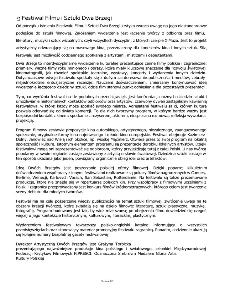9 Festiwal Filmu i Sztuki Dwa Brzegi Od początku istnienia Festiwalu Filmu i Sztuki Dwa Brzegi krytyka zwraca uwagę na jego niestandardowe podejście do sztuki filmowej. Założeniem wydarzenia jest łączenie twórcy z odbiorcą oraz filmu, literatury, muzyki i sztuk wizualnych, czyli wszystkich dyscyplin, z których czerpie X Muza. Jest to projekt artystyczny odwracający się na masowego kina, przeznaczony dla koneserów kina i innych sztuk. Siłą festiwalu jest możliwość codziennego spotkania z artystami, mistrzami i debiutantami. Dwa Brzegi to interdyscyplinarne wydarzenie kulturalne prezentujące cenne filmy polskie i zagraniczne: premiery, ważne filmy roku minionego i obrazy, które miały kluczowe znaczenie dla rozwoju światowej kinematografii, jak również spektakle teatralne, wystawy, koncerty i wydarzenia innych dziedzin. Dotychczasowe edycje festiwalu spotkały się z dużym zainteresowanie publiczności i mediów, zebrały niejednokrotnie entuzjastyczne recenzje. Nauczeni doświadczeniem, zmierzamy kontynuować ideę wydarzenie łączącego dziedziny sztuki, gdzie film stanowi punkt odniesienia dla pozostałych prezentacji. Tym, co wyróżnia festiwal na tle podobnych przedsięwzięć, jest konfrontacja różnych dziedzin sztuki i umożliwianie nieformalnych kontaktów odbiorców oraz artystów: czerwony dywan zastąpiliśmy kawiarnią festiwalową, w której każdy może spotkać swojego mistrza. Adresatami festiwalu są ci, którym kultura pozwala oderwać się od świata komercji. To dla nich tworzymy program, w którym bardzo ważny jest bezpośredni kontakt z kinem: spotkanie z reżyserem, aktorem, niespieszna rozmowa, refleksja wywołana projekcją. Program filmowy zestawia propozycje kina autorskiego, artystycznego, niezależnego, zaangażowanego społecznie, oryginalne formy kina najnowszego i młode kino europejskie. Festiwal obejmuje Kazimierz Dolny, Janowiec nad Wisłą i ich okolice, np. wioskę Męćmierz. Otwiera przez to swój program na lokalną społeczność i kulturę. Istotnym elementem programu są prezentacje dorobku lokalnych artystów. Dzięki festiwalowi mogą oni zaprezentować się odbiorcom, którzy przyjeżdżają tutaj z całej Polski. U nas twórca popularny w swoim regionie zostaje zestawiony z artystą o sławie światowej. Dziedzina sztuki zostaje w ten sposób ukazana jako jeden, powiązany organicznie obieg idei oraz artefaktów. Ideą Dwóch Brzegów jest poszerzanie polskiej oferty filmowej. Dzięki popartej kilkuletnim doświadczeniem współpracy z innymi festiwalami realizowane są pokazy filmów nagrodzonych w Cannes, Berlinie, Wenecji, Karlovych Varach, San Sebastian, Rotterdamie. Na festiwalu są także prezentowane produkcje, które nie znajdą się w repertuarze polskich kin. Przy współpracy z filmowymi uczelniami z Polski i zagranicy przeprowadzany jest konkurs filmów krótkometrażowych, którego celem jest tworzenie sceny debiutu dla młodych twórców. Festiwal ma na celu poszerzenie wiedzy publiczności na temat sztuki filmowej, zwrócenie uwagi na te obszary kreacji twórczej, które składają się na dzieło filmowe: literaturę, sztuki plastyczne, muzykę, fotografię. Program budowany jest tak, by widz miał szansę po obejrzeniu filmu dowiedzieć się czegoś więcej o jego kontekście historycznym, kulturowym, literackim, plastycznym. Wydarzeniom festiwalowym towarzyszy polsko-angielski katalog informujący o wszystkich przedsięwzięciach oraz stanowiący materiał promocyjny festiwalu zagranicą. Ponadto, codziennie ukazują się kolejne numery bezpłatnej gazety festiwalowej Dyrektor Artystyczną Dwóch Brzegów jest Grażyna Torbicka prezentującego najważniejsze produkcje kina polskiego i światowego, członkini Międzynarodowej Federacji Krytyków Filmowych FIPRESCI. Odznaczona Srebrnym Medalem Gloria Artis Kultury Polskiej Strona 1/2 Strona 2/2 Powered by TCPDF (www.tcpdf.org)