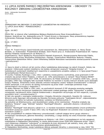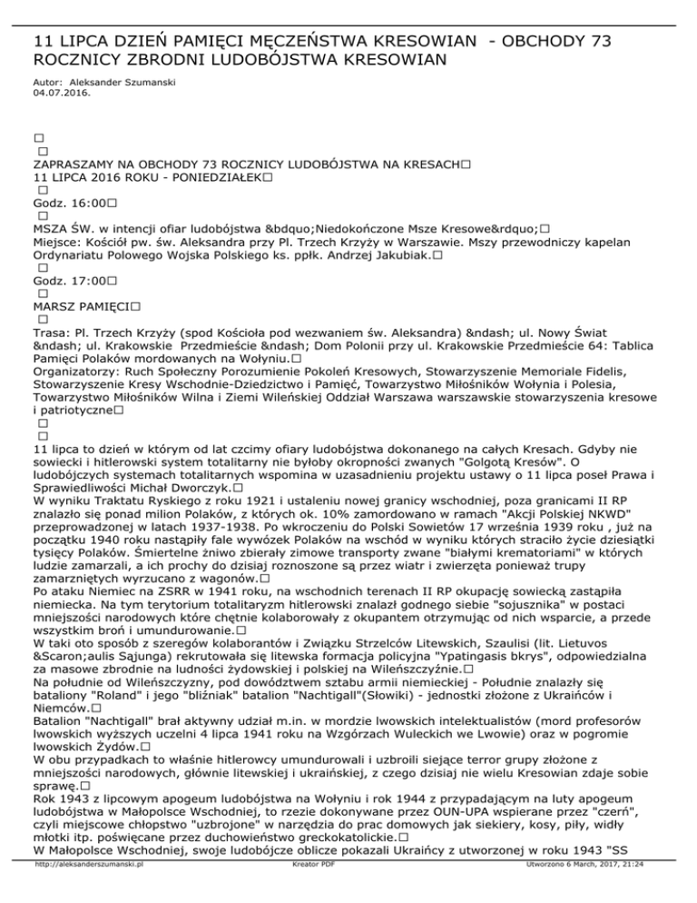 11 LIPCA DZIEŃ PAMIĘCI MĘCZEŃSTWA KRESOWIAN - OBCHODY 73 ROCZNICY ZBRODNI LUDOBÓJSTWA KRESOWIAN Autor: Aleksander Szumanski 04.07.2016. ZAPRASZAMY NA OBCHODY 73 ROCZNICY LUDOBÓJSTWA NA KRESACH 11 LIPCA 2016 ROKU - PONIEDZIAŁEK Godz. 16:00 MSZA ŚW. w intencji ofiar ludobójstwa „Niedokończone Msze Kresowe” Miejsce: Kościół pw. św. Aleksandra przy Pl. Trzech Krzyży w Warszawie. Mszy przewodniczy kapelan Ordynariatu Polowego Wojska Polskiego ks. ppłk. Andrzej Jakubiak. Godz. 17:00 MARSZ PAMIĘCI Trasa: Pl. Trzech Krzyży (spod Kościoła pod wezwaniem św. Aleksandra) – ul. Nowy Świat – ul. Krakowskie Przedmieście – Dom Polonii przy ul. Krakowskie Przedmieście 64: Tablica Pamięci Polaków mordowanych na Wołyniu. Organizatorzy: Ruch Społeczny Porozumienie Pokoleń Kresowych, Stowarzyszenie Memoriale Fidelis, Stowarzyszenie Kresy Wschodnie-Dziedzictwo i Pamięć, Towarzystwo Miłośników Wołynia i Polesia, Towarzystwo Miłośników Wilna i Ziemi Wileńskiej Oddział Warszawa warszawskie stowarzyszenia kresowe i patriotyczne 11 lipca to dzień w którym od lat czcimy ofiary ludobójstwa dokonanego na całych Kresach. Gdyby nie sowiecki i hitlerowski system totalitarny nie byłoby okropności zwanych "Golgotą Kresów". O ludobójczych systemach totalitarnych wspomina w uzasadnieniu projektu ustawy o 11 lipca poseł Prawa i Sprawiedliwości Michał Dworczyk. W wyniku Traktatu Ryskiego z roku 1921 i ustaleniu nowej granicy wschodniej, poza granicami II RP znalazło się ponad milion Polaków, z których ok. 10% zamordowano w ramach "Akcji Polskiej NKWD" przeprowadzonej w latach 1937-1938. Po wkroczeniu do Polski Sowietów 17 września 1939 roku , już na początku 1940 roku nastąpiły fale wywózek Polaków na wschód w wyniku których straciło życie dziesiątki tysięcy Polaków. Śmiertelne żniwo zbierały zimowe transporty zwane "białymi krematoriami" w których ludzie zamarzali, a ich prochy do dzisiaj roznoszone są przez wiatr i zwierzęta ponieważ trupy zamarzniętych wyrzucano z wagonów. Po ataku Niemiec na ZSRR w 1941 roku, na wschodnich terenach II RP okupację sowiecką zastąpiła niemiecka. Na tym terytorium totalitaryzm hitlerowski znalazł godnego siebie "sojusznika" w postaci mniejszości narodowych które chętnie kolaborowały z okupantem otrzymując od nich wsparcie, a przede wszystkim broń i umundurowanie. W taki oto sposób z szeregów kolaborantów i Związku Strzelców Litewskich, Szaulisi (lit. Lietuvos Šaulis Sąjunga) rekrutowała się litewska formacja policyjna "Ypatingasis bkrys", odpowiedzialna za masowe zbrodnie na ludności żydowskiej i polskiej na Wileńszczyźnie. Na południe od Wileńszczyzny, pod dowództwem sztabu armii niemieckiej - Południe znalazły się bataliony "Roland" i jego "bliźniak" batalion "Nachtigall"(Słowiki) - jednostki złożone z Ukraińców i Niemców. Batalion "Nachtigall" brał aktywny udział m.in. w mordzie lwowskich intelektualistów (mord profesorów lwowskich wyższych uczelni 4 lipca 1941 roku na Wzgórzach Wuleckich we Lwowie) oraz w pogromie lwowskich Żydów. W obu przypadkach to właśnie hitlerowcy umundurowali i uzbroili siejące terror grupy złożone z mniejszości narodowych, głównie litewskiej i ukraińskiej, z czego dzisiaj nie wielu Kresowian zdaje sobie sprawę. Rok 1943 z lipcowym apogeum ludobójstwa na Wołyniu i rok 1944 z przypadającym na luty apogeum ludobójstwa w Małopolsce Wschodniej, to rzezie dokonywane przez OUN-UPA wspierane przez "czerń", czyli miejscowe chłopstwo "uzbrojone" w narzędzia do prac domowych jak siekiery, kosy, piły, widły młotki itp. poświęcane przez duchowieństwo greckokatolickie. W Małopolsce Wschodniej, swoje ludobójcze oblicze pokazali Ukraińcy z utworzonej w roku 1943 "SS http://aleksanderszumanski.pl Kreator PDF Utworzono 6 March, 2017, 21:24 Galizien". Organizatorzy warszawskich obchodów 73. rocznicy postrzegają Kresy jako całość utraconego dziedzictwa narodowego, a nie tylko przez "optykę wołyńską i małopolską". Ludobójstwo Kresowian to przecież ofiary zbrodni: 1. Operacja polska NKWD 1937/38 - 150 tys ofiar 2. Deportacje lata 1940/41 według IPN - 80 tys ofiar 3. Podwileńskie Ponary 1941/44 - 100 tys ofiar 4. Wołyń ‘43 w tym Krwawa Niedziela - 60 tys. ofiar 5. Małopolska Wschodnia 40 tys. ofiar i pod żadnym pozorem nie wolno nam o tym ZAPOMINAĆ. Jedynym udokumentowanym dniem kulminacyjnym ludobójstwa jest "Krwawa Niedziela" z 11 lipca 1943 roku, natomiast inne ludobójstwa "rozłożone" były w czasie i dzisiaj nie sposób ustanowić jakichś "oddzielnych" dni dla uczczenia pamięci tych ofiar. Dlatego właśnie 11 lipca, w 73. rocznicę "Krwawej Niedzieli" na Wołyniu, dniu SYMBOLU ludobójstwa musimy po raz kolejny zjednoczyć się w oddaniu hołdu i godnym uczczeniu pamięci ofiar ludobójstwa na Polakach z Kresów. Tylko wspólnym i solidarnym uczestnictwem w uroczystościach przywrócimy polskiej przestrzeni publicznej zapomnianą pamięć po ludobójstwie dokonanym na całych Kresach. Z kresowym pozdrowieniem Andrzej Łukawski Kresowy Serwis Informacyjny http://www.ksi.kresy.info.pl Serwis o Kresach http://www.kresy.info.pl tel. 22 853 43 97; 501 153 340; http://aleksanderszumanski.pl Kreator PDF Utworzono 6 March, 2017, 21:24