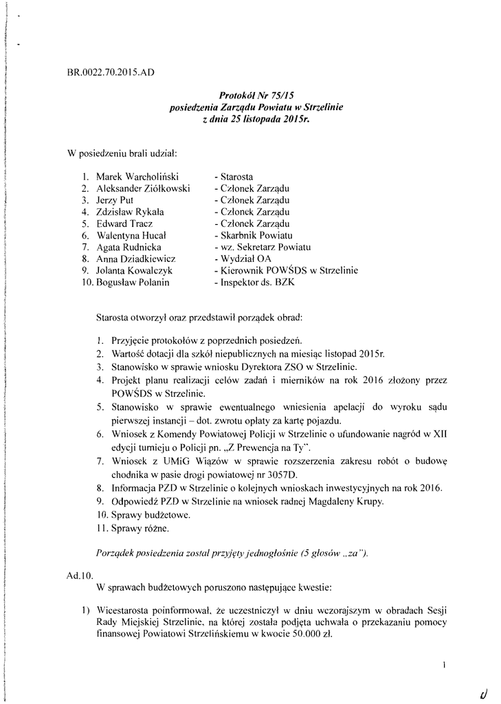 BR.0022.70.2015.AO Protokół Nr 75/15 posiedzenia Zarządu Powiatu wStrzelinie Z dnia 25 listopada 2015r. W posiedzeniu brali udział: 1. Marek Warcholiński 2. Aleksander Ziółkowski 3. Jerzy Put 4. Zdzisław Rykała 5. Edward Tracz 6. Walentyna Hucał 7. Agata Rudnicka 8. Anna Oziadkiewicz 9. Jolanta Kowalczyk ]O. Bogusław Polanin Starosta otworzył oraz 1. 2. 3. 4. 5. 6. 7. 8. 9. 10. 11. - Starosta - Członek Zarządu - Członek Zarządu - Członek Zarządu - Członek Zarządu - Skarbnik Powiatu - wz. Sekretarz Powiatu - Wydział OA - Kierownik POWŚDS wStrzelinie - Inspektor ds. BZK przedstawił porządek obrad: Przyjęcie protokołów z poprzednich posiedzeń. Wartość dotacji dla szkół niepublicznych na miesiąc listopad 2015r. Stanowisko w sprawie wniosku Dyrektora ZSO wStrzelinie. Projekt planu realizacji celów zadań i mierników na rok 2016 złożony przez POWŚOS wStrzelinie. Stanowisko w sprawie ewentualnego wniesienia apelacji do wyroku sądu pierwszej instancji - dot. zwrotu opłaty za kartę pojazdu. Wniosek z Komendy Powiatowej Policji w Strzelinie o ufundowanie nagród w XII edycji turnieju o Policji pn. "Z Prewencja na Ty". Wniosek z UMiG Wiązów w sprawie rozszerzenia zakresu robót o budowę chodnika w pasie drogi powiatowej nr 30570. Infonnacja PZO w Strzelinie o kolejnych wnioskach inwestycyjnych na rok 2016. Odpowiedź PZO w Strzelinie na wniosek radnej Magdaleny Krupy. Sprawy budżetowe. Sprawy różne. Porządek posiedzenia zoslal przyjęly jednogło,5nie (5 głosów .. za 'O). Ad.IO. W sprawach budżetowych poruszono następujące kwestie: 1) Wicestarosta poinfonnował, że uczestniczył w dniu wczorajszym w obradach Sesji Rady Miejskiej Strzelinie, na której została podjęta uchwała o przekazaniu pomocy finansowej Powiatowi Strzelińskiemu w kwocie 50.000 zł. 2) Pani Skarbnik poinfonnowała, że w związku z podjętą uchwałą przez Radę Miejską Strzelina o udzieleniu pomocy finansowej dla Powiatu Strzelińskiego zachodzi konieczność wprowadzenia zmian do przedłożonego projektu uchwały Rady Powiatu Strzelińskiego zmieniaj ącej budżet na 2015 rok: Dział 851 -Ochrona zdrowia, Rozdział 85] 95 Pozostała działalność. Zwiększa się plan dochodów o kwotę 50 000 zł z tytułu udzielenia przez Gminę Strzelin pomocy finansowej na realizację zadań z zakresu ochrony zdrowia (SCM wStrzelinie). - Dział 851 - Ochrona zdrowia, Rozdział 85195 - Pozostała działalność. Zwiększa się plan wydatków majątkowych - podwyższenie kapitału zakładowego spółki Strzelińskie Centrum Medyczne Sp. z o. o. w kwocie 50 000 zł (Pomoc finansowa z Gminy Strzelin na realizację zadań z zakresu ochrony zdrowia). - Po wprowadzeniu powyższych zmian plan dochodów budżetu Powiatu Strzelińskiego na rok 2015 wynosi 49 785050 zł, w tym; dochody majątkowe 2385344 zł, dochody bieżące 47399706 zł. - Po wprowadzeniu powyższych zmian plan wydatków wynosi 49 451 913 zł, w tym; wydatki majątkowe 3 315 708 zł, wydatki bieżące 46 136 205 zł. - Wprowadza się nowy załącznik dotyczący zadań inwestycyjnych obejmujący kwotę 50.000 zł. pomoc finansowa z Gminy Strzelin. Radny Zdzisław Rykała zawnioskował o Zarząd zatwierdził przesłanie radnym zgłoszonej autopoprawki. autopoprawkę do projektu Uchwały Rady Powiatu Powiatu Strzelińskiego na 2015 rok z dnia 29 stycznia 2015 roku (5 głosów" za "). Strzelińskiego zmieniającego Uchwałę Budżetową 3) Pani Skarbnik poinfonnowała, że w związku podjętą autopoprawką do projektu Uchwały Rady Powiatu Strzelińskiego zmieniającego Uchwałę Budżetową Powiatu Strzelińskiego na 2015 rok z dnia 29 stycznia 2015 roku zachodzi konieczność zmiany w wieloletniej prognozie finansowej w zakresie prognozy dochodów i wydatków. Zarząd zatwierdził Strzelińskiego Strzelińskiego autopoprawkę do projektu Uchwały Rady Powiatu w sprawie zmian w wieloletniej prognozie finansowej Powiatu Uchwala Nr lV/24/15 z dnia 29 stycznia 2015 roku (5 głosów "za "). Ad.2. Wicestarosta przedstawił wartość dotacji dla szkół niepublicznych na miesiąc listopad 2015r.: I Lp. NAZW A SZKOŁY MIESIĘCZNY KOSZT I DOTACJE Z BUDŻETU I KSZTAŁCENIA. POWIA TU UCZNIA J i 1. LO"Handicap" 65,00 J październik 2015r. 4355, listopad 2015r. 4355, 2 2. 3. 4. I LO"Halmur" LO ,.Slavia" Stowarzyszenie Sw. Celestyna: Szkoła 65,00 662.50 5330,. 4464,- Podst. Specjalna 64999,- 64999,- 45231,- 45231, 53479.- 53479, 1101 228,- 101 228, 264937,279086,· 264937,279340,· Gimnazjum Specjalne Szkoła Przysposabiająca 5720, 4003,- do I zawodu ! • Ośrodek Rew. Wychowawczy I Razem Celestyn . Razem Szkoły Niepubliczne I I I Ad.3. Wicestarosta powrócił do pisma Dyrektora ZSO w Strzelinie w sprawie zwiększenia godzin w celu realizacji przedmiotów w zakresie rozszerzonym. W związku z rozmowami prowadzonymi z Kuratorium Oświaty, jest sugestia aby wyjść naprzeciw oczekiwaniom rodziców i dostosować liczbę godzin do obowiązującego prawa. Pani Dyrektor oszacowała to łącznie na 480 godzin, co wiązałoby się ze zwiększeniem planu finansowego szkoły na rok 2016 o 23.860 zł. Pani Dyrektor powinna tak zorganizować ramowy plan nauczania, aby był on zgodny z prawem. W odpowiednim momencie Zarząd zastanowi się nad ewentualnym finansowym pokryciem tego zamiaru. Starosta zaproponował wyrażenie zgody na zwiększenie liczby godzin o 480 do realizacji przedmiotów w zakresie rozszerzonym. Zarząd wyraził zgodę na zl1'iększenie o 480 godzin w celu zapewnienia realizacji przedmiotó'rj! w zakresie rozszerzonym (5 głosów .. za "). Ad.5. Wicestarosta poinformował, że Sąd Rejonowy w Strzelinie wyrokiem z dnia 23.09.2015r. (sygn. akt I C 285/15) zasądził od Powiatu Strzelińskiego zapłatę 500 zł wraz z odsetkami od dnia 20.06.2015r. do dnia zapłaty na rzecz Tomasza Jakubowskiego z tytułu zwrotu opłaty za kartę pojazdu. Zarząd podjął decyzję o niewchodzeniu w dalszy spór sądowy i zwrot opiaty za kartę po
