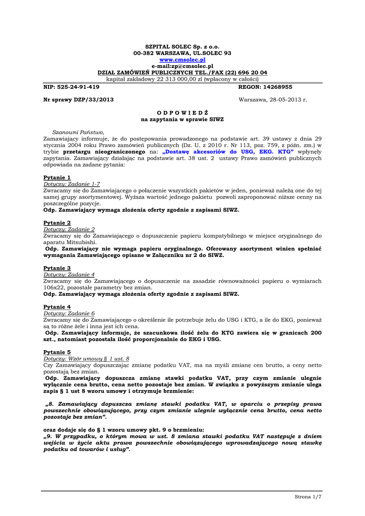 SZPITAL SOLEC Sp. z o.o. 00-382 WARSZAWA, UL.SOLEC 93 www.cmsolec.pl e-mail:[email protected] DZIAŁ ZAMÓWIEŃ PUBLICZNYCH TEL./FAX (22) 696 20 04 kapitał zakładowy 22 313 000,00 zl (wpłacony w całości) NIP: 525-24-91-419 REGON: 14268955 Nr sprawy DZP/33/2013 Warszawa, 28-05-2013 r. ODPOWIEDŹ na zapytania w sprawie SIWZ Szanowni Państwo, Zamawiający informuje, że do postępowania prowadzonego na podstawie art. 39 ustawy z dnia 29 stycznia 2004 roku Prawo zamówień publicznych (Dz. U. z 2010 r. Nr 113, poz. 759, z późn. zm.) w trybie przetargu nieograniczonego na: „Dostawę akcesoriów do USG, EKG. KTG” wpłynęły zapytania. Zamawiający działając na podstawie art. 38 ust. 2 ustawy Prawo zamówień publicznych odpowiada na zadane pytania: Pytanie 1 Dotyczy: Zadanie 1-7 Zwracamy się do Zamawiającego o połączenie wszystkich pakietów w jeden, ponieważ należą one do tej samej grupy asortymentowej. Wyższa wartość jednego pakietu pozwoli zaproponować niższe cenny na poszczególne pozycje. Odp. Zamawiający wymaga złożenia oferty zgodnie z zapisami SIWZ. Pytanie 2 Dotyczy: Zadanie 2 Zwracamy się do Zamawiającego o dopuszczenie papieru kompatybilnego w miejsce oryginalnego do aparatu Mitsubishi. Odp. Zamawiający nie wymaga papieru oryginalnego. Oferowany asortyment winien spełniać wymagania Zamawiającego opisane w Załączniku nr 2 do SIWZ. Pytanie 3 Dotyczy: Zadanie 4 Zwracamy się do Zamawiającego o dopuszczenie na zasadzie równoważności papieru o wymiarach 106x22, pozostałe parametry bez zmian. Odp. Zamawiający wymaga złożenia oferty zgodnie z zapisami SIWZ. Pytanie 4 Dotyczy: Zadanie 6 Zwracamy się do Zamawiającego o określenie ile potrzebuje żelu do USG i KTG, a ile do EKG, ponieważ są to różne żele i inna jest ich cena. Odp. Zamawiający informuje, że szacunkowa ilość żelu do KTG zawiera się w granicach 200 szt., natomiast pozostała ilość proporcjonalnie do EKG i USG. Pytanie 5 Dotyczy: Wzór umowy § 1 ust. 8 Czy Zamawiający dopuszczając zmianę podatku VAT, ma na myśli zmianę cen brutto, a ceny netto pozostają bez zmian. Odp. Zamawiający dopuszcza zmianę stawki podatku VAT, przy czym zmianie ulegnie wyłącznie cena brutto, cena netto pozostaje bez zmian. W związku z powyższym zmianie ulega zapis § 1 ust 8 wzoru umowy i otrzymuje brzmienie: „8. Zamawiający dopuszcza zmianę stawki podatku VAT, w oparciu o przepisy prawa powszechnie obowiązującego, przy czym zmianie ulegnie wyłącznie cena brutto, cena netto pozostaje bez zmian”. oraz dodaje się do § 1 wzoru umowy pkt. 9 o brzmieniu: „9. W przypadku, o którym mowa w ust. 8 zmiana stawki podatku VAT następuje z dniem wejścia w życie aktu prawa powszechnie obowiązującego wprowadzającego nową stawkę podatku od towarów i usług”. Strona 1/7 Pytanie 6 Dotyczy: Zadanie 1 poz. 3 Zwracamy się do Zamawiającego o dopuszczenie papieru do Farum E-300 z nadrukiem na zewnątrz, ponieważ taki jest prawidłowy papier do powyższego aparatu. Odp. Ponieważ do opisu przedmiotu zamówienia, zawartego w załączniku nr 2 do SIWZ wkradły się omyłki pisarskie Zamawiający, działając na podstawie art. 38 ust. 4 ustawy z dnia 29 stycznia 2004 roku Prawo zamówień publicznych (Dz. U. z 2010 r. Nr 113, poz. 759, z późn. zm.) dokonuje modyfikacji w powyższym zakresie. Zmodyfikowany opis przedmiotu zamówienia (Załącznik nr 2 do SIWZ) w załączeniu. Pytanie 7 Dotyczy: zapisów umowy Zwracamy się z prośbą o potwierdzenie, że w przypadku ustawowej zmiany stawki VAT zmianie ulegną ceny brutto produktów, natomiast ceny netto pozostaną bez zmian. Odp. Patrz odpowiedź na pytanie 5. Pytanie 8 Dotyczy: pakiet nr 1 poz. 3 Powołując się na opinię producenta aparatu Farum, zwracamy się z prośbą o wyjaśnienie czy nie zaszła oczywista omyłka i Zamawiający nie miał na myśli kartek nawiniętych od zewnątrz przy aparaturze E 300. Papier nawinięty do wewnątrz stosowany jest w aparaturze E 30, jednakże jego rozmiary wynoszą 100mm x 40m. Odp. Patrz odpowiedź na pytanie 6. Pytanie 9 Dotyczy: pakiet nr 2 poz. 1, 2 Czy Zamawiający wymaga oryginalnych papierów zalecanych przez producentów aparatury? Odp. Patrz odpowiedź na pytanie 2. Pytanie 10 Dotyczy: pakiet nr 3 poz. 2 Zwracamy się z prośbą o wyjaśnienie czy nie zaszła oczywista omyłka i Zamawiający nie miał na myśli papierów o rozm. 150mm x 100mm x 150stron, które są stosowane w aparacie HP M1911A. Odp. Ponieważ do opisu przedmiotu zamówienia, zawartego w załączniku nr 2 do SIWZ wkradły się omyłki pisarskie Zamawiający, działając na podstawie art. 38 ust. 4 ustawy z dnia 29 stycznia 2004 roku Prawo zamówień publicznych (Dz. U. z 2010 r. Nr 113, poz. 759, z późn. zm.) dokonuje modyfikacji w powyższym zakresie. Zmodyfikowany opis przedmiotu zamówienia (Załącznik nr 2 do SIWZ) w załączeniu. Pytanie 10 Dotyczy: pakiet nr 1 poz. 6 Czy Zamawiający dopuści papier do Siemens Sicard 300 stron w składance, z przeliczeniem ilości? Odp. Tak. Jednocześnie Zamawiający informuje, że Specyfikacja Istotnych Warunków Zamówienia w zmodyfikowanym brzmieniu z dniem przekazania niniejszej modyfikacji staje się obowiązująca w przedmiotowym postępowaniu. Zatwierdzam Zarząd Szpitala Solec Sp. z o. o. /-/ DZP/33/2013 – Odpowiedzi na pytania_1 Na podstawie art. 27 ust.2 ustawy Pzp. Zamawiający żąda potwierdzenia odbioru przez Wykonawcę niniejszej informacji niezwłocznie drogą faksową po jej otrzymaniu na nr /22/ 696-20-04, /22/ 250-61-99. Potwierdzenie odbioru przez Wykonawcę ilość czytelnych stron ………… dnia ……..………. podpis i pieczęć ………………………………. Strona 2/7 Opis przedmiotu zamówienia po modyfikacji z dnia 28 maja 2013 r. Zadanie nr 1 - Papier do EKG J. m. Ilość zamawiana na okres 12 m-cy 1. Papier termiczny do aparatu EKG, kompatybilny z aparatem firmy Aspel Ascard A3, nadruk na zewnątrz rolki, kratka termiczna ko