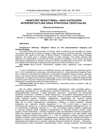 © Studia methodologica, ISSN 2307-1222, No. 39. 2014 Studia methodologica 2014; (39) «WARTOŚĆ NEGATYWNA» JAKO KATEGORIA INTERPRETACYJNA ORAZ STRATEGIA TEKSTUALNA Viktoriya Durkalevych Doktor nauk humanistycznych, docent w Katedrze Komunikacji Językowej i Międzykulturowej Państwowy Uniwersytet Pedagogiczny im. Iwana Franki w Drohobyczu 82100, m. Drohobycz, ul. Łesia Kurbasa 2, e-mail: [email protected] UDC: 821.162.1 Шул ABSTRACT Durkalevych Viktoriya. «Negative Value» as The Interpretational Category and Textual Strategy. The paper deals with the problem of writing, which is reduced to the simulation of values. The article explores the concept of negative value proposed by Andrzej Tyszczyk. Theoretical conclusions are made on the base of Bruno Schulz’s «Fatherland», where writing changed radically. The article gives a detailed analysis of these changes. The author stresses that difference of «Fatherland» is not reduced to the question of translation, but is strictly connected with sharply departing from Schulz’s concept of literary and philosophy of the word. The article is of interest to the theorists of literature and researchers of Bruno Schulz’s work. Key words: Bruno Schulz, «Fatherland», negative value, regression, myth, axiological problems. У статті зосереджено увагу на проблемі письма, яке зводиться до симуляції цінностей. У статті використано концепцію «негативної цінності», запропоновану Анджеєм Тищиком. Теоретичні узагальнення зроблено на матеріалі оповідання Бруно Шульца «Батьківщина», де письмо зазнає радикальних змін. Авторка наголошує на тому, що іншість «Батьківщини» не зводиться до питання перекладу, а тісно пов’язане з виразним віддалянням від Шульцової концепції літератури й філософії слова. Стаття буде цікавою для теоретиків літератури й дослідників творчості Бруно Шульца. Ключові слова: Бруно Шульц, «Батьківщина», негативна цінність, регресія, міф, аксіологічна проблематика. Nie ma chyba wątpliwości, że problematyka aksjologiczna nadal pozostaje jedną z najbardziej inspirujących we współczesnych badaniach literackich. Jej wielogłosowość oraz wieloaspektowość świadczą o stałej otwartości, dynamice i przenikaniu się różnorakich sposobów rozumienia i mówienia o dziele artystycznym. Szczególnie interesującymi pod tym względem wydają się być propozycje A. Tyszczyka. Chodzi tu przede wszystkim o sugerowane przez badacza pojęcie «wartości negatywnej», nawiązujące do «pewnej tradycji terminologicznej, która przez «wartość» rozumie to wszystko w przedmiocie, co powoduje, że staje się on czymś aksjologicznie nieobojętnym, zarówno w sensie dodatnim: wartość pozytywna, jak i ujemnym: wartość negatywna» [1, s. 137]. Innymi słowy, w ujęciu tym «wartością jest zarówno to, co stanowi podstawę dodatniej kwalifikacji aksjologicznej, jak i to, co ugruntowuje kwalifikację ujemną» [1, s. 137]. Formułując pojęcie wartości negatywnej, A. Tyszczyk sugeruje także możliwość wyodrębnienia co najmniej czterech odmian owego pojęcia. Chodzi mianowicie o: wartość negatywną «jako przeciwieństwo wartości pozytywnej», «jako brak wartości pozytywnej», «jako pozorna wartość pozytywna» oraz «jako pewien mały stopień natężenia wartości pozytywnej» [1, s. 138]. W niniejszym artykule uwaga skupiona zostanie na trzecim wariancie wartości negatywnej, tj. wartości pozornej. Zakłada się bowiem, iż właśnie to trzecie ujęcie wartości negatywnej może stanowić klucz do odczytania jednego z najbardziej kontrowersyjnych a zarazem najmniej zbadanych tekstów B. Schulza – «Ojczyzny». Dotychczasowe próby omówienia wspomnianego utworu oscylują pomiędzy fenomenologią Ternopil’ | Ukraine 125 © Studia methodologica, ISSN 2307-1222, No. 39. 2014 mitu bezpiecznego schronienia [2] a zagadnieniami z zakresu stylistyki tekstu tłumaczonego [3]. Obydwa wglądy w inność «Ojczyzny» wiążą się z systemem odwoływania się do rożnych kontekstów interpretacyjnych. W pierwszym przypadku punktem odniesienia są «Samotność» i «Republika marzeń», w drugim natomiast zaginione opowiadanie «Die Heimkehr». Rozważania o specyfice «Ojczyzny» pomimo różnych kontekstów odniesienia pozostają jednak na tym samym poziomie globalnym – poziomie tekstów artystycznych z wszystkimi stąd wypływającymi konsekwencjami. Niniejszy artykuł jest próbą odczytania «Ojczyzny» poprzez nawiązanie do kontekstu o charakterze meta. Chodzi tu przede wszystkim o odwołanie się do szeroko zakrojonej filozofii słowa B. Schulza jak również do sformułowanej przezeń koncepcji literatury oraz fenomenologii twórczości. Słowo, które interesuje artystę, to przede wszystkim słowo zwolnione od rygorów praktyki, słowo wyzwolone od przymusu, słowo, które «pozostawione jest sobie i przywrócone do praw własnych» [4, s. 384]. Takie słowo bowiem jest słowem żywym, a jego życie «polega na tym, że napina się ono, pręży do tysięcy połączeń, jak poćwiartowane ciało węża z legendy, którego kawałki szukają się wzajemnie w ciemności» [4, s. 383]. Słowo «wyzwolone» jest słowem, dążącym ku uniwersalnej całości, a więc słowem zdolnym do nazywania – włączania rzeczywistości w uniwersalny sens. Jedynie słowo «wyzwolone od przymusu» zdolne jest do mityzacji/«usensowania» rzeczywistości: «Słowo samo, pozostaw