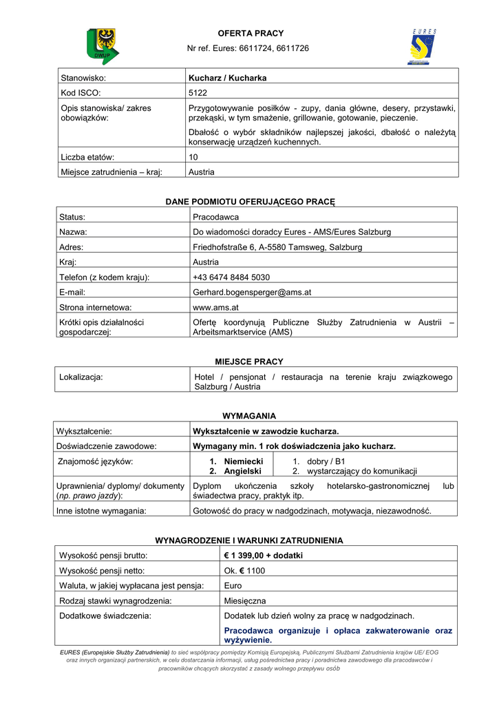 OFERTA PRACY Nr ref. Eures: 6611724, 6611726 Stanowisko: Kucharz / Kucharka Kod ISCO: 5122 Opis stanowiska/ zakres obowiązków: Przygotowywanie posiłków - zupy, dania główne, desery, przystawki, przekąski, w tym smażenie, grillowanie, gotowanie, pieczenie. Dbałość o wybór składników najlepszej jakości, dbałość o należytą konserwację urządzeń kuchennych. Liczba etatów: 10 Miejsce zatrudnienia – kraj: Austria DANE PODMIOTU OFERUJĄCEGO PRACĘ Status: Pracodawca Nazwa: Do wiadomości doradcy Eures - AMS/Eures Salzburg Adres: Friedhofstraße 6, A-5580 Tamsweg, Salzburg Kraj: Austria Telefon (z kodem kraju): +43 6474 8484 5030 E-mail: [email protected] Strona internetowa: www.ams.at Krótki opis działalności gospodarczej: Ofertę koordynują Publiczne Służby Zatrudnienia w Austrii – Arbeitsmarktservice (AMS) MIEJSCE PRACY Hotel / pensjonat / restauracja na terenie kraju związkowego Salzburg / Austria Lokalizacja: WYMAGANIA Wykształcenie: Wykształcenie w zawodzie kucharza. Doświadczenie zawodowe: Wymagany min. 1 rok doświadczenia jako kucharz. Znajomość języków: 1. Niemiecki 2. Angielski 1. dobry / B1 2. wystarczający do komunikacji Uprawnienia/ dyplomy/ dokumenty (np. prawo jazdy): Dyplom ukończenia szkoły świadectwa pracy, praktyk itp. hotelarsko-gastronomicznej Inne istotne wymagania: Gotowość do pracy w nadgodzinach, motywacja, niezawodność. lub WYNAGRODZENIE I WARUNKI ZATRUDNIENIA Wysokość pensji brutto: € 1 399,00 + dodatki Wysokość pensji netto: Ok. € 1100 Waluta, w jakiej wypłacana jest pensja: Euro Rodzaj stawki wynagrodzenia: Miesięczna Dodatkowe świadczenia: Dodatek lub dzień wolny za pracę w nadgodzinach. Pracodawca organizuje i opłaca zakwaterowanie oraz wyżywienie. EURES (Europejskie Służby Zatrudnienia) to sieć współpracy pomiędzy Komisją Europejską, Publicznymi Służbami Zatrudnienia krajów UE/ EOG oraz innych organizacji partnerskich, w celu dostarczania informacji, usług pośrednictwa pracy i poradnictwa zawodowego dla pracodawców i pracowników chcących skorzystać z zasady wolnego przepływu osób Nazwa firmy, z którą zostanie podpisana umowa: Do wiadomości doradcy Eures - AMS/Eures Salzburg Rodzaj umowy: Umowa o pracę Wymiar czasu pracy Pełen etat Czas trwania umowy: Grudzień 2014 – kwiecień 2015 Liczba godzin tygodniowo: 40 + nadgodziny (łącznie do 54 godzin pracy tygodniowo) przez 6 dni w tygodniu, zmienny dzień wolny. Zmiany i praca w dni wolne: Praca również w dni wolne i święta Data rozpoczęcia: Od 01.12.2014 r., po uzgodnieniu z pracodawcą SPOSÓB SKŁADANIA WNIOSKU Wymagane dokumenty: CV w j. niemieckim, zdjęcie, świadectwa Język, w którym muszą być sporządzone przedkładane dokumenty: Niemiecki Do kogo należy wysłać dokumenty: Do Doradcy EURES Gdzie należy wysłać dokumenty: Na adres e-mail: [email protected] (w tytule proszę wpisać „Kucharz Austria”) lub pocztą tradycyjną: Judyta Babiarz Dolnośląski Wojewódzki Urząd Pracy Filia w Jeleniej Górze ul. Wojska Polskiego 18, 58-500 Jelenia Góra - z dopiskiem: „Kucharz Austria” Dane teleadresowe doradcy EURES lub przedstawiciela pracodawcy: Doradca Eures – Judyta Babiarz, tel. (75) 754 51 79 DODATKOWE INFORMACJE Rozmowy rekrutacyjne odbędą się na początku listopada 2014 r. we Wrocławiu. Wybrani kandydaci zostaną poinformowani o dokładnym terminie i miejscu spotkania. WAŻNOŚĆ Data publikacji: 04.09.2014 Termin przedkładania podań o pracę / zakończenia ważności oferty: Do odwołania UWAGA: 1. Umowa z zagranicznym pracodawcą zostanie zawarta zgodnie z prawem kraju zatrudnienia. Oznacza to, że wszystkie roszczenia odnośnie do warunków, które obejmuje umowa, można kierować wyłącznie do odpowiedniego sądu w kraju zatrudnienia. Publiczne służby zatrudnienia (EURES) nie mogą pośredniczyć ani reprezentować pracownika w sądzie kraju zatrudnienia w przypadku sporu z pracodawcą. 2. Publiczne służby zatrudnienia (EURES) dokładają wszelkich starań, aby zapewnić rzetelność i wiarygodność ofert pracy zgłoszonych w lokalnym urzędzie pracy. Należy wyjaśnić, że oferta pracy została zgłoszona przez stronę trzecią i EURES nie odpowiada za ewentualne rozbieżności między warunkami pracy określonymi w ofercie pracy i warunkami oferowanymi przez potencjalnego pracodawcę. 3. Publiczne służby zatrudnienia (EURES) informują, że będą zbierać, przetwarzać i przekazywać potencjalnym pracodawcom zgodnie z przepisami dotyczącymi ochrony danych osobowych wszystkie dane osobowe dostarczone przez osoby poszukujące pracy. EURES (Europejskie Służby Zatrudnienia) to sieć współpracy pomiędzy Komisją Europejską, Publicznymi Służbami Zatrudnienia krajów UE/ EOG oraz innych organizacji partnerskich, w celu dostarczania informacji, usług pośrednictwa pracy i poradnictwa zawodowego dla pracodawców i pracowników chcących skorzystać z zasady wolnego przepływu osób