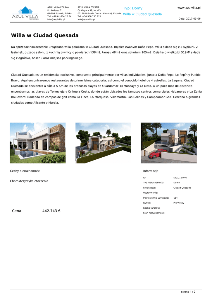 AZUL VILLA POLSKA Pl. Andersa 7 61-894 Poznań, Polska Tel. +48 61 664 26 34 [email protected] AZUL VILLA ESPAÑA C/ Niagara 39, local 3 03189 Orihuela Costa (Alicante), España Tel. +34 966 730 921 [email protected] www.azulvilla.pl Typ: Domy Willa w Ciudad Quesada Data: 2017-03-06 Willa w Ciudad Quesada Na sprzedaż nowocześnie urządzona willa położona w Ciudad Quesada, Rojales zwanym Doña Pepa. Willa składa się z 3 sypialni, 2 łazienek, dużego salonu z kuchnią piwnicy o powierzchni38m2, tarasu 48m2 oraz solarium 105m2. Działka o wielkości 519M² składa się z ogródka, basenu oraz miejsca parkingowego. Ciudad Quesada es un residencial exclusivo, compuesto principalmente por villas individuales, junto a Doña Pepa, Lo Pepín y Pueblo Bravo. Aquí encontraremos restaurantes de primerísima categoría, así como el conocido hotel de 4 estrellas, La Laguna. Ciudad Quesada se encuentra a sólo a 5 Km de las arenosas playas de Guardamar, El Moncayo y La Mata. A un poco mas de distancia encontramos las playas de Torrevieja y Orihuela Costa, donde están ubicados los famosos centros comerciales Habaneras y La Zenia Boulevard. Rodeado de campos de golf como La Finca, La Marquesa, Villamartín, Las Colinas y Campoamor Golf. Cercano a grandes ciudades como Alicante y Murcia. Cechy nieruchomości Informacje Charakterystyka otoczenia ID: Do/1/16/746 Typ nieruchomości: Domy Lokalizacja: Ciudad Quesada Usytuowanie: Cena 442.743 € Powierzchnia użytkowa: 164 Rynek: Pierwotny Liczba tarasów: Stan nieruchomości: strona 1 / 2 AZUL VILLA POLSKA Pl. Andersa 7 61-894 Poznań, Polska Tel. +48 61 664 26 34 [email protected] AZUL VILLA ESPAÑA C/ Niagara 39, local 3 03189 Orihuela Costa (Alicante), España Tel. +34 966 730 921 [email protected] Typ: Domy www.azulvilla.pl Willa w Ciudad Quesada Data: 2017-03-06 strona 2 / 2