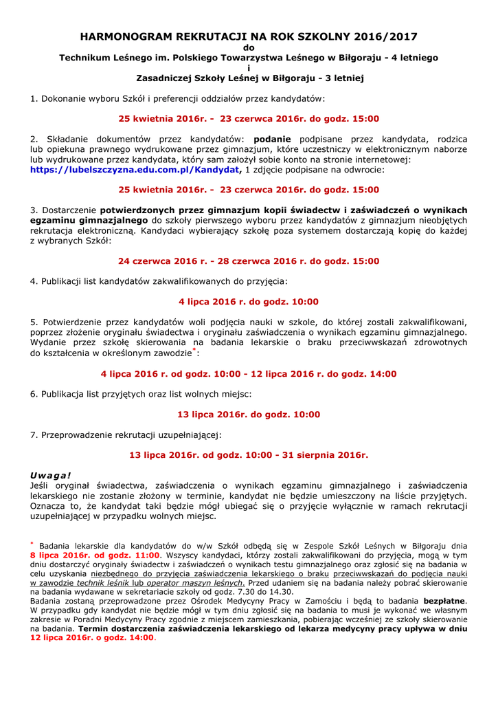 HARMONOGRAM REKRUTACJI NA ROK SZKOLNY 2016/2017 do Technikum Leśnego im. Polskiego Towarzystwa Leśnego w Biłgoraju - 4 letniego i Zasadniczej Szkoły Leśnej w Biłgoraju - 3 letniej 1. Dokonanie wyboru Szkół i preferencji oddziałów przez kandydatów: 25 kwietnia 2016r. - 23 czerwca 2016r. do godz. 15:00 2. Składanie dokumentów przez kandydatów: podanie podpisane przez kandydata, rodzica lub opiekuna prawnego wydrukowane przez gimnazjum, które uczestniczy w elektronicznym naborze lub wydrukowane przez kandydata, który sam założył sobie konto na stronie internetowej: https://lubelszczyzna.edu.com.pl/Kandydat, 1 zdjęcie podpisane na odwrocie: 25 kwietnia 2016r. - 23 czerwca 2016r. do godz. 15:00 3. Dostarczenie potwierdzonych przez gimnazjum kopii świadectw i zaświadczeń o wynikach egzaminu gimnazjalnego do szkoły pierwszego wyboru przez kandydatów z gimnazjum nieobjętych rekrutacja elektroniczną. Kandydaci wybierający szkołę poza systemem dostarczają kopię do każdej z wybranych Szkół: 24 czerwca 2016 r. - 28 czerwca 2016 r. do godz. 15:00 4. Publikacji list kandydatów zakwalifikowanych do przyjęcia: 4 lipca 2016 r. do godz. 10:00 5. Potwierdzenie przez kandydatów woli podjęcia nauki w szkole, do której zostali zakwalifikowani, poprzez złożenie oryginału świadectwa i oryginału zaświadczenia o wynikach egzaminu gimnazjalnego. Wydanie przez szkołę skierowania na badania lekarskie o braku przeciwwskazań zdrowotnych * do kształcenia w określonym zawodzie : 4 lipca 2016 r. od godz. 10:00 - 12 lipca 2016 r. do godz. 14:00 6. Publikacja list przyjętych oraz list wolnych miejsc: 13 lipca 2016r. do godz. 10:00 7. Przeprowadzenie rekrutacji uzupełniającej: 13 lipca 2016r. od godz. 10:00 - 31 sierpnia 2016r. Uwaga! Jeśli oryginał świadectwa, zaświadczenia o wynikach egzaminu gimnazjalnego i zaświadczenia lekarskiego nie zostanie złożony w terminie, kandydat nie będzie umieszczony na liście przyjętych. Oznacza to, że kandydat taki będzie mógł ubiegać się o przyjęcie wyłącznie w ramach rekrutacji uzupełniającej w przypadku wolnych miejsc. * Badania lekarskie dla kandydatów do w/w Szkół odbędą się w Zespole Szkół Leśnych w Biłgoraju dnia 8 lipca 2016r. od godz. 11:00. Wszyscy kandydaci, którzy zostali zakwalifikowani do przyjęcia, mogą w tym dniu dostarczyć oryginały świadectw i zaświadczeń o wynikach testu gimnazjalnego oraz zgłosić się na badania w celu uzyskania niezbędnego do przyjęcia zaświadczenia lekarskiego o braku przeciwwskazań do podjęcia nauki w zawodzie technik leśnik lub operator maszyn leśnych. Przed udaniem się na badania należy pobrać skierowanie na badania wydawane w sekretariacie szkoły od godz. 7.30 do 14.30. Badania zostaną przeprowadzone przez Ośrodek Medycyny Pracy w Zamościu i będą to badania bezpłatne. W przypadku gdy kandydat nie będzie mógł w tym dniu zgłosić się na badania to musi je wykonać we własnym zakresie w Poradni Medycyny Pracy zgodnie z miejscem zamieszkania, pobierając wcześniej ze szkoły skierowanie na badania. Termin dostarczenia zaświadczenia lekarskiego od lekarza medycyny pracy upływa w dniu 12 lipca 2016r. o godz. 14:00.