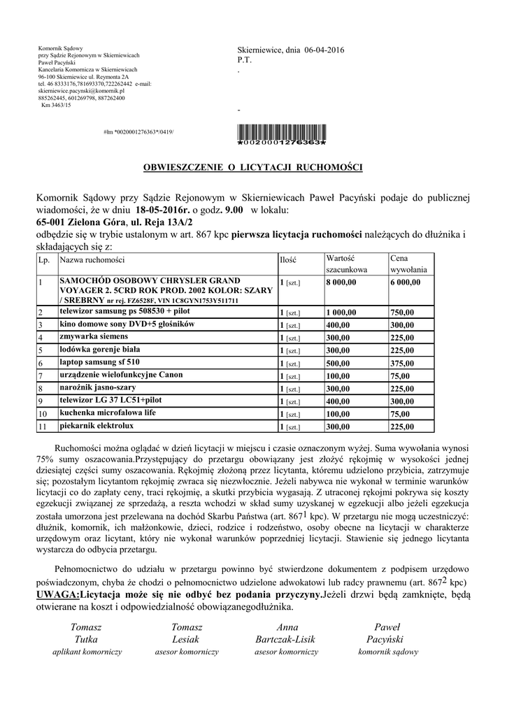 Komornik Sądowy przy Sądzie Rejonowym w Skierniewicach Paweł Pacyński Kancelaria Komornicza w Skierniewicach 96-100 Skierniewice ul. Reymonta 2A tel. 46 8333176,781693370,722262442 e-mail: [email protected] 885262445, 601269798, 887262400 Km 3463/15 Skierniewice, dnia 06-04-2016 P.T. . - #łm *0020001276363*/0419/ *0020001276363* OBWIESZCZENIE O LICYTACJI RUCHOMOŚCI Komornik Sądowy przy Sądzie Rejonowym w Skierniewicach Paweł Pacyński podaje do publicznej wiadomości, że w dniu 18-05-2016r. o godz. 9.00 w lokalu: 65-001 Zielona Góra, ul. Reja 13A/2 odbędzie się w trybie ustalonym w art. 867 kpc pierwsza licytacja ruchomości należących do dłużnika i składających się z: 1 [szt.] Wartość szacunkowa 8 000,00 Cena wywołania 6 000,00 1 [szt.] 1 [szt.] 1 [szt.] 1 [szt.] 1 [szt.] 1 [szt.] 1 [szt.] 1 [szt.] 1 [szt.] 1 [szt.] 1 000,00 400,00 300,00 300,00 500,00 100,00 300,00 400,00 100,00 300,00 750,00 300,00 225,00 225,00 375,00 75,00 225,00 300,00 75,00 225,00 Lp. Nazwa ruchomości Ilość 1 SAMOCHÓD OSOBOWY CHRYSLER GRAND VOYAGER 2. 5CRD ROK PROD. 2002 KOLOR: SZARY / SREBRNY nr rej. FZ6528F, VIN 1C8GYN1753Y511711 telewizor samsung ps 508530 + pilot kino domowe sony DVD+5 głośników zmywarka siemens lodówka gorenje biała laptop samsung sf 510 urządzenie wielofunkcyjne Canon narożnik jasno-szary telewizor LG 37 LC51+pilot kuchenka microfalowa life piekarnik elektrolux 2 3 4 5 6 7 8 9 10 11 Ruchomości można oglądać w dzień licytacji w miejscu i czasie oznaczonym wyżej. Suma wywołania wynosi 75% sumy oszacowania.Przystępujący do przetargu obowiązany jest złożyć rękojmię w wysokości jednej dziesiątej części sumy oszacowania. Rękojmię złożoną przez licytanta, któremu udzielono przybicia, zatrzymuje się; pozostałym licytantom rękojmię zwraca się niezwłocznie. Jeżeli nabywca nie wykonał w terminie warunków licytacji co do zapłaty ceny, traci rękojmię, a skutki przybicia wygasają. Z utraconej rękojmi pokrywa się koszty egzekucji związanej ze sprzedażą, a reszta wchodzi w skład sumy uzyskanej w egzekucji albo jeżeli egzekucja została umorzona jest przelewana na dochód Skarbu Państwa (art. 8671 kpc). W przetargu nie mogą uczestniczyć: dłużnik, komornik, ich małżonkowie, dzieci, rodzice i rodzeństwo, osoby obecne na licytacji w charakterze urzędowym oraz licytant, który nie wykonał warunków poprzedniej licytacji. Stawienie się jednego licytanta wystarcza do odbycia przetargu. Pełnomocnictwo do udziału w przetargu powinno być stwierdzone dokumentem z podpisem urzędowo poświadczonym, chyba że chodzi o pełnomocnictwo udzielone adwokatowi lub radcy prawnemu (art. 8672 kpc) UWAGA:Licytacja może się nie odbyć bez podania przyczyny.Jeżeli drzwi będą zamknięte, będą otwierane na koszt i odpowiedzialność obowiązanegodłużnika. Tomasz Tutka Tomasz Lesiak Anna Bartczak-Lisik aplikant komorniczy asesor komorniczy asesor komorniczy Paweł Pacyński komornik sądowy Do wiadomości: 1. a/a