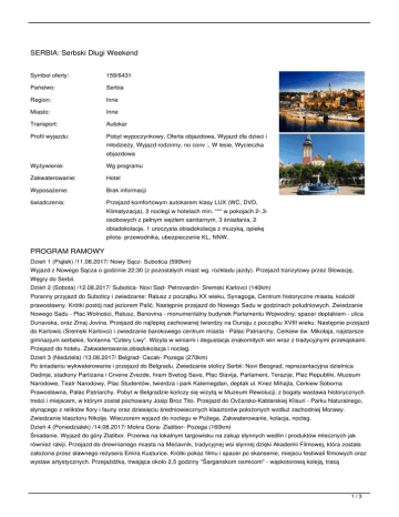 SERBIA: Serbski Długi Weekend Symbol oferty: 159/6431 Państwo: Serbia Region: Inne Miasto: Inne Transport: Autokar Profil wyjazdu: Pobyt wypoczynkowy, Oferta objazdowa, Wyjazd dla dzieci i młodzieży, Wyjazd rodzinny, no conv :, W lesie, Wycieczka objazdowa Wyżywienie: Wg programu Zakwaterowanie: Hotel Wyposażenie: Brak informacji świadczenia: Przejazd komfortowym autokarem klasy LUX (WC, DVD, Klimatyzacja), 3 noclegi w hotelach min. *** w pokojach 2-,3osobowych z pełnym węzłem sanitarnym, 3 śniadania, 2 obiadokolacje, 1 uroczysta obiadokolacja z muzyką, opiekę pilota- przewodnika, ubezpieczenie KL, NNW. PROGRAM RAMOWY Dzień 1 (Piątek) /11.08.2017/ Nowy Sącz- Subotica (590km) Wyjazd z Nowego Sącza o godzinie 22:30 (z pozostałych miast wg. rozkładu jazdy). Przejazd tranzytowy przez Słowację, Węgry do Serbii. Dzień 2 (Sobota) /12.08.2017/ Subotica- Novi Sad- Petrovardin- Sremski Karlovci (140km) Poranny przyjazd do Suboticy i zwiedzanie: Ratusz z początku XX wieku, Synagoga, Centrum historyczne miasta, kościół prawosławny. Krótki postój nad jeziorem Palić. Następnie przejazd do Nowego Sadu w godzinach południowych. Zwiedzanie Nowego Sadu - Plac Wolności, Ratusz, Banovina - monumentalny budynek Parlamentu Wojwodiny; spacer deptakiem - ulica Dunavska, oraz Zmaj Jovina. Przejazd do najlepiej zachowanej twierdzy na Dunaju z początku XVIII wieku. Następnie przejazd do Karlowic (Sremski Karlovci) i zwiedzanie barokowego centrum miasta - Pałac Patriarchy, Cerkiew św. Mikołaja, najstarsze gimnazjum serbskie, fontanna “Cztery Lwy”. Wizyta w winiarni i degustacja znakomitych win wraz z tradycyjnymi przekąskami. Przejazd do hotelu. Zakwaterowanie,obiadokolacja i nocleg. Dzień 3 (Niedziela) /13.08.2017/ Belgrad- Cacak- Pozega (270km) Po śniadaniu wykwaterowanie i przejazd do Belgradu. Zwiedzanie stolicy Serbii: Novi Beograd, reprezantacyjna dzielnica Dedinje, stadiony Partizana i Crvene Zvezde, hram Svetog Save, Plac Slavija, Parlament, Terazije, Plac Republiki, Muzeum Narodowe, Teatr Narodowy, Plac Studentów, twierdza i park Kalemegdan, deptak ul. Knez Mihajla, Cerkiew Soborna Prawosławna, Pałac Patriarchy. Pobyt w Belgradzie kończy się wizytą w Muzeum Rewolucji, z bogaty wastawa historycznych treści i miejscem, w którym został pochowany Josip Broz Tito. Przejazd do Ovčarsko-Kablarskiej Klisuri - Parku Naturalnego, słynącego z reliktów flory i fauny oraz dziesięciu średniowiecznych klasztorów położonych wzdłuż zachodniej Morawy. Zwiedzanie klasztoru Nikolje. Wieczorem wyjazd do noclegu w Požega. Zakwaterowanie, kolacja, nocleg. Dzień 4 (Poniedziałek) /14.08.2017/ Mokra Gora- Zlatibor- Pozega (160km) Śniadanie. Wyjazd do góry Zlatibor. Przerwa na lokalnym targowisku na zakup słynnych wedlin i produktów mlecznych jak również rakiji. Przejazd do drewnianego miasta na Mećavnik, tradycyjnej wsi słynnej dzięki Akademii Filmowej, która została założona przez sławnego reżysera Emira Kusturice. Krótki pokaz filmu i spacer po skansenie, miejscu festiwali filmowych oraz wystaw artystycznych. Przejażdżka, trwająca około 2,5 godziny "Šarganskom osmicom" - wąskotorową koleją, trasą 1/3 prowadzącą pięknymi zboczami kanionu, przez 22 tunele, pięć mostów i pokonującą różnicę poziomów około 300 metrów na całkowitej długości około 16 km. Powrot do hotelu na uroczystą obiadokolacje z muzyką i nocleg. Dzień 5 (Wtorek) /15.08.2017/ Pozega- Oplenac- Nowy Sącz (940km) Śniadanie i wykwaterowanie z hotelu. Jazda przez wspaniały widokowo obszar Šumadije do Topola. Wizyta w Mauzoleum rodziny królewskiej Karadjordjević, zwiedzanie Cerkwi Świętego Đorđa, ze znakomitymi mozaikami na wzgórzu Oplenac. Wyjazd w kierunku Polski. Przejazd przez Węgry i Słowację. Powrót do Nowego Sącza w godzinach nocnych. ŚWIADCZENIA W CENIE -> Przejazd komfortowym autokarem klasy LUX (WC, DVD, Klimatyzacja), -> 3 noclegi w hotelach min. *** w pokojach 2-,3- osobowych z pełnym węzłem sanitarnym, -> Wyżywienie: 3 śniadania, 2 obiadokolacje, 1 uroczysta obiadokolacja z muzyką, -> Opiekę pilota- przewodnika, -> Ubezpieczenie KL, NNW. CENA NIE ZAWIERA -> Dopłaty do pokoju 1-osobowego (300 PLN), -> Biletów wstępu do zwiedzanych obiektów i przewodników lokalnych (obligatoryjnie 40 EUR), -> Użyczenia urządzeń TOUR GUIDE (obligatoryjnie 5 EUR), -> Taksy klimatycznej (ok. 1,5 EUR/dzień) -> Napoi do obiadokolacji, -> Świadczeń nie wymienionych w ofercie. WAŻNE INFORMACJE -> Autobusy podstawowe wyjeżdżają z Nowego Sącza. Z pozostałych miast realizowane są tzw. połączenia antenowe, realizowane różnymi środkami transportu: samochód osobowy, bus, pociąg, autobusy liniowe. Połączenia antenowe potwierdzane są na 72 godziny przed datą wyjazdu. -> Przewozy antenowe są skomunikowane ze sobą co może powodować oczekiwanie w miejscach przesiadkowych, zwłaszcza w terminach powrotu. -> Istnieje możliwość wyjazdu z innych miejscowości po uzgodnieniu z Biurem WACTUR. UWAGI -> Pilot może zmienić kolejność realizacji programu. TERMINY: od: 2017-08-11 do: 2017-08-15 (5 dni), miejsca: sprawdź miejsca cena od: 920 PLN dodatkowe informacje/uwagi: 40 EUR - dopłaty obligatoryjnej CENNIK: Długość pobytu: 5 dni Grupa cenowa: A Ubezpieczenie (obligatoryjne) (*) Ubezpieczenie KL 15 000 EUR NNW 3 000 EUR Transport (obligatoryjny) (*) Transport Autokarem z wyposażeniem typu LUX Wyżywienie (obligatoryjne) (*) Śniadania i Obiadokolacje wg. programu Rodzaj osoby (obligatoryjny) (*) Uczestnik Miasto wyjazdowe (do wyboru) (-) (-) (-) 920 Brzesko Stacja paliw STATOIL, przy drodze krajowej 94 (21:30) 2/3 Myślenice Dworzec PKS, ul. Słoneczna (20:55) Jasło Dworzec autobusowy, st. 1 (21:05) Katowice Stacja paliw BP "Trzy Stawy", przy hotelu Campanile (19:10) Rzeszów Dworzec PKS, ul.Grottgera (19:45) Grybów Przystanek autobusowy, ul.Topolowa (22:05) Kraków Stacja paliw BP, przy Rondzie Matecznego, (obok Mc Donal