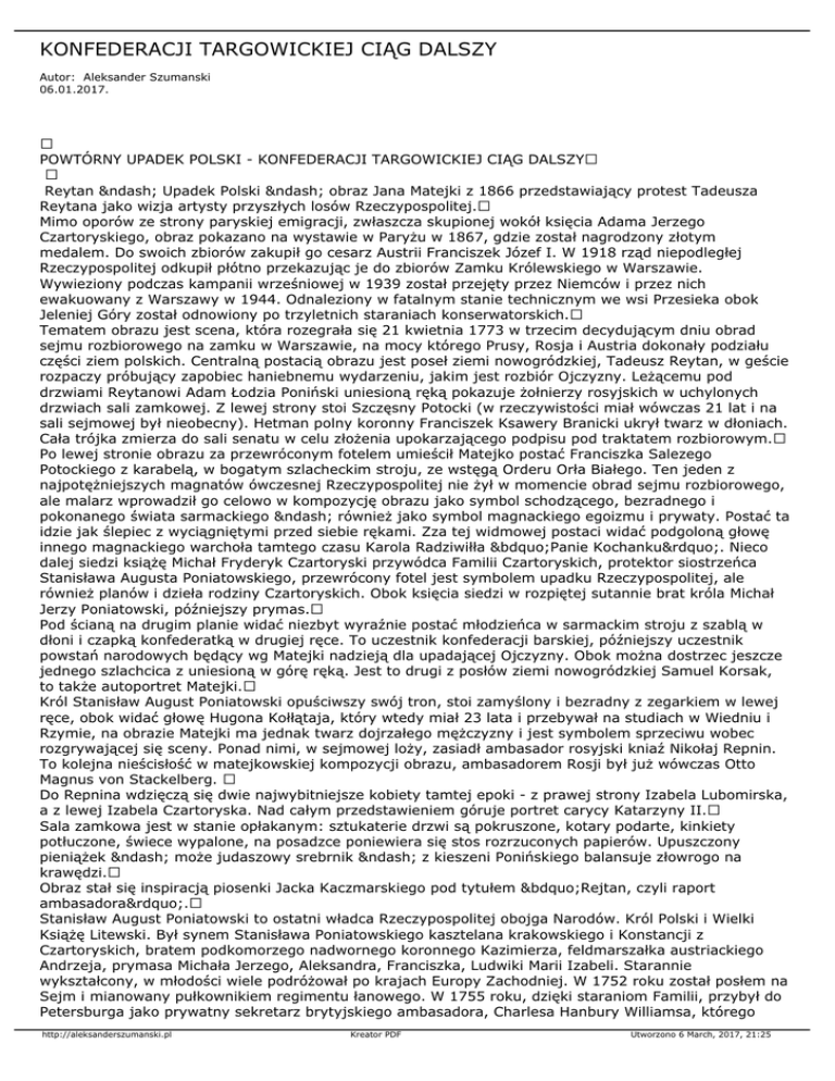 KONFEDERACJI TARGOWICKIEJ CIĄG DALSZY Autor: Aleksander Szumanski 06.01.2017. POWTÓRNY UPADEK POLSKI - KONFEDERACJI TARGOWICKIEJ CIĄG DALSZY Reytan – Upadek Polski – obraz Jana Matejki z 1866 przedstawiający protest Tadeusza Reytana jako wizja artysty przyszłych losów Rzeczypospolitej. Mimo oporów ze strony paryskiej emigracji, zwłaszcza skupionej wokół księcia Adama Jerzego Czartoryskiego, obraz pokazano na wystawie w Paryżu w 1867, gdzie został nagrodzony złotym medalem. Do swoich zbiorów zakupił go cesarz Austrii Franciszek Józef I. W 1918 rząd niepodległej Rzeczypospolitej odkupił płótno przekazując je do zbiorów Zamku Królewskiego w Warszawie. Wywieziony podczas kampanii wrześniowej w 1939 został przejęty przez Niemców i przez nich ewakuowany z Warszawy w 1944. Odnaleziony w fatalnym stanie technicznym we wsi Przesieka obok Jeleniej Góry został odnowiony po trzyletnich staraniach konserwatorskich. Tematem obrazu jest scena, która rozegrała się 21 kwietnia 1773 w trzecim decydującym dniu obrad sejmu rozbiorowego na zamku w Warszawie, na mocy którego Prusy, Rosja i Austria dokonały podziału części ziem polskich. Centralną postacią obrazu jest poseł ziemi nowogródzkiej, Tadeusz Reytan, w geście rozpaczy próbujący zapobiec haniebnemu wydarzeniu, jakim jest rozbiór Ojczyzny. Leżącemu pod drzwiami Reytanowi Adam Łodzia Poniński uniesioną ręką pokazuje żołnierzy rosyjskich w uchylonych drzwiach sali zamkowej. Z lewej strony stoi Szczęsny Potocki (w rzeczywistości miał wówczas 21 lat i na sali sejmowej był nieobecny). Hetman polny koronny Franciszek Ksawery Branicki ukrył twarz w dłoniach. Cała trójka zmierza do sali senatu w celu złożenia upokarzającego podpisu pod traktatem rozbiorowym. Po lewej stronie obrazu za przewróconym fotelem umieścił Matejko postać Franciszka Salezego Potockiego z karabelą, w bogatym szlacheckim stroju, ze wstęgą Orderu Orła Białego. Ten jeden z najpotężniejszych magnatów ówczesnej Rzeczypospolitej nie żył w momencie obrad sejmu rozbiorowego, ale malarz wprowadził go celowo w kompozycję obrazu jako symbol schodzącego, bezradnego i pokonanego świata sarmackiego – również jako symbol magnackiego egoizmu i prywaty. Postać ta idzie jak ślepiec z wyciągniętymi przed siebie rękami. Zza tej widmowej postaci widać podgoloną głowę innego magnackiego warchoła tamtego czasu Karola Radziwiłła „Panie Kochanku”. Nieco dalej siedzi książę Michał Fryderyk Czartoryski przywódca Familii Czartoryskich, protektor siostrzeńca Stanisława Augusta Poniatowskiego, przewrócony fotel jest symbolem upadku Rzeczypospolitej, ale również planów i dzieła rodziny Czartoryskich. Obok księcia siedzi w rozpiętej sutannie brat króla Michał Jerzy Poniatowski, późniejszy prymas. Pod ścianą na drugim planie widać niezbyt wyraźnie postać młodzieńca w sarmackim stroju z szablą w dłoni i czapką konfederatką w drugiej ręce. To uczestnik konfederacji barskiej, późniejszy uczestnik powstań narodowych będący wg Matejki nadzieją dla upadającej Ojczyzny. Obok można dostrzec jeszcze jednego szlachcica z uniesioną w górę ręką. Jest to drugi z posłów ziemi nowogródzkiej Samuel Korsak, to także autoportret Matejki. Król Stanisław August Poniatowski opuściwszy swój tron, stoi zamyślony i bezradny z zegarkiem w lewej ręce, obok widać głowę Hugona Kołłątaja, który wtedy miał 23 lata i przebywał na studiach w Wiedniu i Rzymie, na obrazie Matejki ma jednak twarz dojrzałego mężczyzny i jest symbolem sprzeciwu wobec rozgrywającej się sceny. Ponad nimi, w sejmowej loży, zasiadł ambasador rosyjski kniaź Nikołaj Repnin. To kolejna nieścisłość w matejkowskiej kompozycji obrazu, ambasadorem Rosji był już wówczas Otto Magnus von Stackelberg. Do Repnina wdzięczą się dwie najwybitniejsze kobiety tamtej epoki - z prawej strony Izabela Lubomirska, a z lewej Izabela Czartoryska. Nad całym przedstawieniem góruje portret carycy Katarzyny II. Sala zamkowa jest w stanie opłakanym: sztukaterie drzwi są pokruszone, kotary podarte, kinkiety potłuczone, świece wypalone, na posadzce poniewiera się stos rozrzuconych papierów. Upuszczony pieniążek – może judaszowy srebrnik – z kieszeni Ponińskiego balansuje złowrogo na krawędzi. Obraz stał się inspiracją piosenki Jacka Kaczmarskiego pod tytułem „Rejtan, czyli raport ambasadora”. Stanisław August Poniatowski to ostatni władca Rzeczypospolitej obojga Narodów. Król Polski i Wielki Książę Litewski. Był synem Stanisława Poniatowskiego kasztelana krakowskiego i Konstancji z Czartoryskich, bratem podkomorzego nadwornego koronnego Kazimierza, feldmarszałka austriackiego Andrzeja, prymasa Michała Jerzego, Aleksandra, Franciszka, Ludwiki Marii Izabeli. Starannie wykształcony, w młodości wiele podróżował po krajach Europy Zachodniej. W 1752 roku został posłem na Sejm i mianowany pułkownikiem regimentu łanowego. W 1755 roku, dzięki staraniom Familii, przybył do Petersburga jako prywatny sekretarz brytyjskiego ambasadora, Charlesa Hanbury Williamsa, którego http://aleksanderszumanski.pl Kreator PDF Utworzono 6 March, 2017, 21:25 poznał wcześniej w Berlinie. W czerwcu 1755 roku został przedstawiony przez ambasadora księżnej Sophie Friederike Auguste przyszłej cesarzowej Rosji Katarzynie II, natomiast w grudniu tego samego roku nawiązał z nią romans, stając się jej kochankiem. W tym czasie w kraju dużą role odgrywały wielkie stronnictwa magnackie, a coraz więcej do powiedzenia miały mocarstwa ościenne, Prusy, Austria, a szczególnie Rosja zainteresowane narzuceniem Rzeczypospolitej ograniczonych reform ustrojowych podważających demokrację szlachecką. 11 kwietnia 1764 roku nastąpiło podpisanie porozumienia pomiędzy Rosją i Prusami odnośnie przeprowadzenia w Rzeczypospolitej elekcji wspólnego kandydata. Wybór padł na Stanisława Augusta Poniat