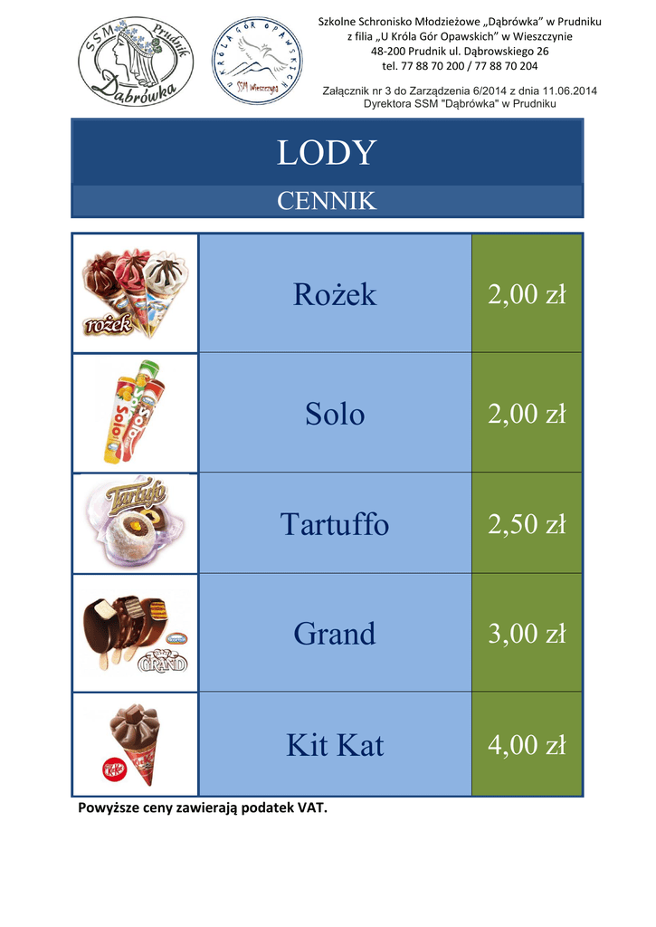 Szkolne Schronisko Młodzieżowe „Dąbrówka” w Prudniku z filia „U Króla Gór Opawskich” w Wieszczynie 48-200 Prudnik ul. Dąbrowskiego 26 tel. 77 88 70 200 / 77 88 70 204 Załącznik nr 3 do Zarządzenia 6/2014 z dnia 11.06.2014 Dyrektora SSM "Dąbrówka" w Prudniku LODY CENNIK Rożek 2,00 zł Solo 2,00 zł Tartuffo 2,50 zł Grand 3,00 zł Kit Kat 4,00 zł Powyższe ceny zawierają podatek VAT.