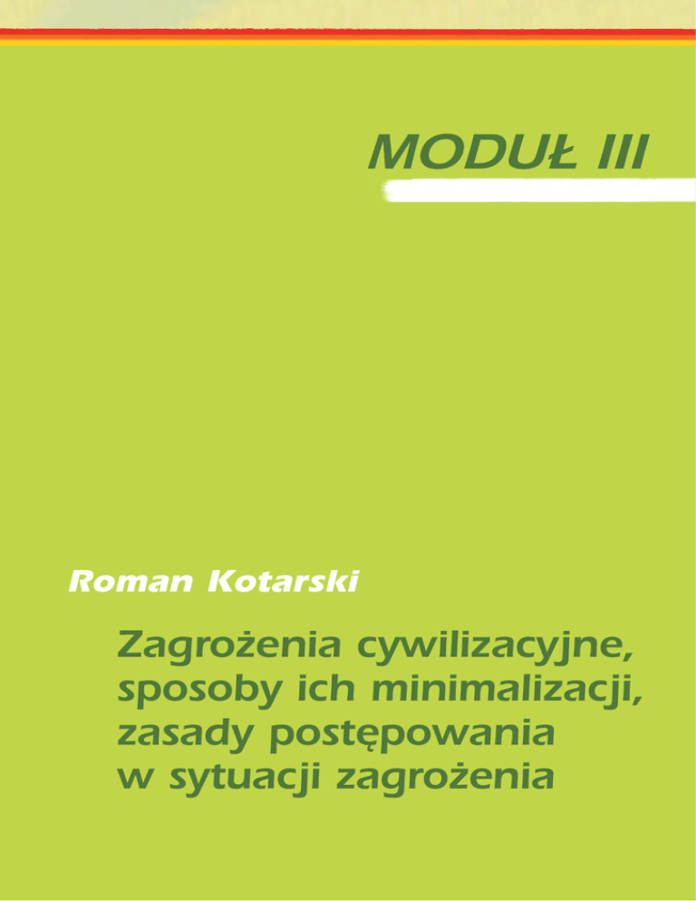 MODUŁ III Roman Kotarski Zagrożenia cywilizacyjne, sposoby ich minimalizacji, zasady postępowania w sytuacji zagrożenia ZAGROŻENIA CYWILIZACYJNE... MODUŁ III TEMAT: Zagrożenia cywilizacyjne, sposoby ich minimalizacji, zasady postępowania w sytuacji zagrożenia PRZEZNACZONY DLA: uczniów gimnazjum CZAS REALIZACJI: 8 godzin lekcyjnych – do realizacji w ciągu trzech lat gimnazjum POZIOM WIEDZY POCZĄTKOWEJ: POMOCE DYDAKTYCZNE: wiadomości i umiejętności z zakresu kultury bezpieczeństwa szkoły podstawowej – rzutnik pisma, – foliogramy, – karty pracy dla ucznia CELE EDUKACYJNE: – promowanie higienicznego trybu życia. – kształtowanie umiejętności rozpoznawania zagrożeń cywilizacyjnych. – kształtowanie umiejętności reagowania w przypadku zaistnienia tych zagrożeń. – kształtowanie umiejętności bezpiecznych zachowań codziennych. – promowanie zachowań asertywnych. – kształtowanie umiejętności bezpiecznego uczestnictwa w ruchu drogowym. – kształtowanie umiejętności bezpiecznego i odpowiedzialnego korzystania z osiągnięć współczesnej techniki. – kształtowanie umiejętności racjonalnej oceny własnej wiedzy. TREŚCI: 1. Społeczne, etyczne i ekonomiczne aspekty rozwoju cywilizacji. Zagrożenia wychowawcze: szkodliwe gry, deprawujące treści, uzależnienie, pornografia, zagrożenia medialne. 2. Substancje i przemiany chemiczne w otoczeniu człowieka. 3. Działanie niektórych substancji na organizm człowieka: leki, trucizny, alkohole, narkotyki, nawozy, środki ochrony roślin. 108 MODUŁ III 4. Stan zdrowia i choroby. Przykłady chorób zakaźnych oraz patologii w działaniu narządów; elementy epidemiologii, profilaktyki i leczenia omawianych chorób. 5. Problemy bezpiecznego wykorzystania wytworów współczesnej techniki; urządzenia techniczne stosowane w środowisku życia ucznia; bezpieczeństwo poruszania się po drogach. 6. Bezpieczeństwo i pierwsza pomoc: a. przepisy bezpieczeństwa w domu, szkole, miejscu publicznym; potrzeby w zakresie bezpieczeństwa dzieci, osób starszych i niepełnosprawnych, b. ryzyko związane z różnymi rodzajami aktywności i sytuacjami życiowymi, jego ocena i odpowiedzialność za jego podejmowanie. 7. Zachowania sprzyjające i zagrażające zdrowiu – podejmowanie odpowiedzialnych wyborów. 8. Poczucie własnej wartości, dawanie i przyjmowanie wsparcia, asertywność. 9. Sposoby znakowania substancji toksycznych (wybranych według katalogu ONZ). SPIS JEDNOSTEK LEKCYJNYCH L.p. Temat lekcji Proponowana forma realizacji Czas 1. „Instrukcja obsługi życia codziennego", czyli kto czyta, nie błądzi. Lekcja z wychowawcą 45 min. 2. „Pamiętaj chemiku młody …" – czyli, chemiczne zagrożenia zdrowia i życia. Lekcja chemii 45 min. 3. „Po podłączeniu do prądu wszystko zaczyna działać", czyli elektryczne zagrożenia zdrowia i życia. Lekcja techniki lub fizyki 45 min. 4. „Nie stresuj się", czyli stres jako zagrożenie naszego zdrowia i życia. Lekcja z wychowawcą 45 min. 5. „Half life”, czyli pół życia przed monitorem – zagrożenia medialne. Lekcja wychowawcza lub informatyki 45 min. 6. „Bądź bezpieczny na drodze” – bezpieczne uczestnictwo w ruchu drogowym. Lekcja praktyczna – np. rajd rowerowy, wycieczka do miasteczka rowerowego,spotkanie z policjantem 45 min. 7. „Gdyby kózka nie skakała …”, czyli mechaniczne zagrożeniazdrowia i życia. Lekcja techniki 45 min. 8. „Żyjmy zdrowo”, czyli biologiczne zagrożenia zdrowia i życia. Lekcja biologii 45 min. 109 ZAGROŻENIA CYWILIZACYJNE... LITERATURA: 1. Podręczniki i zeszyty ćwiczeń do nauczania chemii w gimnazjum. 2. John Emsley, Przewodnik po chemii życia codziennego. 3. Stanisław Mac, Jerzy Lwowski, Bezpieczeństwo i higiena pracy, WSiP 1999. 4. Asertywność sztuka bycia sobą, Materiały pomocnicze dla nauczycieli, psychologów i rodziców, Wydawnictwo Naukowe PWN, Warszawa 1997. 5. Wychowanie do życia w rodzinie, program Teresy Król, Krystyny Maśnik i Grażyny Węglarczyk. 6. Ewa Sadowska, Lekcje wychowawcze, ćwiczenia dla uczniów gimnazjum, Wydawnictwo Seventh Sea, Warszawa 1999. 7. Podręczniki i zeszyty ćwiczeń do techniki dla gimnazjum. 8. Karta motorowerowa − WSIP. 9. Multimedialna Encyklopedia Powszechna PWN, Edycja CD. 10. Encyklopedia zdrowia, Optimus Pascal Multimedia. 11. John Ensley, Przewodnik po chemii życia codziennego. 12. Podręczniki do nauki biologii i chemii w gimnazjum. 110
