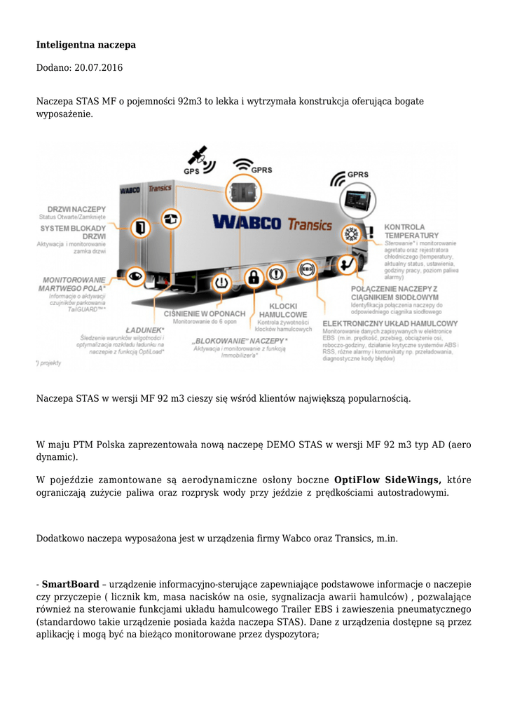 Inteligentna naczepa Dodano: 20.07.2016 Naczepa STAS MF o pojemności 92m3 to lekka i wytrzymała konstrukcja oferująca bogate wyposażenie. Naczepa STAS w wersji MF 92 m3 cieszy się wśród klientów największą popularnością. W maju PTM Polska zaprezentowała nową naczepę DEMO STAS w wersji MF 92 m3 typ AD (aero dynamic). W pojeździe zamontowane są aerodynamiczne osłony boczne OptiFlow SideWings, które ograniczają zużycie paliwa oraz rozprysk wody przy jeździe z prędkościami autostradowymi. Dodatkowo naczepa wyposażona jest w urządzenia firmy Wabco oraz Transics, m.in. - SmartBoard – urządzenie informacyjno-sterujące zapewniające podstawowe informacje o naczepie czy przyczepie ( licznik km, masa nacisków na osie, sygnalizacja awarii hamulców) , pozwalające również na sterowanie funkcjami układu hamulcowego Trailer EBS i zawieszenia pneumatycznego (standardowo takie urządzenie posiada każda naczepa STAS). Dane z urządzenia dostępne są przez aplikację i mogą być na bieżąco monitorowane przez dyspozytora; - IVTM/OptiTire - czujniki kontroli ciśnienia w kołach; - BVA – czujniki zużycia klocków hamulcowych; Informacje z obydwu czujników widoczne są na wyświetlaczu SmartBoard. TX-TrailerGUARD - urządzenie telematyczne z kontrolą GPS i GPRS, które wspomaga obsługę floty poprzez zdalną kontrolę pojazdów. Zwiększa bezpieczeństwo i wydajność poprzez możliwości monitorowania, zgłaszania i analizowania w czasie rzeczywistym wszystkich najważniejszych danych dotyczących naczepy lub przyczepy. Przez najbliższy rok firma PTM Polska będzie udostępniała zainteresowanym klientom możliwość testowania tej naczepy. Akcja promocyjna potrwa do maja 2017 roku. Szczegóły u handlowców PTM Polska. Komentarze (0) Nie dodano jeszcze żadnego komentarza.