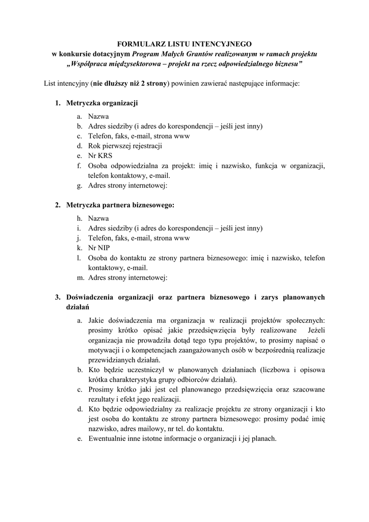 FORMULARZ LISTU INTENCYJNEGO w konkursie dotacyjnym Program Małych Grantów realizowanym w ramach projektu „Współpraca międzysektorowa – projekt na rzecz odpowiedzialnego biznesu” List intencyjny (nie dłuższy niż 2 strony) powinien zawierać następujące informacje: 1. Metryczka organizacji a. b. c. d. e. f. Nazwa Adres siedziby (i adres do korespondencji – jeśli jest inny) Telefon, faks, e-mail, strona www Rok pierwszej rejestracji Nr KRS Osoba odpowiedzialna za projekt: imię i nazwisko, funkcja w organizacji, telefon kontaktowy, e-mail. g. Adres strony internetowej: 2. Metryczka partnera biznesowego: h. i. j. k. l. Nazwa Adres siedziby (i adres do korespondencji – jeśli jest inny) Telefon, faks, e-mail, strona www Nr NIP Osoba do kontaktu ze strony partnera biznesowego: imię i nazwisko, telefon kontaktowy, e-mail. m. Adres strony internetowej: 3. Doświadczenia organizacji oraz partnera biznesowego i zarys planowanych działań a. Jakie doświadczenia ma organizacja w realizacji projektów społecznych: prosimy krótko opisać jakie przedsięwzięcia były realizowane Jeżeli organizacja nie prowadziła dotąd tego typu projektów, to prosimy napisać o motywacji i o kompetencjach zaangażowanych osób w bezpośrednią realizacje przewidzianych działań. b. Kto będzie uczestniczył w planowanych działaniach (liczbowa i opisowa krótka charakterystyka grupy odbiorców działań). c. Prosimy krótko jaki jest cel planowanego przedsięwzięcia oraz szacowane rezultaty i efekt jego realizacji. d. Kto będzie odpowiedzialny za realizacje projektu ze strony organizacji i kto jest osoba do kontaktu ze strony partnera biznesowego: prosimy podać imię nazwisko, adres mailowy, nr tel. do kontaktu. e. Ewentualnie inne istotne informacje o organizacji i jej planach. Listy intencyjne należy przesyłać w trybie ciągłym maksymalnie do 16 lutego 2012 r. pocztą elektroniczną na adres: [email protected] oraz faksem na nr: 71 793 23 24, na adres biura Dolnośląskiej Federacji Organizacji Pozarządowych: pl. Solidarności 1/3/5, 53661 Wrocław, V p., pok. 513-515.