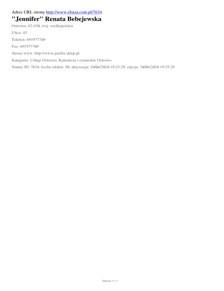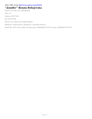 Adres URL strony http://www.ebaza.com.pl/7634 "Jennifer" Renata Bebejewska Ostrowo, 62-430, woj. wielkopolskie Ulica: 45 Telefon: 691977709 Fax: 691977709 Strona www: http://www.jenifer.sklep.pl Kategorie: Usługi Ostrowo, Kaletnicze i rymarskie Ostrowo Numer ID: 7634, liczba odsłon: 98, aktywacja: 10/04/2010 19:25:29, edycja: 10/04/2010 19:25:29 Strona 1 / 1
