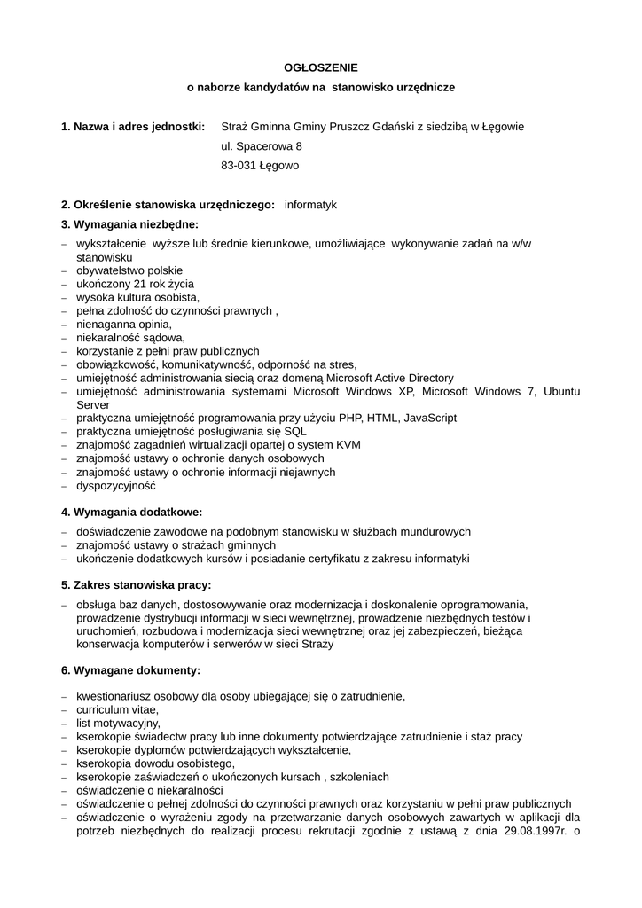 OGŁOSZENIE o naborze kandydatów na stanowisko urzędnicze 1. Nazwa i adres jednostki: Straż Gminna Gminy Pruszcz Gdański z siedzibą w Łęgowie ul. Spacerowa 8 83-031 Łęgowo 2. Określenie stanowiska urzędniczego: informatyk 3. Wymagania niezbędne: wykształcenie wyższe lub średnie kierunkowe, umożliwiające wykonywanie zadań na w/w stanowisku obywatelstwo polskie ukończony 21 rok życia wysoka kultura osobista, pełna zdolność do czynności prawnych , nienaganna opinia, niekaralność sądowa, korzystanie z pełni praw publicznych obowiązkowość, komunikatywność, odporność na stres, umiejętność administrowania siecią oraz domeną Microsoft Active Directory umiejętność administrowania systemami Microsoft Windows XP, Microsoft Windows 7, Ubuntu Server praktyczna umiejętność programowania przy użyciu PHP, HTML, JavaScript praktyczna umiejętność posługiwania się SQL znajomość zagadnień wirtualizacji opartej o system KVM znajomość ustawy o ochronie danych osobowych znajomość ustawy o ochronie informacji niejawnych dyspozycyjność 4. Wymagania dodatkowe: doświadczenie zawodowe na podobnym stanowisku w służbach mundurowych znajomość ustawy o strażach gminnych ukończenie dodatkowych kursów i posiadanie certyfikatu z zakresu informatyki 5. Zakres stanowiska pracy: obsługa baz danych, dostosowywanie oraz modernizacja i doskonalenie oprogramowania, prowadzenie dystrybucji informacji w sieci wewnętrznej, prowadzenie niezbędnych testów i uruchomień, rozbudowa i modernizacja sieci wewnętrznej oraz jej zabezpieczeń, bieżąca konserwacja komputerów i serwerów w sieci Straży 6. Wymagane dokumenty: kwestionariusz osobowy dla osoby ubiegającej się o zatrudnienie, curriculum vitae, list motywacyjny, kserokopie świadectw pracy lub inne dokumenty potwierdzające zatrudnienie i staż pracy kserokopie dyplomów potwierdzających wykształcenie, kserokopia dowodu osobistego, kserokopie zaświadczeń o ukończonych kursach , szkoleniach oświadczenie o niekaralności oświadczenie o pełnej zdolności do czynności prawnych oraz korzystaniu w pełni praw publicznych oświadczenie o wyrażeniu zgody na przetwarzanie danych osobowych zawartych w aplikacji dla potrzeb niezbędnych do realizacji procesu rekrutacji zgodnie z ustawą z dnia 29.08.1997r. o ochronie danych osobowych (Dz.U Nr 133 poz. 883 z późn. zm. ) oświadczenie o posiadanym obywatelstwie polskim inne, które kandydat uzna za ważne dla jego przyszłej pracy. 7. Termin i miejsce składania dokumentów: Straż Gminna Gminy Pruszcz Gdański ul. Spacerowa 8, 83-031 Łęgowo z dopiskiem „Oferta pracy –Informatyk w Straży Gminnej Gminy Pruszcz Gdański ” w terminie 10 dni od ukazania się ogłoszenia tj. do dnia 30 maja 2014r do. Oferty należy złożyć do sekretariatu Straży Gminnej Gminy Pruszcz Gdański do godz.16.00. Decyduje data wpływu oferty do Siedziby Straży. Oferty, które wpłyną do Siedziby Straży po wyżej określonym terminie nie będą rozpatrywane. Dane osobowe zawarte w aplikacji będą przetwarzane przez Straż Gminą Gminy Pruszcz Gdański w celu przeprowadzenia procedury naboru. Osoby ubiegające się o zatrudnienie mają prawo do dostępu do podanych dobrowolnie swoich danych osobowych oraz do ich poprawiania. Informacja o wyniku naboru będzie umieszczona w Biuletynie Informacji Publicznej Urzędu Gminy Pruszcz Gdański www.bip.pruszczgdanski.pl oraz na stronie internetowej Straży Gminnej Gminy Pruszcz Gdański www.sg.prusczgdanski.pl . Łęgowo, dnia 19.05.2014r. Komendant Straży Gminnej /-/ Tomasz Grabowski