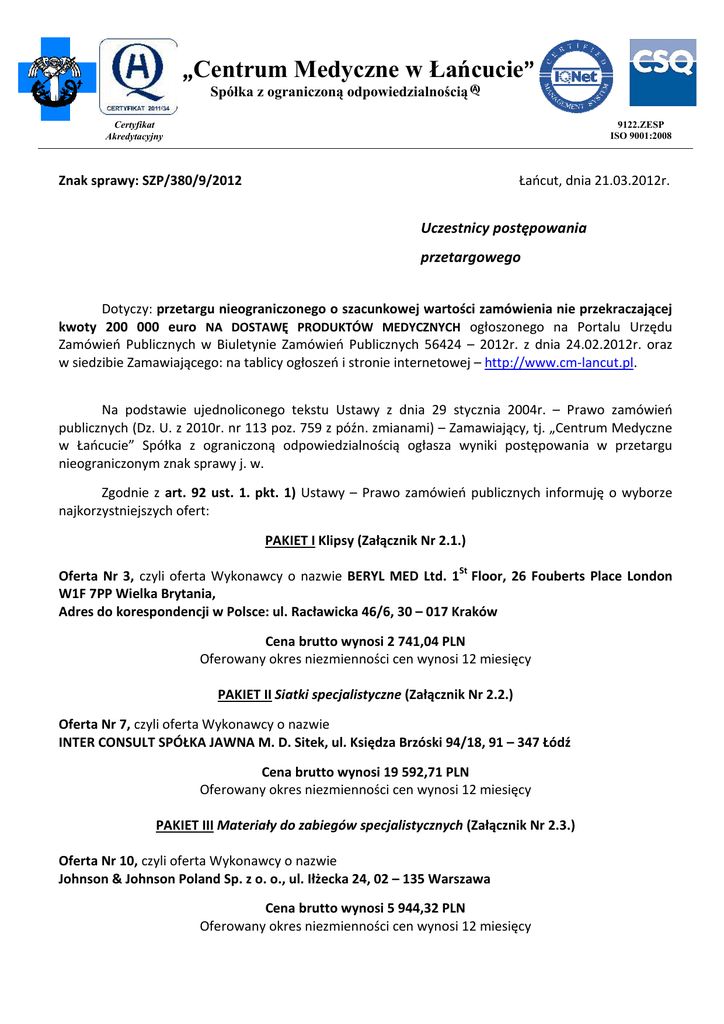 „Centrum Medyczne w Łańcucie”” Spółka z ograniczoną odpowiedzialnością 9122.ZESP ISO 9001:2008 Certyfikat Akredytacyjny Znak sprawy: SZP/380/9/2012 Łańcut, dnia 21.03.2012r. Uczestnicy postępowania przetargowego Dotyczy: przetargu nieograniczonego o szacunkowej wartości zamówienia nie przekraczającej kwoty 200 000 euro NA DOSTAWĘ PRODUKTÓW MEDYCZNYCH ogłoszonego na Portalu Urzędu Zamówień Publicznych w Biuletynie Zamówień Publicznych 56424 – 2012r. z dnia 24.02.2012r. oraz w siedzibie Zamawiającego: na tablicy ogłoszeń i stronie internetowej – http://www.cm-lancut.pl. Na podstawie ujednoliconego tekstu Ustawy z dnia 29 stycznia 2004r. – Prawo zamówień publicznych (Dz. U. z 2010r. nr 113 poz. 759 z późn. zmianami) – Zamawiający, tj. „Centrum Medyczne w Łańcucie” Spółka z ograniczoną odpowiedzialnością ogłasza wyniki postępowania w przetargu nieograniczonym znak sprawy j. w. Zgodnie z art. 92 ust. 1. pkt. 1) Ustawy – Prawo zamówień publicznych informuję o wyborze najkorzystniejszych ofert: PAKIET I Klipsy (Załącznik Nr 2.1.) Oferta Nr 3, czyli oferta Wykonawcy o nazwie BERYL MED Ltd. 1St Floor, 26 Fouberts Place London W1F 7PP Wielka Brytania, Adres do korespondencji w Polsce: ul. Racławicka 46/6, 30 – 017 Kraków Cena brutto wynosi 2 741,04 PLN Oferowany okres niezmienności cen wynosi 12 miesięcy PAKIET II Siatki specjalistyczne (Załącznik Nr 2.2.) Oferta Nr 7, czyli oferta Wykonawcy o nazwie INTER CONSULT SPÓŁKA JAWNA M. D. Sitek, ul. Księdza Brzóski 94/18, 91 – 347 Łódź Cena brutto wynosi 19 592,71 PLN Oferowany okres niezmienności cen wynosi 12 miesięcy PAKIET III Materiały do zabiegów specjalistycznych (Załącznik Nr 2.3.) Oferta Nr 10, czyli oferta Wykonawcy o nazwie Johnson & Johnson Poland Sp. z o. o., ul. Iłżecka 24, 02 – 135 Warszawa Cena brutto wynosi 5 944,32 PLN Oferowany okres niezmienności cen wynosi 12 miesięcy Pakiet IV Staplery i ładunki (Załącznik Nr 2.4.) Oferta Nr 3, czyli oferta Wykonawcy o nazwie BERYL MED Ltd. 1St Floor, 26 Fouberts Place London W1F 7PP Wielka Brytania, Adres do korespondencji w Polsce: ul. Racławicka 46/6, 30 – 017 Kraków Cena brutto wynosi 14 536,80 PLN Oferowany okres niezmienności cen wynosi 12 miesięcy Pakiet V Zestawy do nebulizacji (Załącznik Nr 2.5.) Oferta Nr 2, czyli oferta Wykonawcy o nazwie BiaMeditek Sp. z o. o., ul. Składowa 12, 15 – 399 Białystok Cena brutto wynosi 7 700,40 PLN Oferowany okres niezmienności cen wynosi 12 miesięcy Pakiet VI Naczynia jednorazowego użytku do maceratorów „VERNACARE” (Załącznik Nr 2.6.) Oferta Nr 1, czyli oferta Wykonawcy o nazwie EKOPAK Spółka z ograniczoną odpowiedzialnością, ul. Sosnowa 15, Pilchowo, 72 – 004 Tarnowo Cena brutto wynosi 33 890,40 PLN Oferowany okres niezmienności cen wynosi 12 miesięcy Pakiet VIII Szczotki jednorazowego użytku do chirurgicznego mycia rąk (Załącznik Nr 2.8.) Oferta Nr 4, czyli oferta Wykonawcy o nazwie Górnośląska Centrala Zaopatrzenia Medycznego ZARYS Sp. z o. o., ul. Pod Borem 18,41 – 808 Zabrze Cena brutto wynosi 3 402,00 PLN Oferowany okres niezmienności cen wynosi 12 miesięcy Uzasadnienie: w/w oferty są zgodne z Ustawą – Prawo zamówień publicznych, spełniają wymogi zawarte w Specyfikacji Istotnych Warunków Zamówienia i uzyskały maksymalne liczby punktów w poszczególnym pakiecie w oparciu o ustalone kryteria zawarte w SIWZ. Na podstawie art. 93 ust. 1. pkt. 1) Ustawy – Prawo zamówień publicznych informuję, że w Pakiecie VII „Fartuchy foliowe, foliowe ochraniacze na buty” w Pakiecie IX „Druty, gwoździe, groty, wkręty, klamry kostne” oraz w Pakiecie X „Płytki kostne” postępowanie unieważniono, ponieważ w pakietach tych nie złożono żadnej oferty niepodlegającej odrzuceniu. Działając na podstawie art. 92 ust. 1. pkt. 2) Ustawy – Prawo zamówień publicznych informuję, że w prowadzonym postępowaniu przetargowym nie odrzucono żadnej oferty przetargowej, natomiast zgodnie z art. 92 ust. 1. pkt. 3) tejże Ustawy informuję, że w postępowaniu tym nie wykluczono żadnego Wykonawcy. Komisja Przetargowa powołana została Zarządzeniem Wewnętrznym Nr 20/2012 w dniu 23.02.2012r. i składa się z sześciu osób. Przy badaniu i ocenie ofert oraz przyznawaniu im punktacji brali udział wszyscy członkowie komisji przetargowej. Na podstawie art. 92 ust. 1 pkt. 4) Ustawy – Prawo zamówień publicznych Zamawiający informuje, że planowane terminy zawarcia umów z Wykonawcami to dzień 28.03.2012r. W załączeniu: • druk ZP – 12 (zbiorcze zestawienie ofert) • druk ZP – 21 (streszczenie oceny i porównania złożonych ofert) ZATWIERDZAM PREZES ZARZĄDU Krzysztof Przyśliwski Ogłoszenie wyników postępowania wraz z drukami ZP otrzymują: • Wykonawcy, którzy złożyli oferty przetargowe, • tablica ogłoszeń Zamawiającego, • strona internetowa Zamawiającego. ul. Paderewskiego 5, 37-100 Łańcut, tel. (0-17) 224 01 00, fax. (0-17) 225 23 02 e-mail:[email protected], strona internetowa: www.cm-lancut.pl KRS 0000328106; NIP 8151763728; Kapitał Zakładowy 53.350.000,00zł nr konta PBS Bank O/Łańcut 46 8642 1142 2014 2403 9255 0001