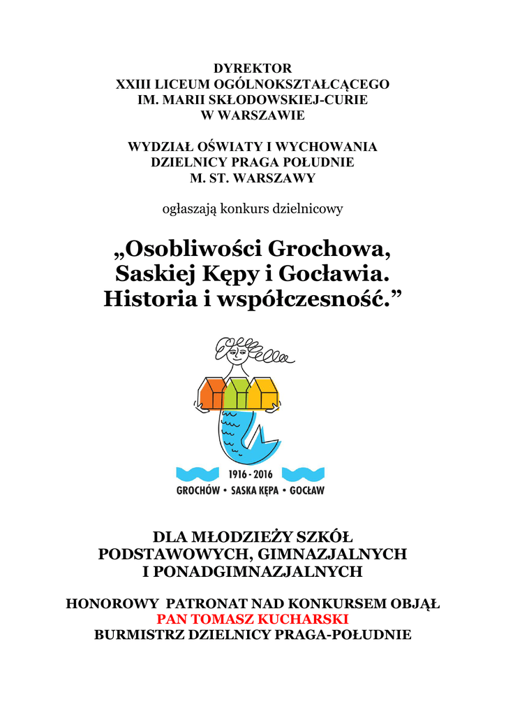 DYREKTOR XXIII LICEUM OGÓLNOKSZTAŁCĄCEGO IM. MARII SKŁODOWSKIEJ-CURIE W WARSZAWIE WYDZIAŁ OŚWIATY I WYCHOWANIA DZIELNICY PRAGA POŁUDNIE M. ST. WARSZAWY ogłaszają konkurs dzielnicowy „Osobliwości Grochowa, Saskiej Kępy i Gocławia. Historia i współczesność.” DLA MŁODZIEŻY SZKÓŁ PODSTAWOWYCH, GIMNAZJALNYCH I PONADGIMNAZJALNYCH HONOROWY PATRONAT NAD KONKURSEM OBJĄŁ PAN TOMASZ KUCHARSKI BURMISTRZ DZIELNICY PRAGA-POŁUDNIE W 2016 roku mija 100 rocznica przyłączenia Grochowa, Saskiej Kępy i Gocławia do Warszawy. W 1916 roku tereny te zostały włączone do Warszawy i od tego czasu zaczął się ich intensywny rozwój. Wcześniej charakteryzowały się spokojnym, podmiejskim, przemysłowym, a w niektórych częściach rolniczym klimatem. Wiele je różniło, ale łączyły te same wydarzenia historyczne… A dziś?... Tętni tu życie, jest dużo zieleni i można przeżyć wiele fascynujących przygód… „Bo Grochów to moje miejsce, to miłość na dobre i złe, choć może bywają lepsze, ja zawsze tu wracać chcę …” Z tekstu nr 2 w plebiscycie konkursowym na Hymn dla Grochowa Konkurs adresowany jest do dzieci i młodzieży szkół podstawowych, gimnazjalnych i ponadgimnazjalnych. Prosimy o zainteresowanie uczniów problematyką i zachęcenie do wzięcia udziału w konkursie. Finał konkursu odbędzie się 7 października 2016roku w gmachu XXIII Liceum im. Marii Skłodowskiej-Curie w Warszawie. Życzymy sukcesów W przypadku wszelkich uwag, pytań i informacji związanych z konkursem prosimy o kontakt nauczycielem historii p. Mariolą Bujak, tel. (22) 516-91-61; 698-829-301; [email protected]. REGULAMIN KONKURSU Konkurs dzielnicowy „Osobliwości Grochowa, Saskiej Kępy i Gocławia. Historia i współczesność.” 1. Cel konkursu: - uczczenie setnej rocznicy przyłączenia Grochowa, Saskiej Kępy i Gocławia do Warszawy - zainteresowanie uczniów historią naszej małej Ojczyzny i zachęcenie do poznawania jej - wzbogacenie wiedzy o otoczeniu, w którym mieszkają i wzrastają - kształtowanie tożsamości mieszkańców Pragi oraz dumy społeczności lokalnej z budowania więzi z miastem - upowszechnienie twórczości literackiej, opiewającej życie i obyczaje dawnych i współczesnych mieszkańców naszej dzielnicy - kształtowanie patriotyzmu i szacunku dla tradycji - wdrażanie uczniów do samokształcenia, rozbudzenie zainteresowań i rozwijanie ich uzdolnień 2. Zakres tematyczny konkursu: Wczoraj i dziś Grochowa, Saskiej Kępy i Gocławia. Zabytki i osobliwości, ważne wydarzenia i postaci, obyczaje, styl i warunki życia mieszkańców. 3. Konkurs rozpisany jest w różnych kategoriach: - Konkurs Plastyczny – dla uczniów szkół podstawowych Prace plastyczne mogą być wykonane w formie rysunku, plakatu, gazetki (format A3, A1) lub albumu. 4. Zgłoszenia do udziału w konkursie: - każda szkoła biorąca udział w konkursie jest zobowiązana zgłosić swój udział (faksem, telefonicznie, e-mailem bądź listownie) – załącznik nr 1 w terminie do 20 czerwca 2016 roku na adres: XXIII Liceum Ogólnokształcące im. Marii Skłodowskiej-Curie ul. Naddnieprzańska 2/4 04-205 Warszawa tel./fax (22) 516-91-61/ (22) 516-91-68 e-mail:[email protected] 5. Prace należy złożyć w XXIII Liceum Ogólnokształcącym do 19 września 2016 roku. Muszą być one zaopatrzone w następujące dane: - imię i nazwisko autora (autorów), klasa, adres szkoły - temat pracy - imię i nazwisko opiekuna, pod kierunkiem którego, praca została wykonana 6. Do każdej pracy musi być obowiązkowo dołączone oświadczenie o zgodzie rodziców na przetwarzanie danych osobowych dziecka. W przypadku pełnoletnich uczestników – zgoda uczestników na przetwarzanie danych osobowych. (Wzór oświadczenia dołączony w załączniku nr 3). 7. Prace i wiedza uczniów będą oceniane przez jury powołane przez dyrektora XXIII Liceum Ogólnokształcącego w konsultacji z Wydziałem Oświaty i Wychowania Dzielnicy Praga - Południe. Autorzy najlepszych prac w różnych kategoriach zostaną nagrodzeni. Przy ocenie prac Komisja Konkursowa będzie brała pod uwagę: - kreatywność oraz oryginalność prezentowanego materiału, - poprawność merytoryczną i językową prac - przejrzysty i uporządkowany układ, estetykę. 9. Finał konkursu odbędzie się 7 października 2016 roku o godz.12.00 w gmachu XXIII LO. Podczas uroczystości zakończenia konkursu zostaną ogłoszone wyniki i wręczone nagrody. 10. Organizatorem konkursu są XXIII Liceum Ogólnokształcące im. Marii Skłodowskiej – Curie i Wydział Oświaty i Wychowania dzielnicy Praga Południe m.st. Warszawy. 11. Wszystkie informacje na temat konkursu znajdują się na stronie internetowej szkoły: www.liceum23.waw.pl Załącznik nr 1: ZGŁOSZENIE UDZIAŁU W KONKURSIE DZIELNICOWYM „Osobliwości Grochowa, Saskiej Kępy i Gocławia. Historia i współczesność.” Nazwa szkoły: …………............................................................................................................. Adres:.................................................................................................................. Telefon:............................................................................................................... Fax:...................................................................................................................... Osoba odpowiedzialna:...................................................................................... Telefon kontaktowy:........................................................................................... Kategoria:……………………………………………………………………… Uczestnicy:……………………………………………………………………… …………………………………………………………………………………… ……………………………………………………………