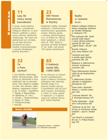 1 W NUMERZE M.IN. GALICYJSKA GAZETA LEKARSKA 11 23 Losy SU miarą naszej bezradności XXII Forum Ekonomiczne w Krynicy U progu nowej kadencji rozmowa z prorektorem Collegium Medicum UJ prof. Piotrem Laidlerem o planowanej reformie szkolnictwa medycznego. Nie może ona abstrahować ani od kadry, ani od bazy klinicznej (zwłaszcza od stanu Szpitala Uniwersyteckiego), a zamysły likwidacyjne pachną absurdem… Rozdźwięk między rozwojem medycyny a możliwościami ekonomicznymi gospodarek narasta. Podczas panelu o zdrowiu poinformowano m.in. że Polska ma 180 tys. łóżek szpitalnych, z obłożeniem ok. 70%. Może to oznaczać potrzebę likwidacji 27 tys. łóżek, czyli ponad 100 szpitali powiatowych... 32 65 Co u Pana słychać? II kadencja naszej Izby (1896-1899) Z racji dorobku naukowego, talentu klinicystycznego, bądź funkcji czy stanowiska w życiu publicznym byli na pierwszej scenie. Teraz odeszli ze względu na wiek, stan zdrowia, upływ kadencji, wygaśnięcie mandatu itp. Co robią? – zapytaliśmy T. Popielę, B. Badowskiego, M. Rybakową, W. Tracz, A. Kowala, J. Skołyszewskiego, K. Kaperę, W. Ptaka, A. Przybyszowskiego, J. Kukurbę. Po raz pierwszy na naszych łamach przedstawiamy dzieje II kadencji ZachodnioGalicyjskiej Izby Lekarskiej. Powstał wtedy m.in. pierwszy kodeks etyczny, a Naczelnikiem Izby był prof. Józef Łazarski, farmakolog, b. rektor UJ, który uzyskał w wyborach o 13 głosów więcej niż wybitny chirurg prof. Alfred Obaliński NR 5/2012 1 Nadto w numerze m.in.: Nadanie Collegium Medicum statusu Krajowego Naukowego Ośrodka Wiodącego w medycynie (19) Pod auspicjami Min. Nauki powstał wielki Raport o stanie zdrowia pokolenia powyżej 65 roku życia „Żyjemy dłużej – ale jak?” (20) Nowinki stołeczne (nasz nowy felieton) (22) „Sanatoria pod lupą” w świetle opinii Komisji Uzdrowisk ORL (26) Medycyna w elektronicznej chmurze; konferencja Comarchu (30) Prawa Wykonywania Zawodu trafiły do rąk absolwentów 2012 (40) X jubileuszowe Igrzyska Lekarskie w Zakopanem – fotoreportaż (42) Prawo Jacka i Agnieszki – felieton J. Lankosz-Lauterbach (46) „Cracoviae Merenti” dla A. Kosiniaka-Kamysza (47) Punkty edukacyjne – drugi okres rozliczeniowy (60) „Poderwać się do lotu”. Jak chirurg na emeryturze zostaje lotnikiem – pisze K. Śnieżek (62) Nasza okładka „Jan Paweł II w potrzebie” (list dyr. A. Prokop-Staszeckiej) (79) X Igrzyska Lekarzy – triathlon fot. Radosław Jastrzębski 2 GALICYJSKA GAZETA LEKARSKA NR 5/2012 2 Szanowne Koleżanki i Koledzy! Minęły wakacje. Po urlopach wypoczęci i pełni zapału wróciliśmy do pracy. Tym razem bez niespodzianek i fajerwerków legislacyjnych. Czyżby stabilizacja? Czy to nie za piękne? Chociaż...? Uczestniczyłem w Forum Ekonomicznym w Krynicy. Panel opieki zdrowotnej trwał dwa dni. Dyskutowano o sprawach wielkich – o ekonomii ochrony zdrowia w skali makro. Ale coś się zmieniło. Już nie udowadniano absurdalnej tezy, że pieniędzy w systemie jest dość, tylko zarządzający są niekompetentni, a lekarze są wszystkiemu winni. Brak było tej agresywnej retoryki, która ostatnio towarzyszyła nam na co dzień. Brak też było, niestety, profesjonalistów medycznych podczas dyskusji i przypomnienia, że jednak celem działania ochrony zdrowia jest przywrócenie zdrowia choremu człowiekowi. Z uwagą słuchałem wypowiedzi, p. Sławomira Neumanna, nowego sekretarza stanu w Ministerstwie Zdrowia. Co dziwniejsze, zgadzałem się z większością jego tez. Nie zapowiedział rewolucji, ani kolejnej reformy, a spokojne zmiany, decentralizację Funduszu poprzez zwiększenie kompetencji oddziałów kosztem centrali, korekty w funkcjonowaniu systemu tam, gdzie one są niezbędne. Dla mnie powiało optymizmem, choć nie chwal dnia przed nocą... A zapowiadało się tragicznie. Tymczasem jest jednak dla naszych Koleżanek i Kolegów ok. 2500 rezydentur. Pieniądze na ten cel przekazał z Funduszu Pracy dr Władysław Kosiniak-Kamysz, minister pracy i polityki społecznej. Minister dobrze rozumie potrzeby kształcenia lekarzy specjalistów. Ale co będzie w przyszłości, jak się np. zmieni minister pracy, a pozostanie na stanowisku minister finansów, który wcześniej odmówił na ten cel pieniędzy? Wolę nie myśleć. Jerzy Friediger Miło nam poinformować Czytelników, że prezes Okręgowej Rady Lekarskiej w Krako− wie dr hab. med. Andrzej Matyja w dniu 3 lipca 2012 roku otrzymał – nadany przez Prezy− denta Rzeczypospolitej Bronisława Komorowskiego – tytuł naukowy profesora nauk me− dycznych. Oficjalny akt wręczenia nominacji odbędzie się jesienią. My natomiast spieszy− my z gratulacjami nie zwlekając. Wszelkiej pomyślności Redakcja „Galicyjskiej Gazety Lekarskiej” 3 GALICYJSKA GAZETA LEKARSKA AKTUALNOŚCI NR 5/2012 Przyjmowanie materia³ów do n-ru zakoñczono 14 wrzeœnia 2012 Agnieszka Pachciarz nowym Prezesem NFZ Jacek Paszkiewicz to już historia. Jego odej− ście (burzliwe, w atmosferze skandalu, również na gruncie prywatnym) zwolniło fotel prezesa NFZ. Chętnych do jego przejęcia było kilkuna− stu, w tym – ku zaskoczeniu członków Naczelnej Rady Lekarskiej, jej wiceprezes Konstanty Ra− dziwiłł. Ostatecznie, 27 czerwca 2012 roku, sta− nowisko objęła Agnieszka Pachciarz, wicemini− ster zdrowia, rekomendowana przez ministra zdro− wia Bartosza Arłukowicza. Nowa Prezes NFZ pochodzi z Jarocina, ukoń− czyła Wydział Prawa i Administracji Uniwersy− tetu im. Adama Mickiewicza w Poznaniu. Pomi− mo młodego wieku (jeszcze nie ukończyła 40 lat) ma spore doświadczenie w zarządzaniu placów− kami medycznymi. Była m.in. dyrektorem SPZOZ w Słupcy i dyrektorem w Pleszewskim Centrum Medycznym (lider rankingu „Bezpieczny szpital”, opracowywanego co roku przez Centrum Moni− torowania Jakości w Ochronie Zdrowia oraz „Rzeczpospolitą”). Wartym pochwały pomysłem nowej p. prezes jest zamiar powiązania wysoko− ś