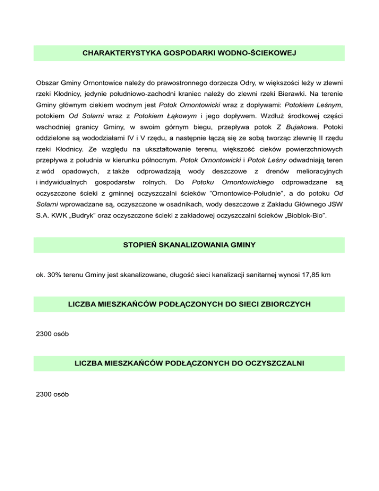CHARAKTERYSTYKA GOSPODARKI WODNO-ŚCIEKOWEJ Obszar Gminy Ornontowice naleŜy do prawostronnego dorzecza Odry, w większości leŜy w zlewni rzeki Kłodnicy, jedynie południowo-zachodni kraniec naleŜy do zlewni rzeki Bierawki. Na terenie Gminy głównym ciekiem wodnym jest Potok Ornontowicki wraz z dopływami: Potokiem Leśnym, potokiem Od Solarni wraz z Potokiem Łąkowym i jego dopływem. WzdłuŜ środkowej części wschodniej granicy Gminy, w swoim górnym biegu, przepływa potok Z Bujakowa. Potoki oddzielone są wododziałami IV i V rzędu, a następnie łączą się ze sobą tworząc zlewnię II rzędu rzeki Kłodnicy. Ze względu na ukształtowanie terenu, większość cieków powierzchniowych przepływa z południa w kierunku północnym. Potok Ornontowicki i Potok Leśny odwadniają teren z wód opadowych, i indywidualnych z takŜe gospodarstw odprowadzają rolnych. Do wody deszczowe Potoku z drenów Ornontowickiego melioracyjnych odprowadzane są oczyszczone ścieki z gminnej oczyszczalni ścieków ”Ornontowice-Południe”, a do potoku Od Solarni wprowadzane są, oczyszczone w osadnikach, wody deszczowe z Zakładu Głównego JSW S.A. KWK „Budryk” oraz oczyszczone ścieki z zakładowej oczyszczalni ścieków „Bioblok-Bio”. STOPIEŃ SKANALIZOWANIA GMINY ok. 30% terenu Gminy jest skanalizowane, długość sieci kanalizacji sanitarnej wynosi 17,85 km LICZBA MIESZKAŃCÓW PODŁĄCZONYCH DO SIECI ZBIORCZYCH 2300 osób LICZBA MIESZKAŃCÓW PODŁĄCZONYCH DO OCZYSZCZALNI 2300 osób ISTNIEJĄCE OCZYSZCZALNIE ŚCIEKÓW Oczyszczalnia „Ornontowice Południe” uruchomiona: 1996 r. typ: mechaniczno-biologiczna oczyszczalnia ścieków typu Cov-SH-3x60 przepustowość: średnia - 180 m3/d, maksymalna - 200 m3/d odbiornik oczyszczonych ścieków: Potok Ornontowicki Oczyszczalnia „Bioblok-Bio Dodatkowo ok. 100 m3/d ścieków trafia na oczyszczalnię ścieków „Bioblok-Bio”, stanowiącą własność Jastrzębskiej Spółki Węglowej S.A. KWK „Budryk”. ROZWIĄZANIA GOSPODARKI ŚCIEKOWEJ NA TERENACH NIE PODŁĄCZONYCH DO SIECI Na terenach nie skanalizowanych ścieki bytowo-gospodarcze gromadzone są w przydomowych zbiornikach bezodpływowych (tzw. szambach), skąd później trafiają taborem asenizacyjnym na stacje zlewne. Ścieki oczyszczane są takŜe w przydomowych oczyszczalniach ścieków. INWESTYCJE ZREALIZOWANE Obecnie długość sieci kanalizacji sanitarnej na terenie Gminy wynosi 17,85 km. Inwestycje zrealizowane w latach 2007 – 2010: • przebudowa sieci wodociągowej wraz z przyłączami do budynków mieszkalnych w ciągu ul. Akacjowej, ul. Bujakowskiej i ul. Hutniczej oraz przebudowa wodociągu na osiedlu przy ul. Akacjowej, • modernizacja odcinka wodociągu przy ul. Kolejowej, • wykonanie sieci wodociągowej, przyłączy do budynków jednorodzinnych wraz z instalacjami wodomierzowymi w rejonie ul. Kolejowej, Polnej oraz remontu wodociągu przesyłowego zasilającego szyb VI, • rozbudowa wodociągu przy ul. Cichej, • wykonanie łącznika DN 160 mm PE w rejonie ul. Zwycięstwa i ul. Kolejowej wraz z odwodnieniem komór wodociągowych zlokalizowanych przy ul. Zwycięstwa, • budowa kanalizacji sanitarnej i deszczowej przy ul. Tartacznej, • budowa kanalizacji deszczowej przy ul. Krótkiej, • budowa kanalizacji deszczowej przy ul. Kolejowej, • budowa wodociągu przy ul. Leśnej w Ornontowicach (od komory przy ul. Zamkowej do posesji nr 53) wraz z wodociągiem na oś. przy ul. Leśnej (ul. Cyprysowa i ul. Świerkowa), • budowa wodociągu przy ul. Łąkowej, • budowa wodociągu przy ul. Klonowej, • budowa wodociągu przy ul. Orzeskiej na odcinku od ul. Bujakowskiej do ul. Akacjowej, • budowa sieci wodociągowej wzdłuŜ łącznika drogowego Zamkowa-Dworcowa, • budowa sieci wodociągowej w rejonie pawilonu handlowego i kościoła (centrum Gminy). INWESTYCJE W TRAKCIE REALIZACJI • budowa wodociągu przy ul. Dworcowej i Marzankowice (realizacja do końca 2010 r.) • budowa kanalizacji sanitarnej i deszczowej przy ul. Dworcowej i ul. Marzankowice (planowane zakończenie czerwiec 2011 r .) Gmina Ornontowice jest w trakcie opracowywania projektu budowlano-wykonawczego oczyszczalni ścieków „Ornontowice-Północ”, która docelowo oczyszczać będzie ścieki z terenu całej Gminy. Równorzędnie prowadzone są prace nad wykonaniem projektu budowlanowykonawczego kanalizacji sanitarnej i deszczowej w Gminie Ornontowice. Zakończenie prac projektowych planowane jest w czerwcu 2011 r. INWESTYCJE PLANOWANE • budowa kanalizacji sanitarnej przy ul. Polnej (planowane zakończenie 2011 r.), • budowa kanalizacji deszczowej w rejonie ul. Polnej (planowana realizacja w 2011 r.) • budowa oczyszczalni ścieków „Ornontowice-Północ”, o przepustowości średniej 900 m3/d, a maksymalnej 950 m3/d; oczyszczalnia ta docelowo obsługiwać będzie teren całej Gminy, planowane oddanie oczyszczalni do eksploatacji – 2015 rok. • budowa 35 km sieci kanalizacyjnej w celu skanalizowania całego obszaru Gminy. POSIADANA DOKUMNETACJA BUDOWLANO WYKONAWCZA • projekt budowlano-wykonawczy sieci wodociągowej przy ul. Kolejowej w Ornontowicach z podziałem na 3 etapy, • projekt budowlano-wykonawczy sieci wodociągowej przy ul. Orzeskiej na odcinku od ul. Dworcowej, • projekt budowlano-wykonawczy odbudowy Potoku Solarnia i Potoku Łąkowego w Ornontowicach, • projekt budowlano-wykonawczy kanalizacji sanitarnej w rejonie ul. Polnej w Ornontowicach, • projekt budowlano-wykonawczy sieci wodociągowej przy ul. Nowej i ul. Granicznej w Ornontowicach z podziałem na 2 etapy.