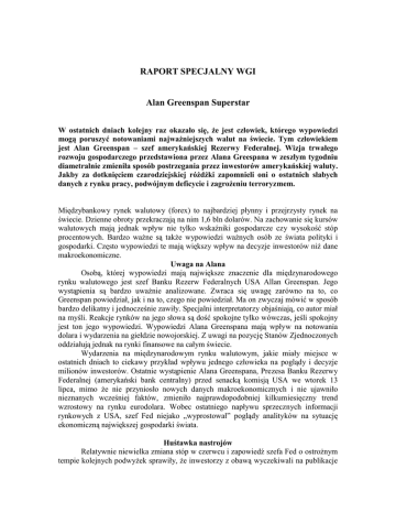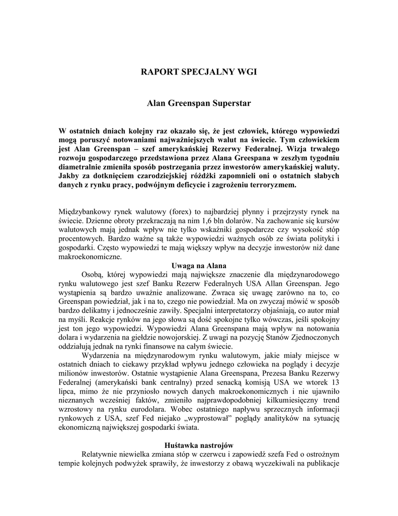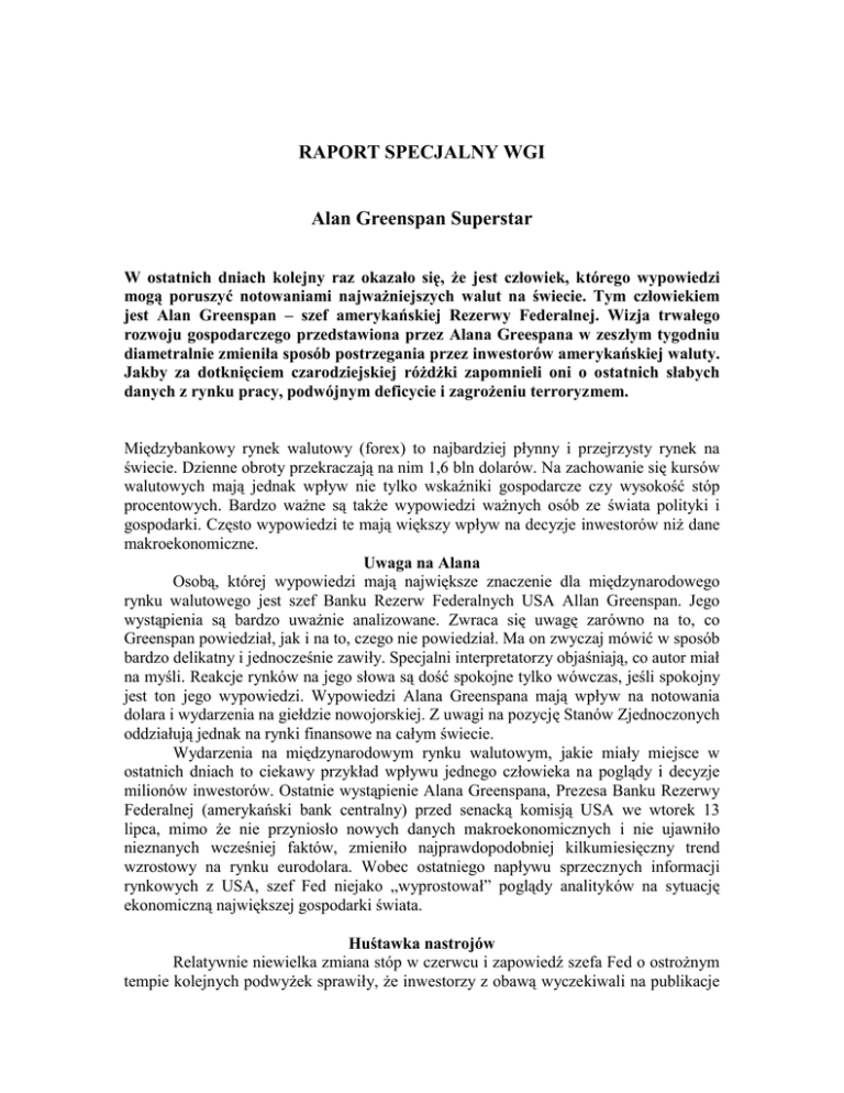 RAPORT SPECJALNY WGI Alan Greenspan Superstar W ostatnich dniach kolejny raz okazało się, że jest człowiek, którego wypowiedzi mogą poruszyć notowaniami najważniejszych walut na świecie. Tym człowiekiem jest Alan Greenspan – szef amerykańskiej Rezerwy Federalnej. Wizja trwałego rozwoju gospodarczego przedstawiona przez Alana Greespana w zeszłym tygodniu diametralnie zmieniła sposób postrzegania przez inwestorów amerykańskiej waluty. Jakby za dotknięciem czarodziejskiej różdżki zapomnieli oni o ostatnich słabych danych z rynku pracy, podwójnym deficycie i zagrożeniu terroryzmem. Międzybankowy rynek walutowy (forex) to najbardziej płynny i przejrzysty rynek na świecie. Dzienne obroty przekraczają na nim 1,6 bln dolarów. Na zachowanie się kursów walutowych mają jednak wpływ nie tylko wskaźniki gospodarcze czy wysokość stóp procentowych. Bardzo ważne są także wypowiedzi ważnych osób ze świata polityki i gospodarki. Często wypowiedzi te mają większy wpływ na decyzje inwestorów niż dane makroekonomiczne. Uwaga na Alana Osobą, której wypowiedzi mają największe znaczenie dla międzynarodowego rynku walutowego jest szef Banku Rezerw Federalnych USA Allan Greenspan. Jego wystąpienia są bardzo uważnie analizowane. Zwraca się uwagę zarówno na to, co Greenspan powiedział, jak i na to, czego nie powiedział. Ma on zwyczaj mówić w sposób bardzo delikatny i jednocześnie zawiły. Specjalni interpretatorzy objaśniają, co autor miał na myśli. Reakcje rynków na jego słowa są dość spokojne tylko wówczas, jeśli spokojny jest ton jego wypowiedzi. Wypowiedzi Alana Greenspana mają wpływ na notowania dolara i wydarzenia na giełdzie nowojorskiej. Z uwagi na pozycję Stanów Zjednoczonych oddziałują jednak na rynki finansowe na całym świecie. Wydarzenia na międzynarodowym rynku walutowym, jakie miały miejsce w ostatnich dniach to ciekawy przykład wpływu jednego człowieka na poglądy i decyzje milionów inwestorów. Ostatnie wystąpienie Alana Greenspana, Prezesa Banku Rezerwy Federalnej (amerykański bank centralny) przed senacką komisją USA we wtorek 13 lipca, mimo że nie przyniosło nowych danych makroekonomicznych i nie ujawniło nieznanych wcześniej faktów, zmieniło najprawdopodobniej kilkumiesięczny trend wzrostowy na rynku eurodolara. Wobec ostatniego napływu sprzecznych informacji rynkowych z USA, szef Fed niejako „wyprostował” poglądy analityków na sytuację ekonomiczną największej gospodarki świata. Huśtawka nastrojów Relatywnie niewielka zmiana stóp w czerwcu i zapowiedź szefa Fed o ostrożnym tempie kolejnych podwyżek sprawiły, że inwestorzy z obawą wyczekiwali na publikacje danych makroekonomicznych. Drugiego lipca Departament Pracy opublikował The Employment Report. Dane z rynku pracy rozczarowały inwestorów, którzy oczekiwali, że amerykańska gospodarka stworzyła w czerwcu 250 tys. miejsc pracy. Faktycznie powstało ich zaledwie 112 tys., wobec 235 tys. miesiąc wcześniej. Reakcja rynku była natychmiastowa. Dolar osłabił się o 125 pkt wobec jena (z 109,25 do 108,00) i o 190 pkt wobec euro (z 1,2150 na 1,2290). Analitycy odebrali tak słabe dane jako zapowiedź spowolnienia gospodarczego, a co się z tym wiąże wolniejszego tempa podwyżki stóp procentowych. Tydzień później na rynek napłynęły informacje o słabych wynikach sprzedaży detalicznej w USA. Największa sieć sklepów detalicznych Wall Mart zanotowała najniższą sprzedaż od roku. Jednocześnie wypowiedź amerykańskiego sekretarza bezpieczeństwa Toma Ridge’a, o możliwych atakach terrorystycznych ze strony Al Kaidy spowodowała pogłębienie spadków wartości dolara. Szalę goryczy przechyliły publikowane 16 lipca dane o poziomie inflacji w USA. Wskaźnik CPI wyniósł w czerwcu 0,3 proc. wobec 0,6 proc. miesiąc wcześniej. Inwestorzy odczytali to jako spadek tempa inflacji, co oznacza mniejsze szanse na podwyżkę stóp. Większość inwestorów ma negatywny stosunek do waluty amerykańskiej. Nie były go w stanie zmienić inne, pozytywne publikacje z amerykańskiego rynku. Deficyt obrotów bieżących zmniejszył się w maju do 45,95 mld USD wobec przewidywanych 48,30 mld. Philadelphia Fed – indeks obrazujący nastroje w gospodarce – wzrósł do poziomu 36,1 pkt wobec prognozowanych 25 pkt. Informacje te nie wpłynęły na notowania amerykańskiej waluty. Alan Greespan dokonał jednak tego, czego nie udało się zmienić danym statystycznym. Greenspan wkracza do akcji Po zakończeniu każdego półrocza szef Banku Rezerwy Federalnej składa sprawozdanie z wykonania polityki pieniężnej, przedkłada jednocześnie obraz aktualnej sytuacji gospodarczej kraju. We wtorek 20 lipca Alan Greespan wystąpił przed przedstawicielami Senatu, a następnego dnia przed komisją finansową parlamentu USA. W swoim wystąpieniu szef Fed przedstawił pozytywny obraz bieżącego stanu gospodarki amerykańskiej, która w ostatnim czasie wypracowała sobie solidne podstawy rozwoju i powinna rosnąć w tempie 5 proc. rocznie. Zapewnił jednocześnie, że nie należy się zbytnio przejmować ostatnimi danymi z rynku pracy, gdyż przedsiębiorstwa amerykańskie, aby sprostać rosnącej produkcji, będą musiały w najbliższym czasie zwiększyć zatrudnienie. Wzrastający popyt oraz wysokie ceny energii podnoszą presję inflacyjną. Aby nie dopuścić do dużego wzrostu inflacji Fed przygotowany jest na kolejne podwyżki stóp procentowych. Chociaż Alan Greespan zapewnił ponownie o rozsądnym tempie tych zmian, to całość wystąpienia zwolennicy wyższych stóp procentowych odebrali bardzo pozytywnie. Wizja trwałego rozwoju gospodarczego przedstawiona przez Alana Greespana od razu zmieniła sposób postrzegania przez inwestorów amerykańskiej waluty. Jakby za dotknięciem czarodziejskiej różdżki zapomnieli oni o niskim wskaźniku CPI, ostatnich słabych danych z rynku pracy, podwójnym deficycie i zagrożeni