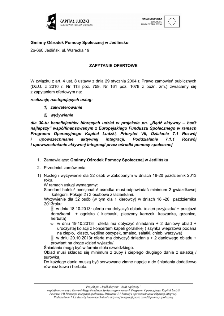 Gminny Ośrodek Pomocy Społecznej w Jedlińsku 26-660 Jedlińsk, ul. Warecka 19 ZAPYTANIE OFERTOWE W związku z art. 4 ust. 8 ustawy z dnia 29 stycznia 2004 r. Prawo zamówień publicznych (Dz.U. z 2010 r. Nr 113 poz. 759, Nr 161 poz. 1078 z późn. zm.) zwracamy się z zapytaniem ofertowym na: realizację następujących usług: 1) zakwaterowanie 2) wyżywienie dla 30-tu beneficjentów biorących udział w projekcie pn. „Bądź aktywny – bądź najlepszy” współfinansowanym z Europejskiego Funduszu Społecznego w ramach Programu Operacyjnego Kapitał Ludzki, Priorytet VII, Działanie 7.1 Rozwój i upowszechnianie aktywnej integracji, Poddziałanie 7.1.1 Rozwój i upowszechnianie aktywnej integracji przez ośrodki pomocy społecznej 1. Zamawiający: Gminny Ośrodek Pomocy Społecznej w Jedlińsku 2. Przedmiot zamówienia: 1) Nocleg i wyżywienie dla 32 osób w Zakopanym w dniach 18-20 październik 2013 roku. W ramach usługi wymagamy: Standard hotelu/ pensjonatu/ ośrodka musi odpowiadać minimum 2 gwiazdkowej kategorii. Pokoje 2 i 3 osobowe z łazienkami. Wyżywienie dla 32 osób (w tym dla 1 kierowcy) w dniach 18 -20 października 2013roku: • w dniu 18.10.2013r oferta ma dotyczyć obiadu /dzień przyjazdu/ + przejazd dorożkami + ognisko ( kiełbaski, pieczony karczek, kaszanka, grzaniec, herbata) • w dniu 19.10.2013r oferta ma dotyczyć śniadania + 2 daniowy obiad + uroczystej kolacji z koncertem kapeli góralskiej ( szynka wieprzowa podana na ciepło, ciasto, wędlina oscypek, smalec, sałatki, chleb, warzywa) • w dniu 20.10.2013r oferta ma dotyczyć śniadania + 2 daniowego obiadu + prowiant na drogę /dzień wyjazdu/. Śniadania mogą być w formie stołu szwedzkiego. Obiad musi składać się minimum z zupy i ciepłego drugiego dania z sałatką / surówką. Do każdego dania muszą być serwowane zimne napoje a do śniadania dodatkowo również kawa i herbata. Projekt pn. „Bądź aktywny – bądź najlepszy” współfinansowany z Europejskiego Funduszu Społecznego w ramach Programu Operacyjnego Kapitał Ludzki Priorytet VII Promocja integracji społecznej, Działanie 7.1 Rozwój i upowszechnianie aktywnej integracji Poddziałanie 7.1.1 Rozwój i upowszechnianie aktywnej integracji przez ośrodki pomocy społecznej Wszystkie posiłki muszą być posiłkami pełnowartościowymi, zgodnie z technologią żywienia człowieka. Na życzenie Zamawiającego Wykonawca zapewni posiłki wegetariańskie lub inne wymagania uczestników (np. dieta bezglutenowa). Godziny wszystkich posiłków muszą być ustalone w uzgodnieniu z Zamawiającym, i dostosowane do godzin zajęć uczestników projektu. Kod usługi CPV 55000000-0 Usługi hotelarskie, restauracyjne i handlu detalicznego. Poniżej podajemy planowany program warsztatów: Dzień pierwszy: Rozpocznie się przyjazdem do Zakopanego o godzinie 13.00 13.30 obiad 14.00 -20.00 warsztaty szkoleniowe 20.00 przejazd dorożkami + ognisko Dzień drugi: 8.00 śniadanie 8.30 –13.00 Spływ Dunajcem 13.30– obiad 14.00 – 20.00 warsztaty szkoleniowe 20.00 - uroczysta kolacja z koncertem kapeli góralskiej Dzień trzeci: do 8.00 śniadanie 8.30 – 10.30 przejazd koleją linowo-terenową Gubałówka, zwiedzanie okolic Krupówek 11.00 – 14.00 warsztaty szkoleniowe 14.00 – obiad 15.00 wyjazd do Jedlińska. 3. Cena jest jedynym kryterium oceny ofert. Powinna ona obejmować wszelkie koszty, jakie poniesie Wykonawca przy realizacji zamówienia. Wykonawca zobowiązany jest do podania całkowitej ceny zamówienia z dokładnością do dwóch miejsc po przecinku, wyrażonej cyfrowo i słownie w złotych polskich. 4. Sposób uzyskania informacji dotyczących przedmiotu zamówienia: Szczegółowe informacje dotyczące przedmiotu zamówienia można uzyskać osobiście w siedzibie zamawiającego – Gminny Ośrodek Pomocy Społecznej w Jedlińsku, ul. Warecka 19, pok. nr 11B, telefonicznie pod numerem tel. 048 321 31 27. Pracownikami uprawnionymi do kontaktów z wykonawcami są: Kierownik GOPS w Jedlińsku – Zuzanna Pudzianowska. 5. Miejsce i termin składania ofert: Oferty (wg wzoru stanowiącego załącznik nr 1) należy składać w terminie do dnia 9 października 2013 r. do godz. 15.00 w formie: a. osobiście w siedzibie Gminnego Ośrodka Pomocy Społecznej w Jedlińsku, 26660 Jedlińsk, ul. Warecka 19, pokój 14, b. meilem na adres: [email protected], c. faxem na nr (048) 321 31 27 Projekt pn. „Bądź aktywny – bądź najlepszy” współfinansowany z Europejskiego Funduszu Społecznego w ramach Programu Operacyjnego Kapitał Ludzki Priorytet VII Promocja integracji społecznej, Działanie 7.1 Rozwój i upowszechnianie aktywnej integracji Poddziałanie 7.1.1 Rozwój i upowszechnianie aktywnej integracji przez ośrodki pomocy społecznej 6. Istotne warunki umowy: 1. Jeżeli Zamawiający dokona wyboru najkorzystniejszej oferty, umowa w sprawie realizacji Zamówienia zostanie zawarta z Wykonawcą, który spełnia wszystkie postanowienia i wymagania zawarte w zapytaniu ofertowym. 2. Umowa zostanie zawarta w formie pisemnej. O miejscu i terminie podpisania umowy Zamawiający zawiadomi wyłonionego Wykonawcę. 3. Płatność zostanie dokonana przelewem na rachunek bankowy wskazany przez Wykonawcę. 7. Wyjaśnienia i modyfikacje zapytania ofertowego: 1. Przed upływem terminu składania ofert Zamawiający może zmodyfikować treść zapytania ofertowego. Jeżeli zmiany będą miały wpływ na treść składanych w postępowaniu ofert, Zamawiający przedłuży termin składania ofert. 2. Zamawiający zastrzega sobie prawo do unieważnienia niniejszego postępowania bez podania uzasadnienia, a także do pozostawienia postępowania bez wyboru oferty 8. Informacje o terminie i miejscu podpisania umowy: informacja o terminie i miejscu podpisania umowy zostanie przekazana telefonicznie wykonawcy, którego ofertę wybrano. Jedlińsk, dnia 25 wrzesień 2013 r. …………………………………. podpis Projekt pn. „Bądź aktywny – bą