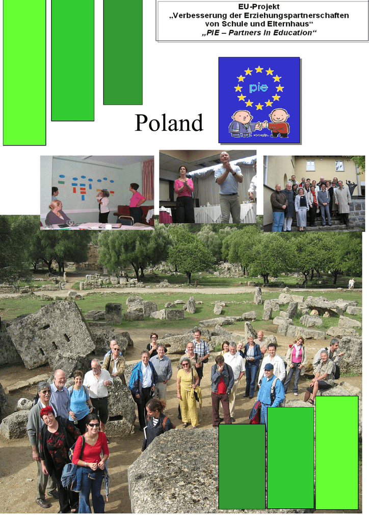 1 Poland 2 Broszura dotycząca europejskiego programu doskonalenia PIE - Partners in Education Spis treści: Przedmowa 1. Wstęp 1.1 Struktura 1.2 Podręcznik dla czytelnika i użytkownika 1.3 E-Learning 2. Część ogólna 2.1 Historia projektu 2.2 Naukowe podstawy zapobiegania agresji 2.2.1 Inny sposób postrzegania problemu przemocy 2.2.2 Zagrożenia wynikające z poczucia braku bezpieczeństwa 2.3 Szkoła / dom rodzinny – sytuacja w poszczególnych krajach 2.3.1 Cele EPA 2.3.2 Zadania i możliwości współpracy EPA 2.4 Kierunki koncepcji doskonalenia w krajach partnerskich – konsensus europejski 2.4.1 Aktualna sytuacja 2.4.2 określenie celów i plan działania 2.4.2.1 Respekt 2.4.2.2 Profesjonalizm 2.4.2.3 Tolerancja 2.4.2.4 Odpowiedzialność 2.5 Podstawowe założenia doskonalenia i rozwoju szkół 3. Programy poszczególnych krajów 3.1 Dania 3.1.1 Sytuacja wyjściowa 3.1.2 Program doskonalenia 3.1.3 Ewaluacja 3.2 Francja 3.2.1 Sytuacja wyjściowa 3.2.2 Program doskonalenia 3.2.3 Ewaluacja 3.3 Grecja 3.3.1 Sytuacja wyjściowa 3.3.2 Program doskonalenia 3.3.3 Ewaluacja 3 3.4 Polska 3.4.1 Sytuacja wyjściowa 3.4.2 Program doskonalenia 3.4.3 Ewaluacja 3.5 Niemcy 3.5.1 Sytuacja wyjściowa 3.5.2 Program doskonalenia 3.5.3 Ewaluacja 3.5.3.1 Ewaluacja I 3.5.3.2 Ewaluacja II 4. Wnioski końcowe / Perspektywy 4.1 Konsensus Europejski 4.2 Mocne strony krajów partnerskich w programach szkoleń 4.3 Wykorzystanie specyficznych doświadczeń zawartych w programach poszczególnych krajów 4.4 Wyniki 4.5 Wyniki i praktyka 4.6 Perspektywy Przedmowa Europejski projekt PIE przy pomocy programów doskonalenia i nowoczesnych mediów daje możliwość znalezienia rozwiązań, które mogą przyczynić się do poprawy relacji między szkołą i domem rodzinnym. Interkulturowe spojrzenie na kraje partnerskie - Danię, Francję, Grecję, Niemcy i Polskę otwiera perspektywy istotne dla pracy w szkole. Pomysł stworzenia projektu dotyczącego relacji szkoła – dom rodzinny zrodził się podczas wizyty studyjnej dla europejskiej kadry zarządzającej oświatą (Arion) w Wetzlar, na temat zapobiegania przemocy. Stwierdzono, że w ramach dotychczasowych projektów innowacyjnych dotyczących prewencji, zaniedbywano nie tylko aspekt interkulturowy, lecz również znaczenie współpracy z rodzicami. Wnioskodawcy obrali sobie za cel znalezienie rozwiązań mających poprawić tę sytuację. 1. Wstęp 1.1 Struktura Zmierzając do opracowania wspólnego programu doskonalenia na temat szkoła – dom rodzinny określone zostały w poszczególnych krajach różne uwarunkowania kontekstowe: 4 Dania: Współpraca z rodzicami w Danii ma długa tradycję i wysoką rangę, co wzmacnia potencjał osobowy uczniów i wpływa na przeciwwagę dla działań przemocowych. Francja: We Francji zaobserwowano, że uczniowie we własnej grupie – tzn. bez sieci zewnętrznej, również bez pomocy rodziców – próbowali uporać się ze zjawiskiem przemocy. Wzrastający problem przemocy na osiedlach „blokowiskach” – wzmacniany jeszcze przez problemy z emigrantami – ukazuje niedoskonałość stosowanych rozwiązań. Grecja: W szkołach greckich coraz częściej dochodzi się do wniosku, że współpraca z rodzicami ma ogromne znaczenie, gdyż także tutaj obserwuje się wzrost zjawisk przemocowych. Ponieważ współpraca ta rozwija się w różny sposób w poszczególnych częściach kraju, szkoły wykazują duże zainteresowanie koncepcjami sprawdzonymi w praktyce. Polska: Kraj ten ma za sobą wielkie społeczne przemiany. Autorytarno – strukturalna dotąd szkoła zmienia się zgodnie z zasadą przejmowania odpowiedzialności za siebie w instytucję bardziej demokratyczną i współdecydującą. Sytuacje przemocy w Polsce przedstawiają się różnorodnie. Polska próbuje obecnie, w aspekcie odpowiedzialności za siebie, pozyskać rodziców dla spraw szkoły. Są oni coraz bardziej zaangażowani w życie szkoły, co nie pozostało bez wpływu na wyraźną poprawę wyników (Badania Pisa). Niemcy: Wsparcie udzielane dzieciom niedostosowanym społecznie lub dzieciom trudnym jest w Niemczech niewystarczające. (Badania Pisa). Obok rozwoju szkół całodziennych, który nie przebiega w oczekiwanym tempie, dużego znaczenia nabiera współpraca miedzy szkołą a domem rodzinnym. Współpraca ta układa się lepiej w szkołach podstawowych i gimnazjach*: w szkołach ponadpodstawowych (Hauptschule, Realschule, Gesamtschule) jest ona nadal niewystarczająca. * gimnazjum w Niemczech odpowiada polskiemu liceum Rzeczą jasną jest, że programy szkoleniowe muszą odpowiadać potrzebom poszczególnych krajów, by w mogły w praktyce przynieść jakiekolwiek zmiany. Aby stworzyć konsensus europejski, wszyscy partnerzy przyjęli propozycje przedstawione w Patras (patrz: rozdział 2.4). Główną rolę odgrywają tu takie pojęcia jak: respekt, profesjonalizm, tolerancja i odpowiedzialność. Są to hasła przewodnie w programach poszczególnych krajów. Każdy z krajów opracował ponadto aspekty dotyczące następujących obszarów: 5 1. Określenie sytuacji wyjściowej: szkoła – dom rodzinny 2. Uwrażliwienie, kształtowanie świadomości, informacja o zależnościach, informacja o społeczności szkolnej 3. Kwalifikacje, doskonalenie, trening 4. Przykłady dobrej praktyki, tworzenie projektów, rozwój szkół 5. Budowa i korzystanie z sieci informacyjnej Istotę planowanego szkolenia stanowi długotrwały proces zmian we współpracy szkoły i domu rodzinnego. Poprawa relacji szkoła – dom rodzinny zorientowana początkowo jedynie na zapobieganie przemocy wykazuje dużo szersze działanie w takich obszarach jak: - profilaktyka w zakresie używania narkotyków, - zapobieganie lękowi szkolnemu i unikaniu szkoły, - zmniejszenie różnic w zakresie osiągnięć i zachowania uczniów - rozwój szkoły wspierającej działania prozdrowotne, - wzmacnianie poczucia własnej wartości uczennic i uczniów 1.2. Podręcznik dla c
